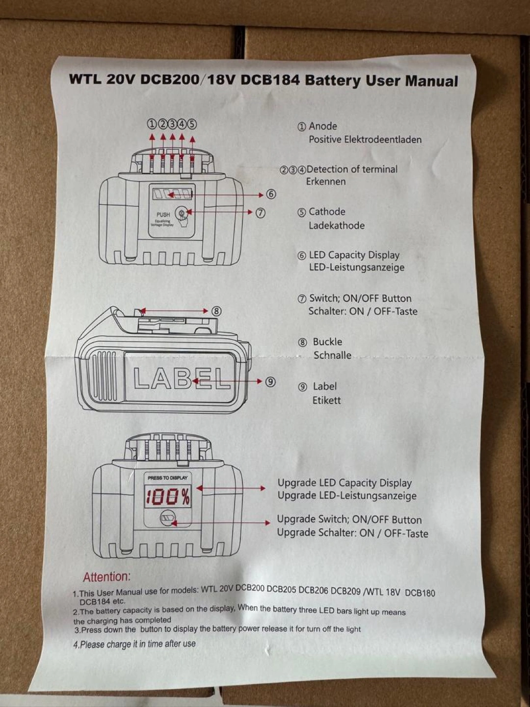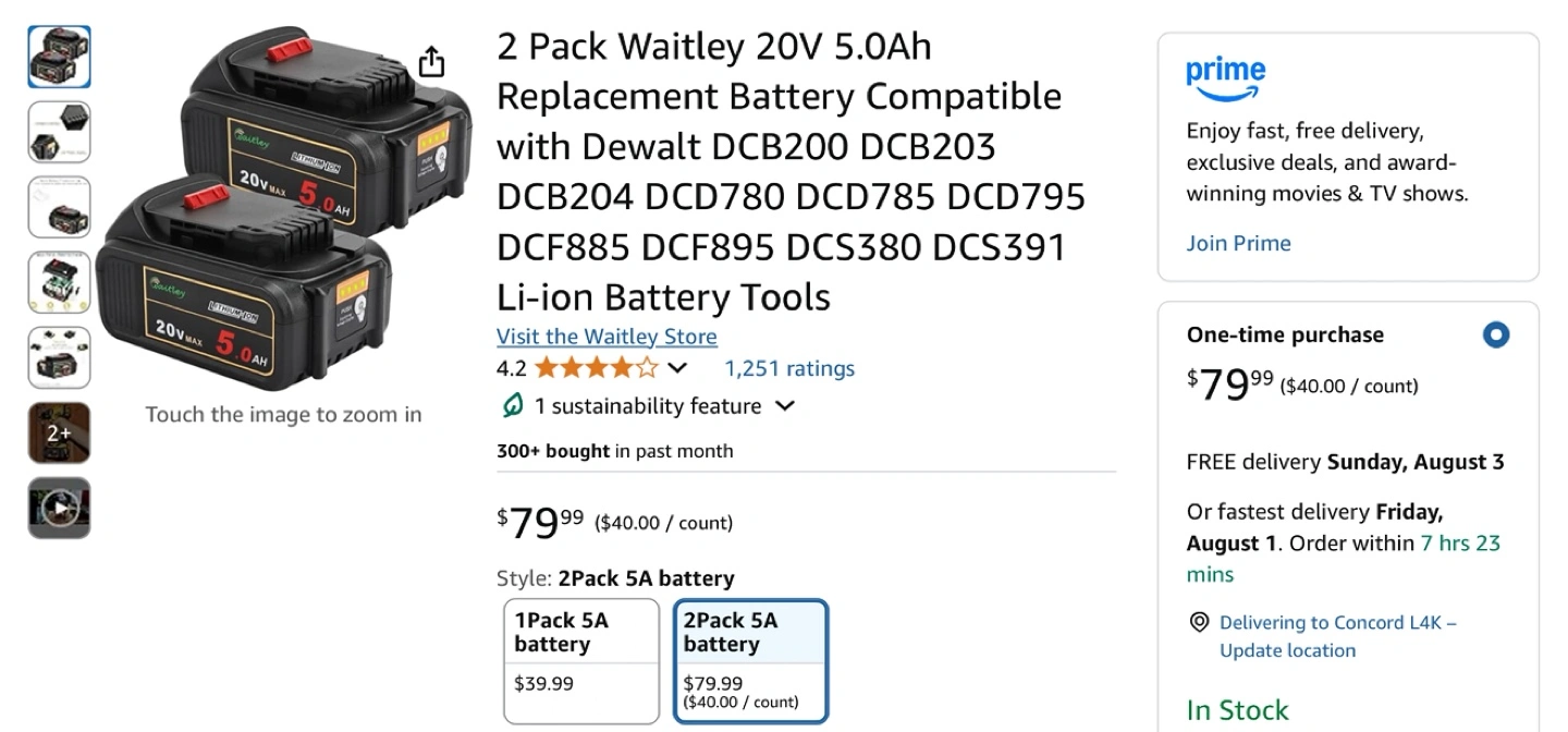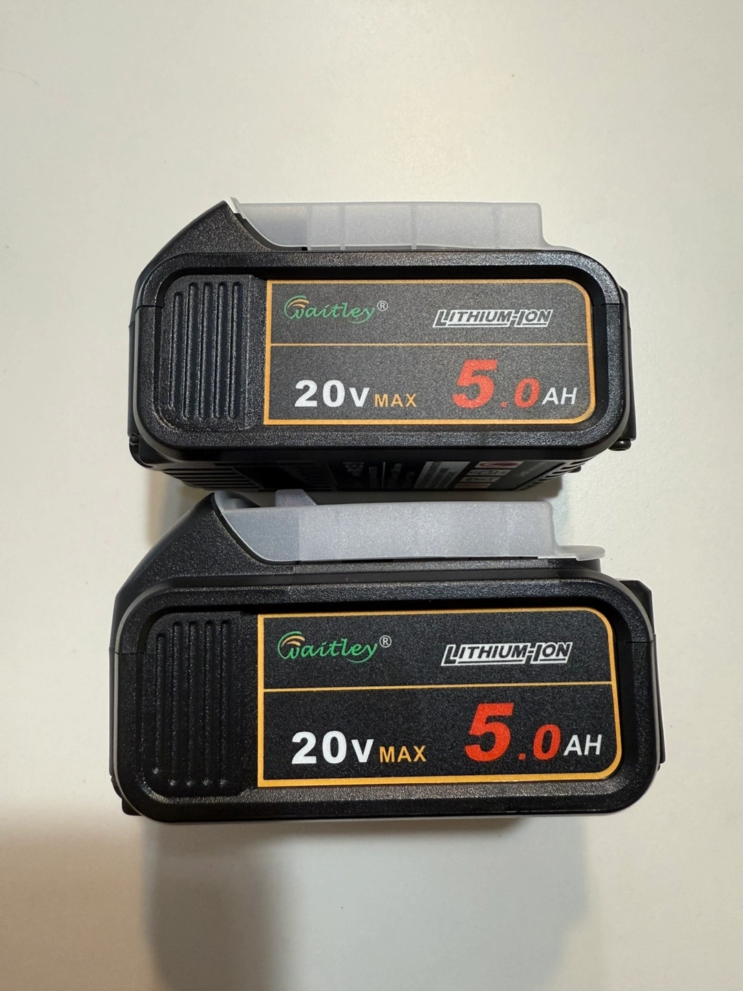 Price of one battery : $35 Price of two batteries: $60 Selling a 2-pack of Waitley 20V 5.0Ah replacement batteries. They are compatible with Dewalt DCB200, DCB203, DCB204, DCD780, DCD785, DCD795, DCF885, DCF895, DCS380, and DCS391 Li-ion battery tools. Retails for $79.99