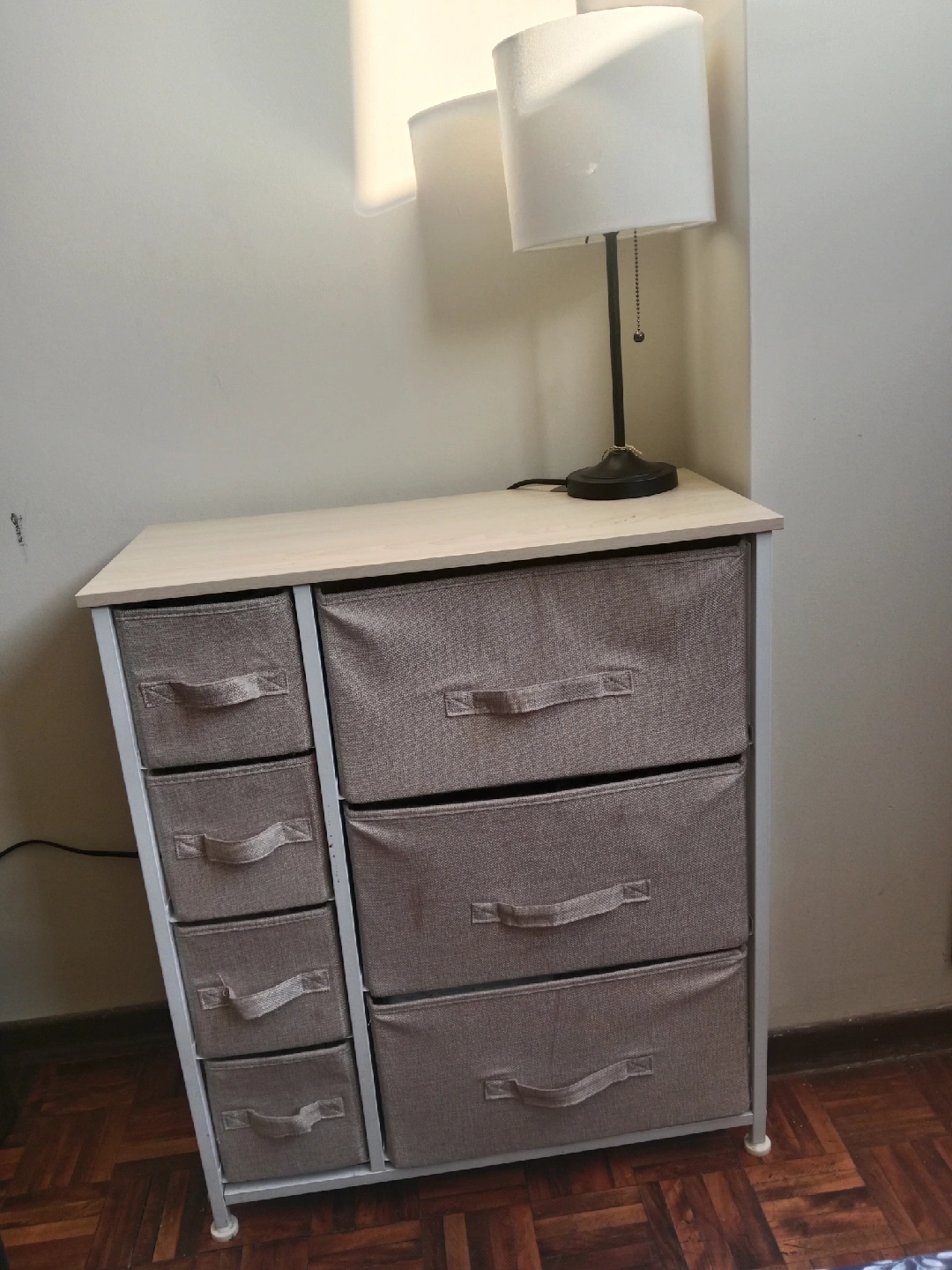 Looking to declutter? This dresser features six drawers with fabric bins, perfect for organizing clothes or accessories. The neutral colour blends well with any decor. It's in great condition and ready for a new home!