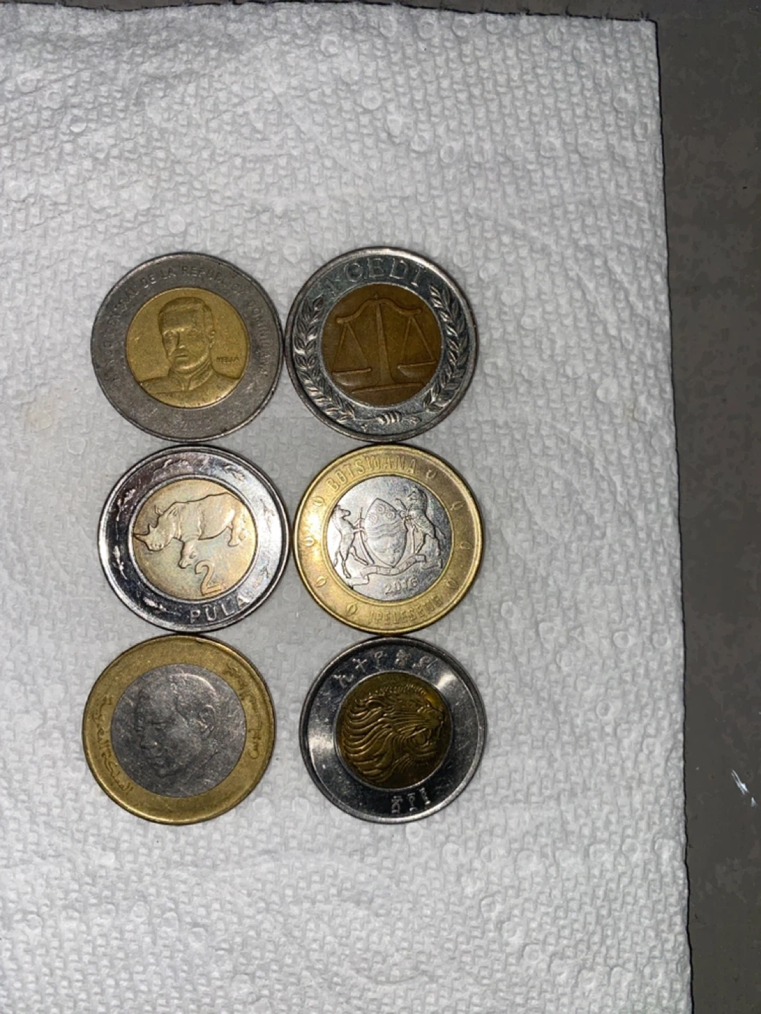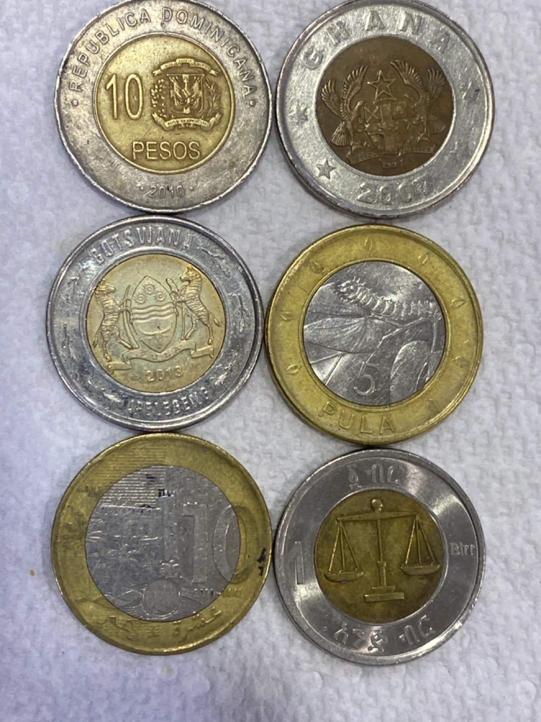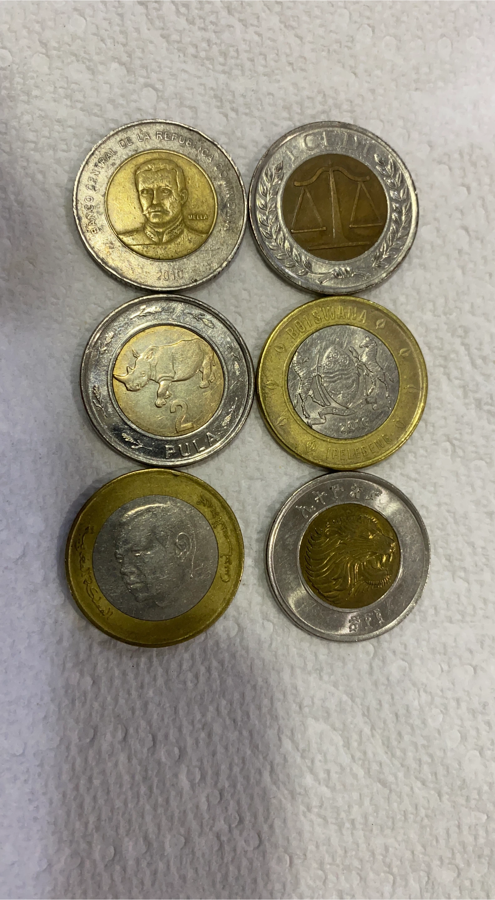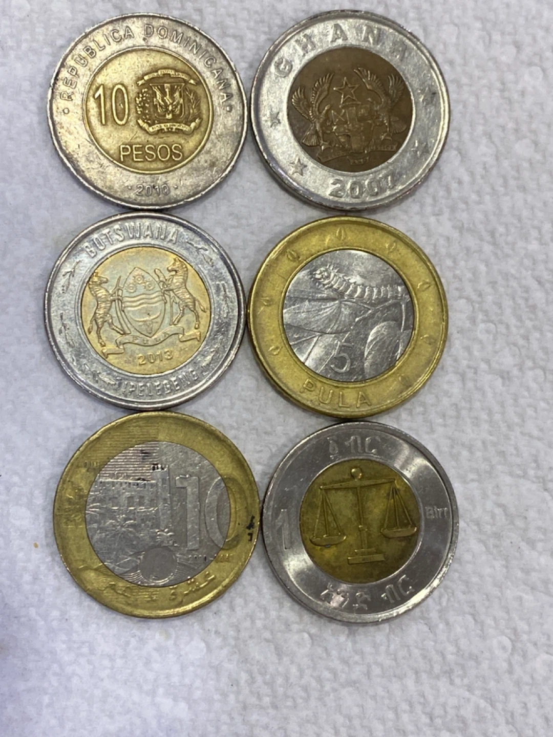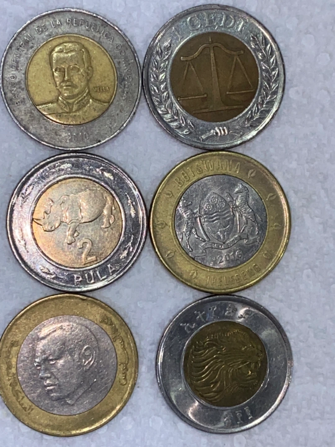 A collection of foreign currency coins, including coins from Banco Central De La Republica Dominica, Botswana, and other countries. They feature various designs and emblems from their respective nations.