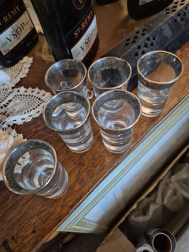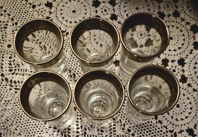 These are a set of six vintage gold rimmed glasses, perfect for adding a touch of elegance to any occasion, each featuring a sleek design and in excellent condition, ready to enhance your dining experience. These glasses are in great shape. * Set of six * Gold rimmed design * Vintage