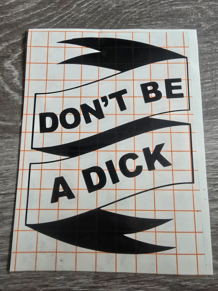 black, 6 inch tall "Don't Be A Dick" decal made with high quality permanent vinyl. can be made in a variety of colours, and any size up to 12 inches