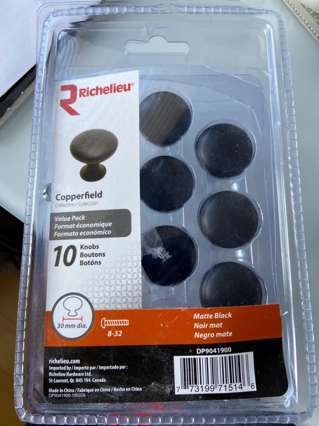6 matte black cabinet knobs. Brand new Includes screws Copperfield Collection. I only needed 4 for my bathroom vanity therefore selling the rest.