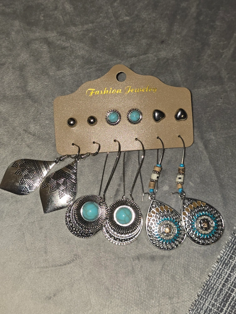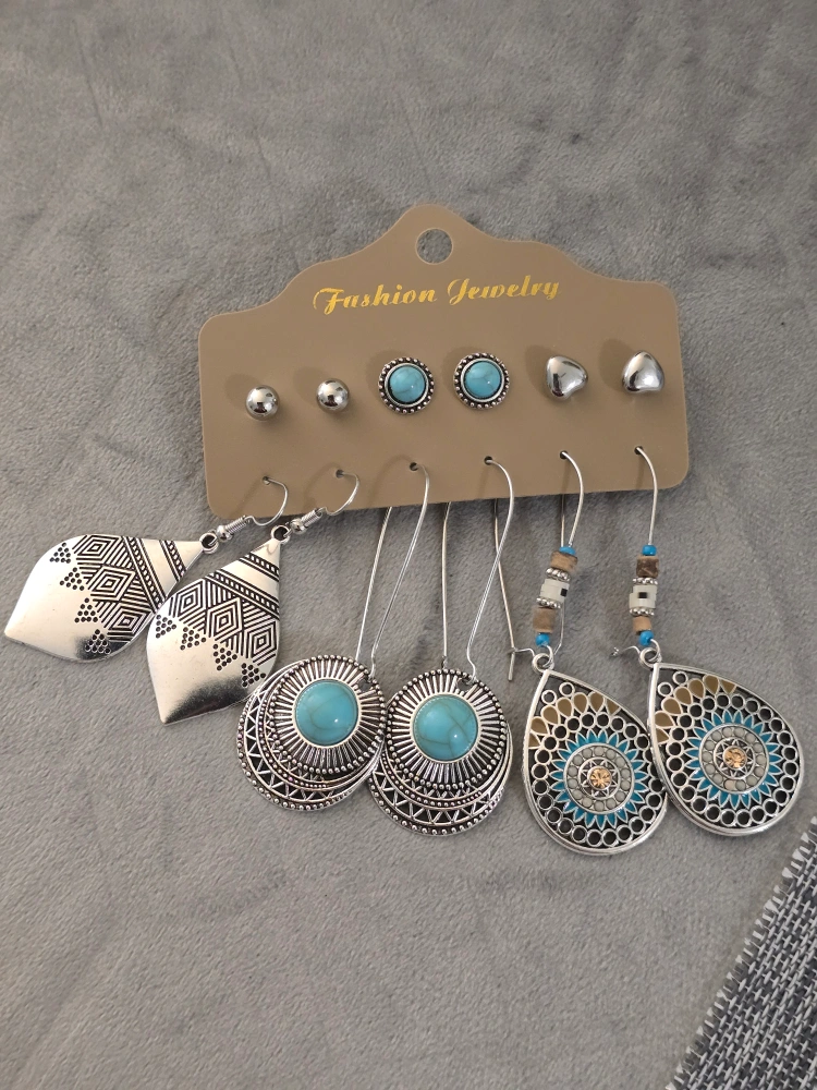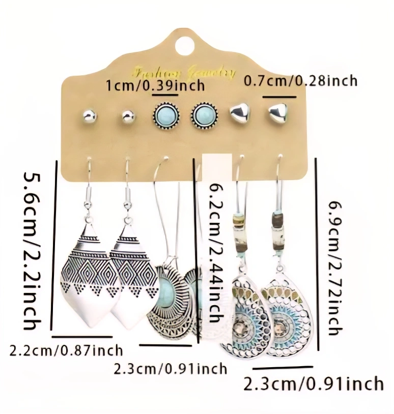 Accessorize with this cute earring set! It includes six pairs of earrings in different styles. The set features silver-tone earrings with turquoise accents, adding a touch of boho chic to any outfit. The earrings vary in size, with the longest pair measuring approximately 6.9cm/2.72 inches