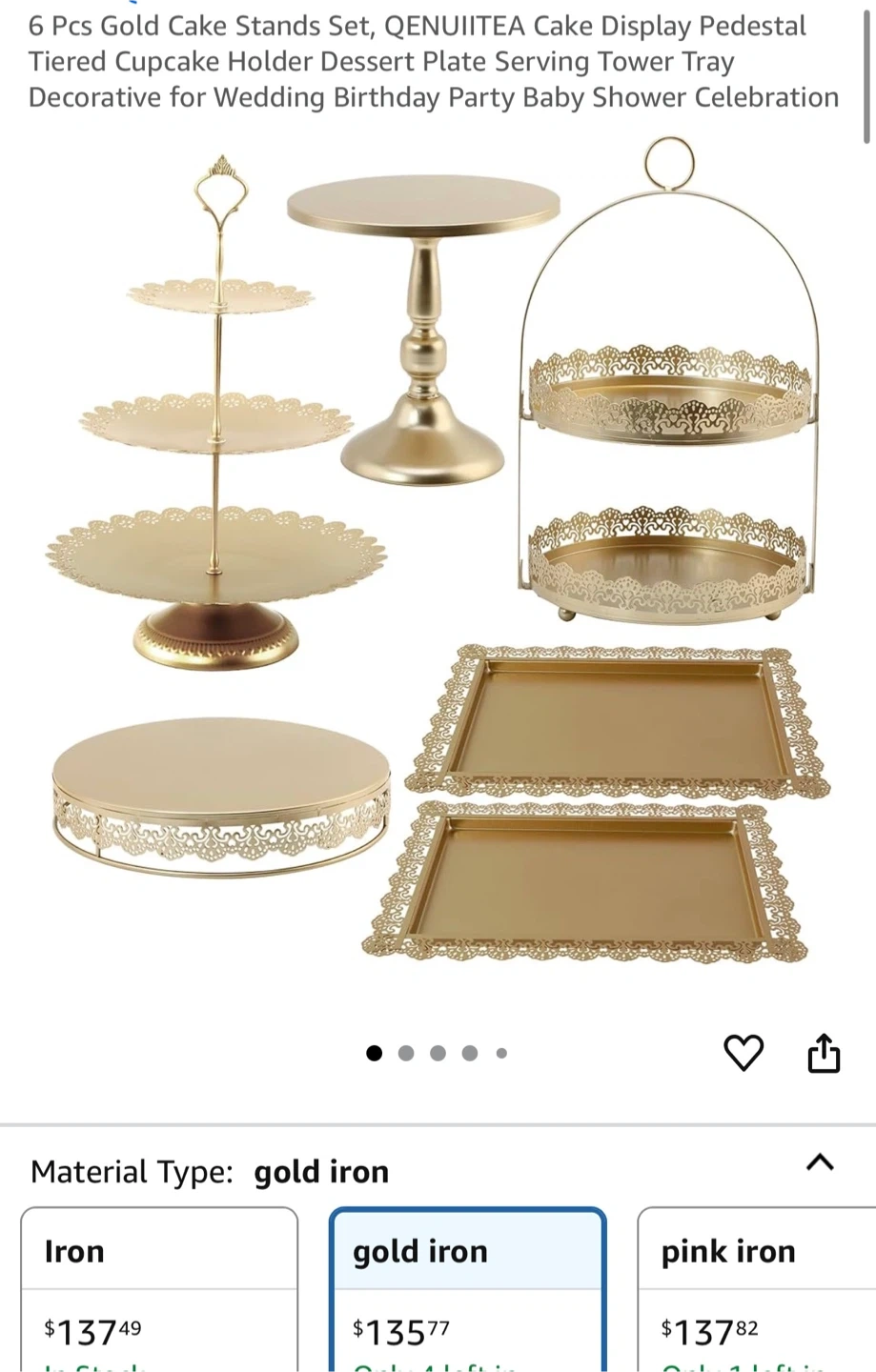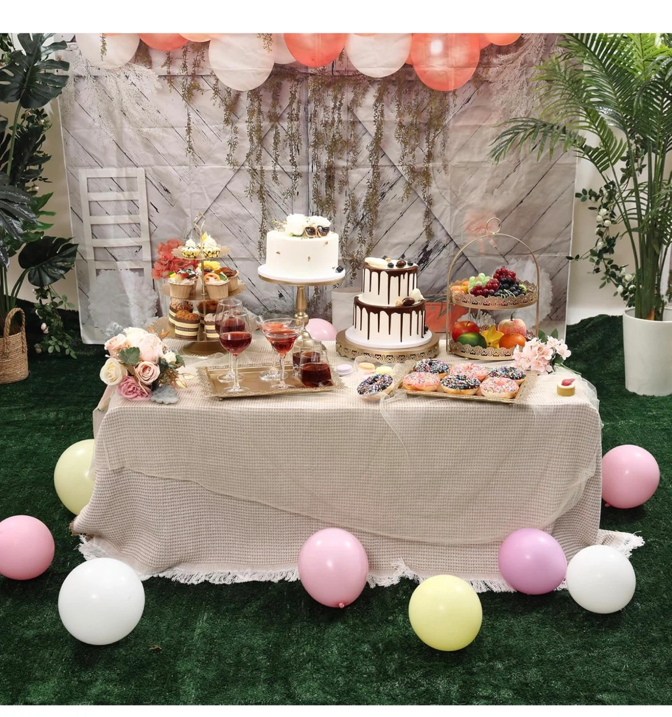 6 pieces cake stand set: 1* 3-layer cupcake tower (12in, 10in, 7in), 1* 2-tier cupcake holder( 10in), 1* cake stand with base(10in), 1* round cake pedestal(12in), 2* rectangular serving tray(14.5in*12in); MULTIPURPOSE: The cake display set has 5 different style designs, suitable for all kinds of desserts at the party, fit for displaying cake, cupcakes, candy, muffins, pastries, cookies, biscuit or other delicious dishes! SAFETY MATERIAL: Our cake display set is made of durable high quality iron metal, crafted in a food-safe baking painted finish, stable base and secure use. And very easy to install, totally reusable and wash easily, we also have installation video; MULTI-OCASSIONS: Multicolor dessert display table set is perfect for tea weddings engagement reception, anniversary, birthday parties, baby showers, bakeries, graduations ceremonies, Christmas, thanksgiving gift or home decor, beautifully decorated in any dining room or living room! HANDCRAFTED: It is a handmade cake stands, for welding and painting processes, can't be perfect. If there is a problem with the product received, please contact me, I will try our best to improve the product and bring a better shopping experience to the customer.