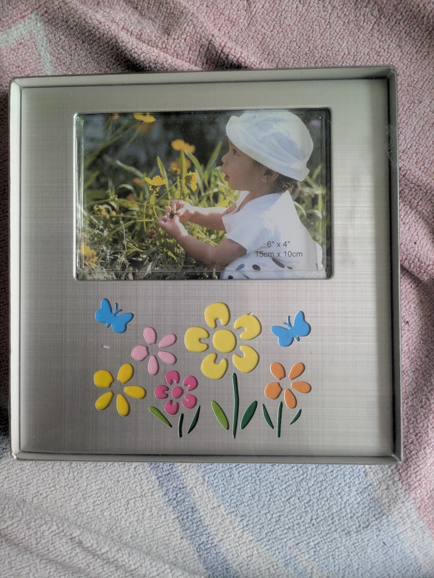 A cute silver picture frame perfect for displaying your favourite memories! It holds a 6" x 4" photo and features a colourful floral and butterfly design on the front