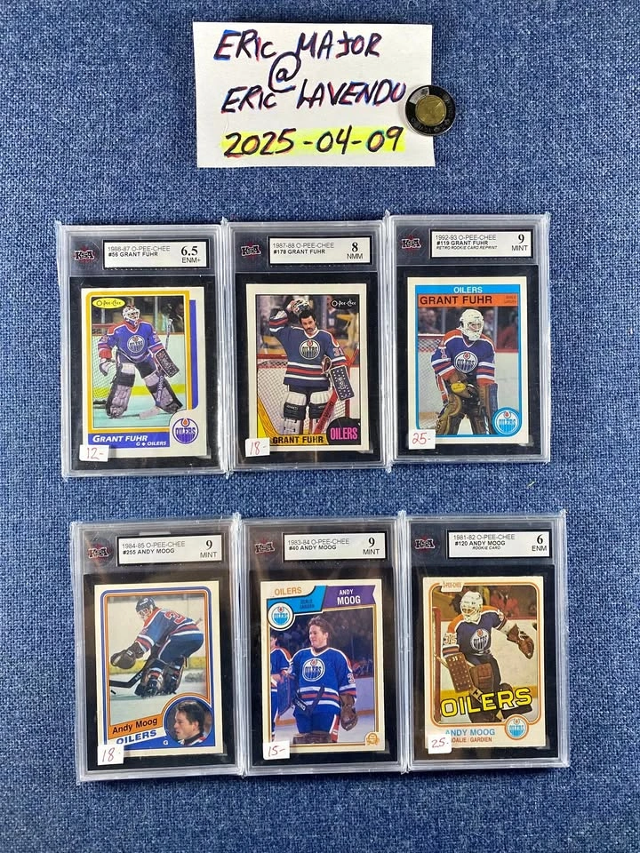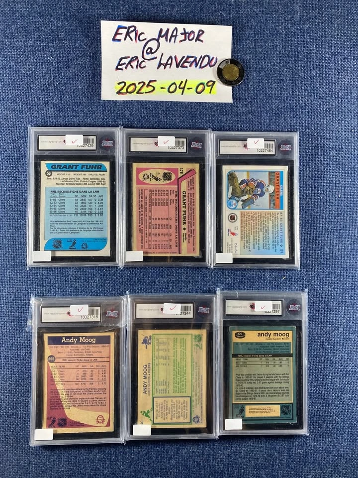 6 X Graded Cards of Andy Moog & Grant Fuhr Better Pictures are Available... I am in Etobicoke...Rexdale & 401 So Much more for sale... Please check my other listings... i have all of these available... -Graded & Raw Cards Various Players -Graded & Raw Cards Young Guns -Auto's and Numbered Cards -Sport Cards Sets -Wax Era Sealed Boxes -Non Sport Sets -McDonald / Tim Horton's Cards -Cards Accessories (Penny sleeves-sheets-Boxes) -Beckett Books -Official Guide & Record Books -Sports Wall Decor -Chandelier-Table Lamps -Arts and Oil Paintings -Watches of all prices and Quality Please send me a message if there anything you are looking for... Will Make a better price the more you buy... Thank you