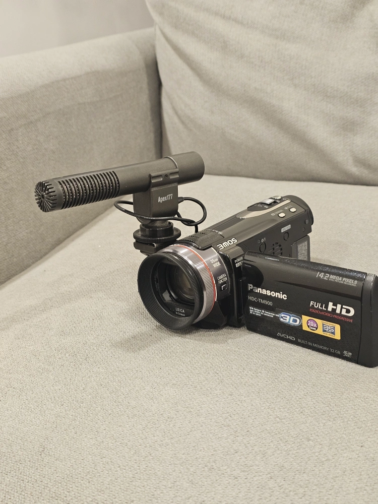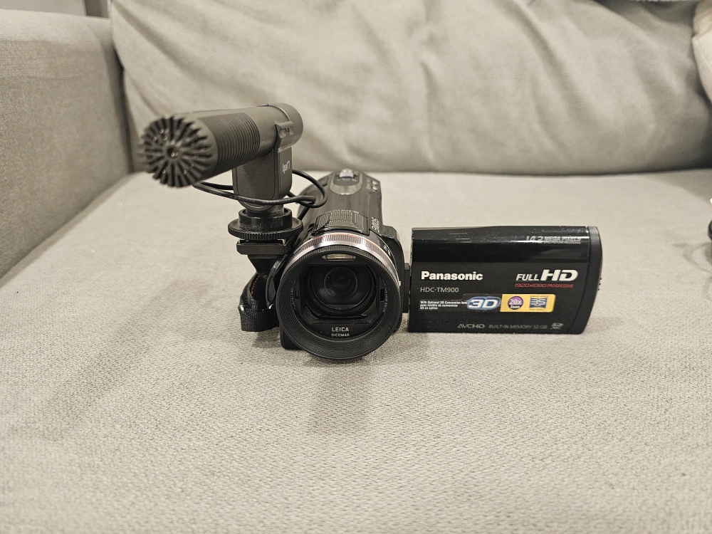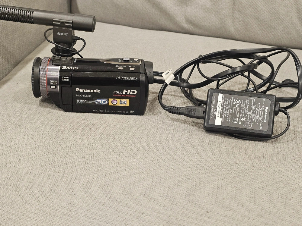 Selling a Panasonic HDC-TM900 Full HD 3D camcorder. It comes with a microphone and charger. The camcorder records in full HD and also supports 3D recording. It has a 14.2-megapixel sensor and 32GB of internal memory. CHECK MY OTHER LISTING TOO