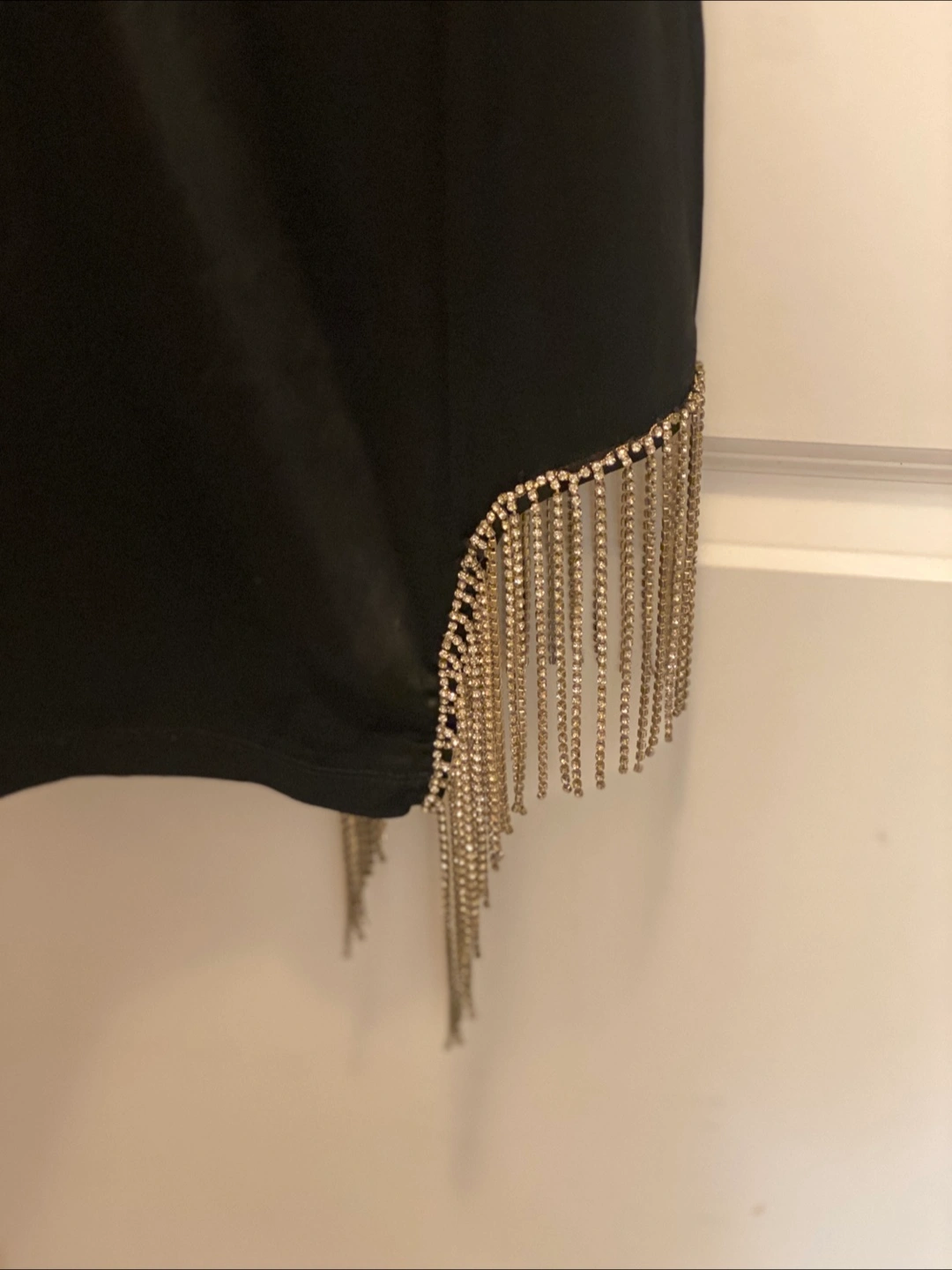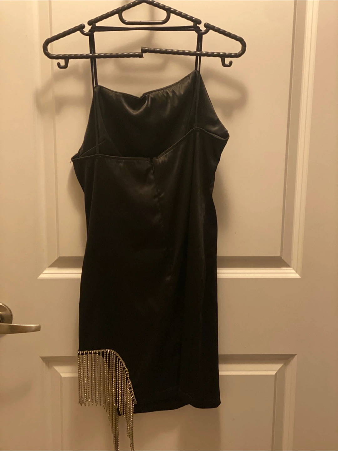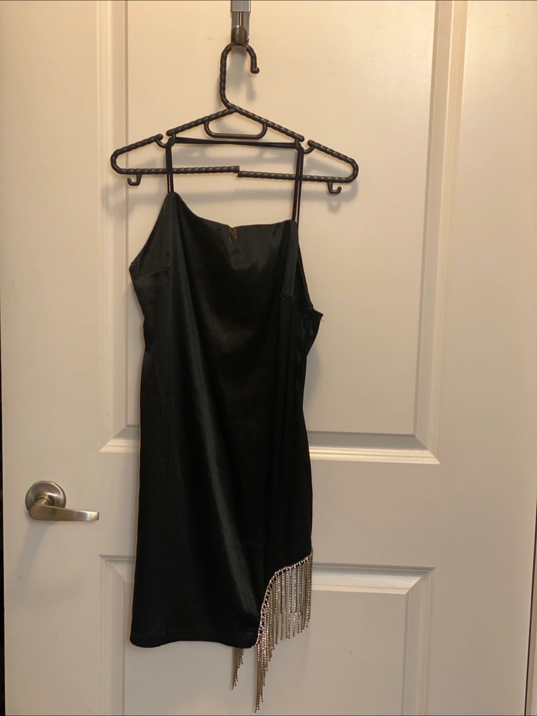 Selling a cute black mini dress! It has rhinestone fringe detail on one side. Perfect for a night out!