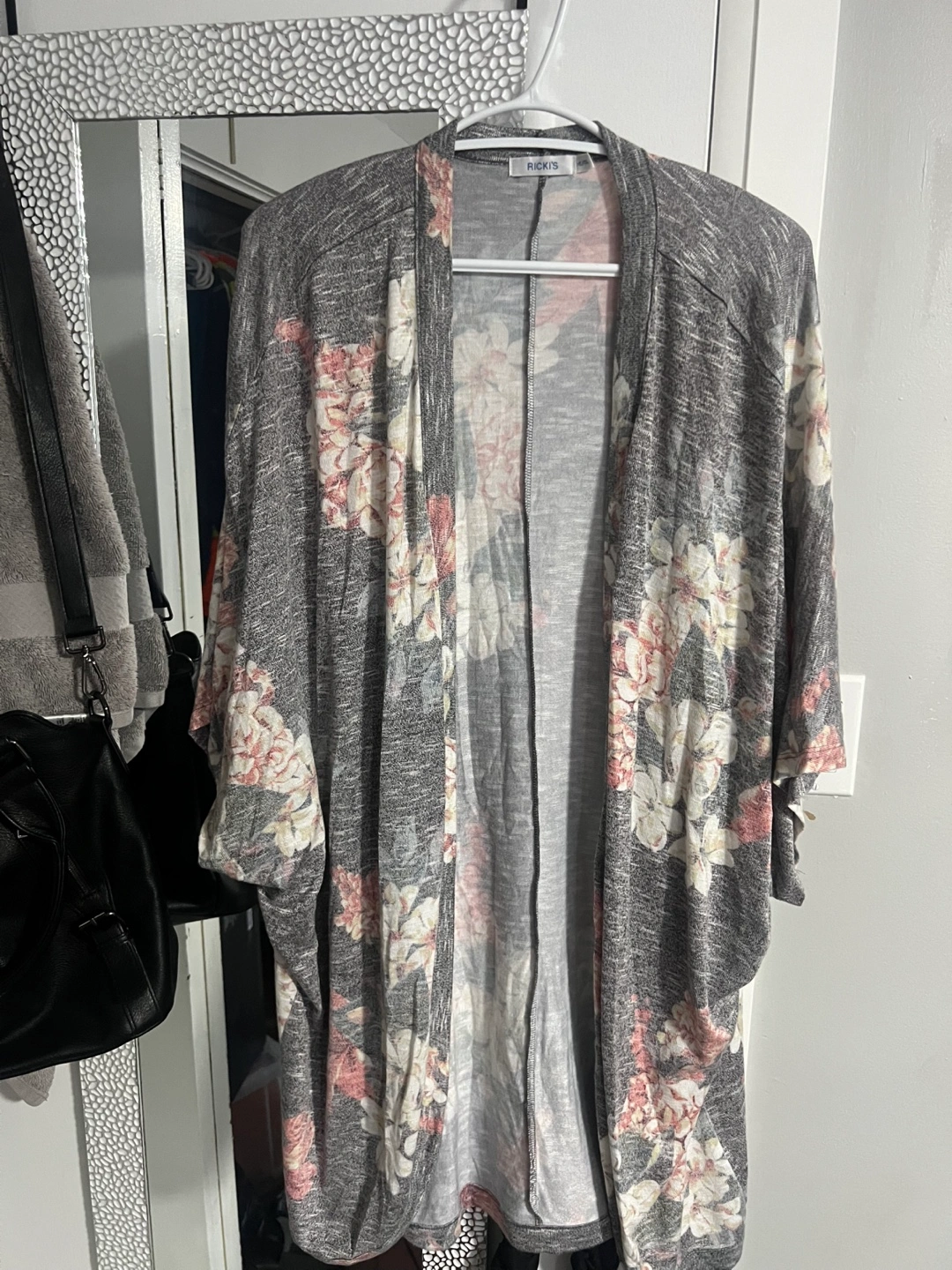 Selling a Ricki's kimono in size XL. It has a lovely floral pattern on a grey background. Perfect for layering!