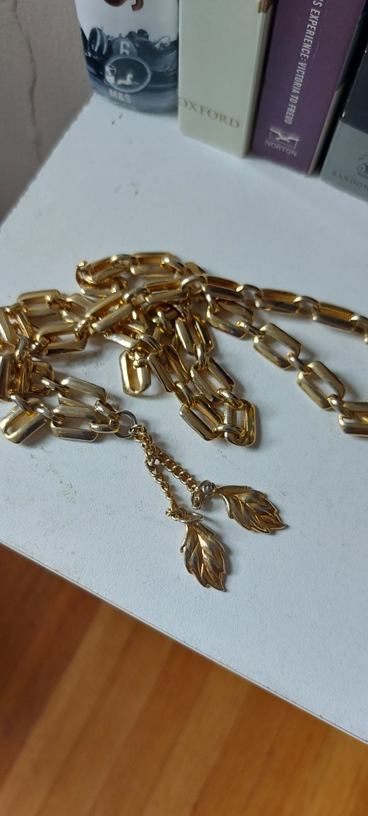 Selling a gold-tone necklace featuring a unique chain link design and delicate leaf details. It's a lovely piece to add a touch of elegance to any outfit!