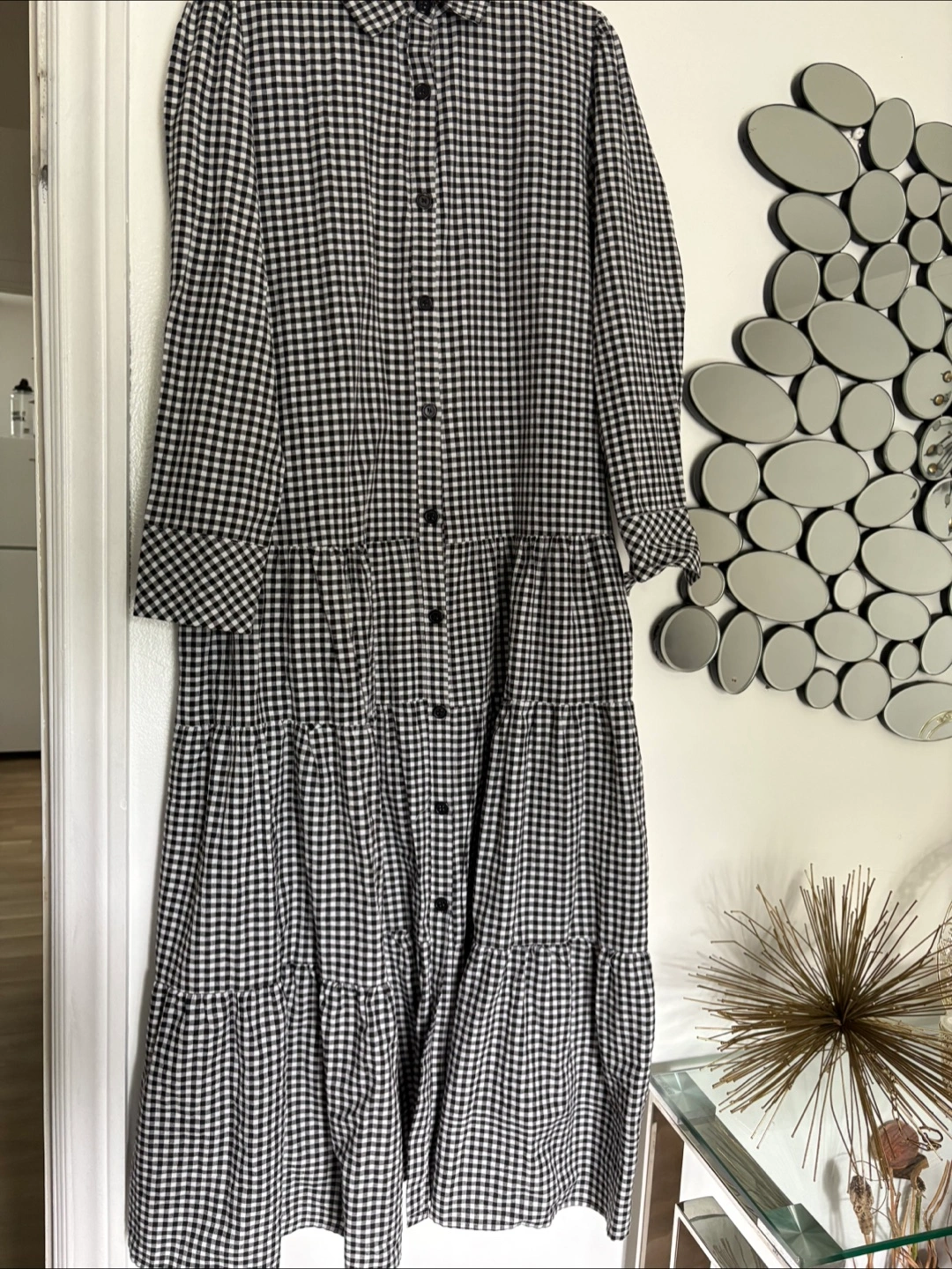 Selling a Vonda gingham maxi dress in size XL! It's in great condition and features a classic black and white checkered pattern. Perfect for a casual day out or dressed up for an evening event. The tiered design adds a touch of flair to this stylish piece