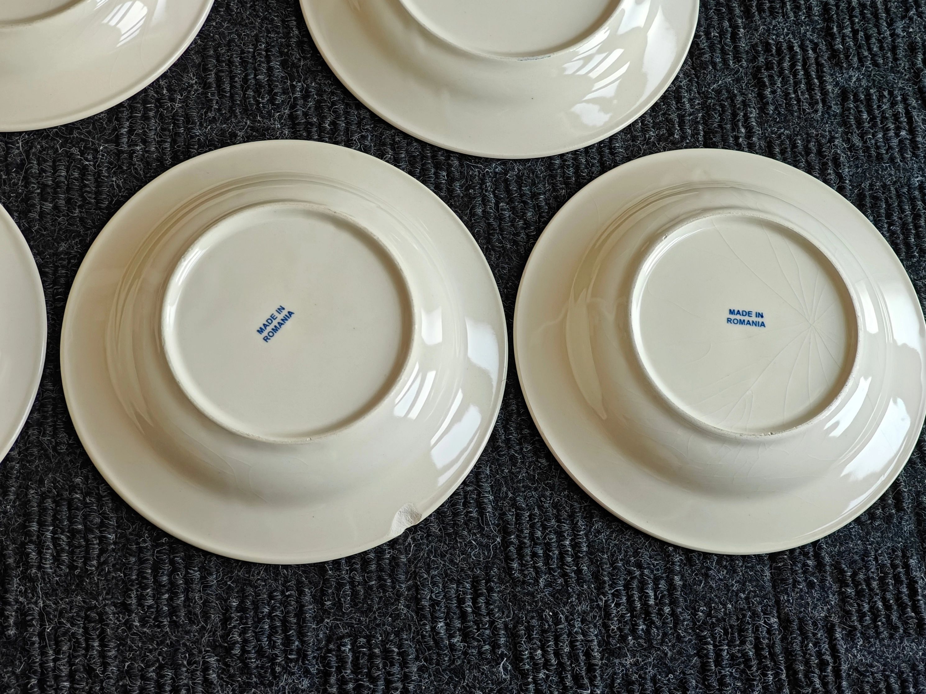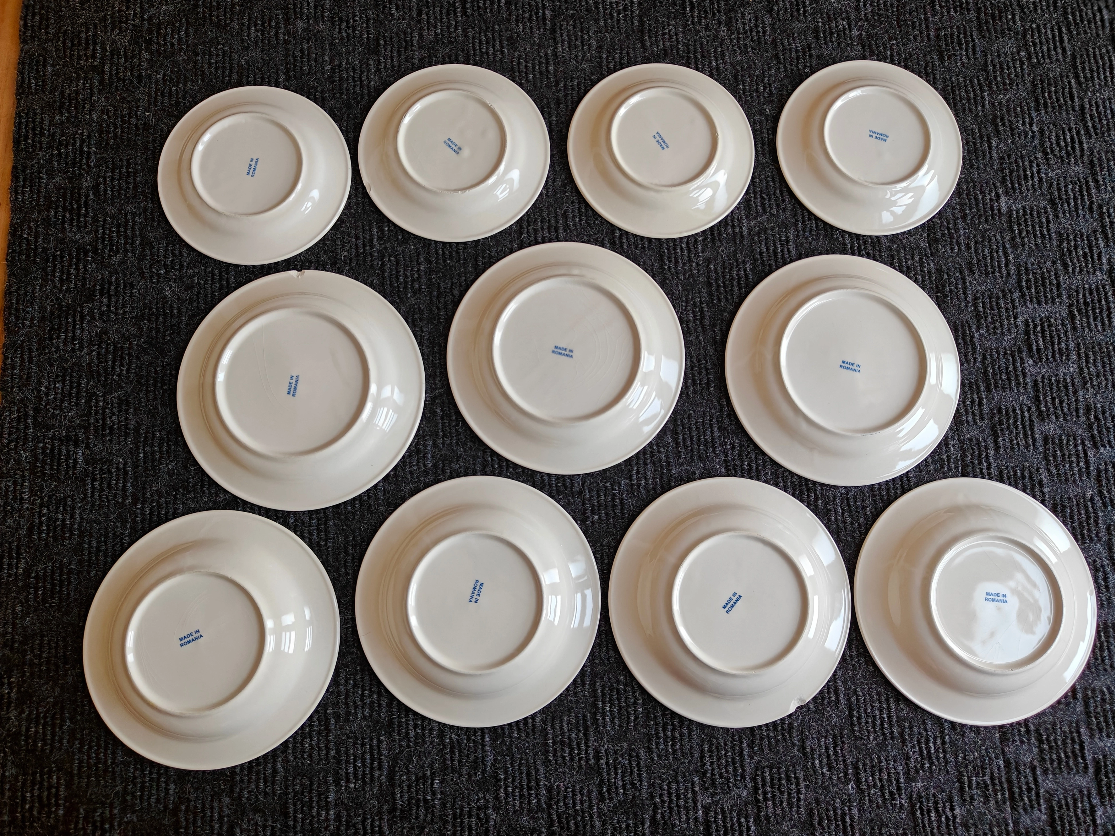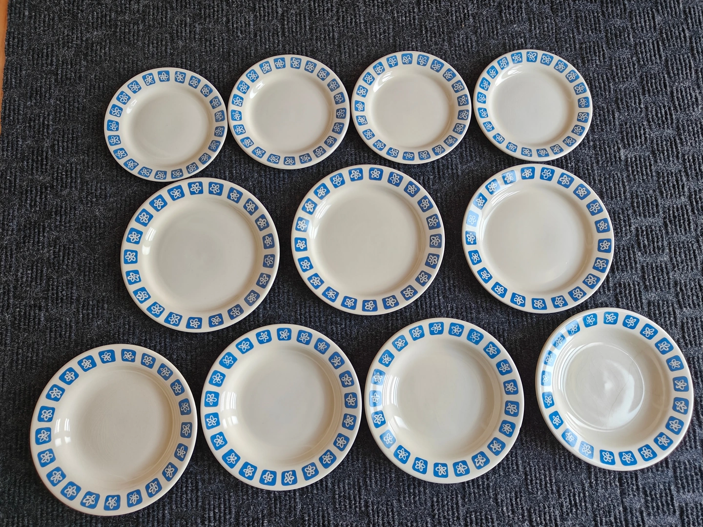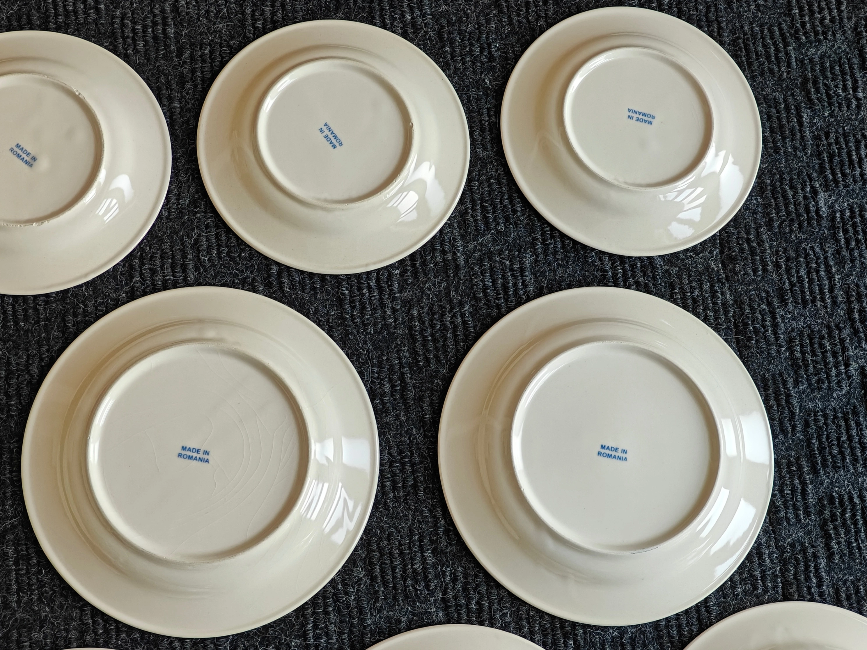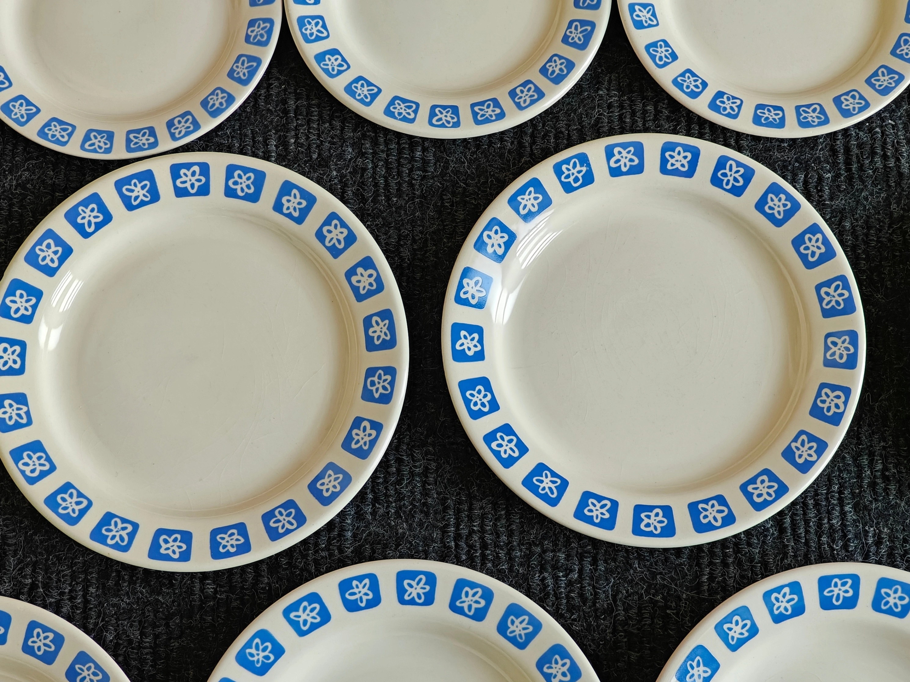 NOTE: While most plates are in good vintage condition, please note that some plates have small chips, consistent with their age and use. We've highlighted one of these in the photos (bottom right corner plate) to show an example of the minor imperfections. These small chips do not detract significantly from their overall aesthetic appeal and functionality. Please see below for number of chips. I am selling a Set of 11 - Vintage Mid-Century Modern "Atomic Blue Flower" Kitchen Dinner Plate & Bowl Dishes - 1960s Dish Set - Made in Romania in used, good condition. Perfect for collectors of Mid Century Modern dinnerware, adding character to your kitchen, or for everyday use if you appreciate their vintage charm. Add a touch of retro charm to your dining experience with this set of 11 vintage plates featuring a distinctive atomic blue flower pattern. These unique pieces were crafted in Romania and evoke classic Mid-Century Modern design. * Set includes: 11 plates (as pictured) * 4 Plates - 7-1/2" (1 Plate has a chip) * 3 Plates - 9" (1 Plate has a chip) * 4 Bowls - 9" Diameter & 1.5" Height (1 Bowl has a chip & 1 Bowl is showing crazing) * Pattern: Atomic Blue Flower * Origin: Made in Romania * Condition: Good vintage condition with some chips (see photos for examples) Comes from a pet and smoke-free environment. Pickup in Mount Pleasant (NW Calgary) Dinnerware / Plate / Tableware / Dinner Plates / Dining Ware