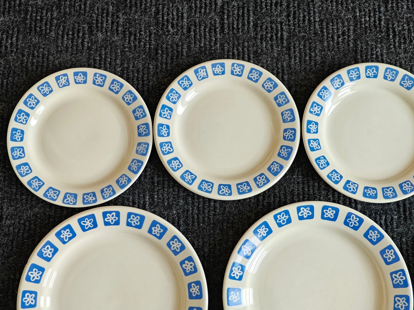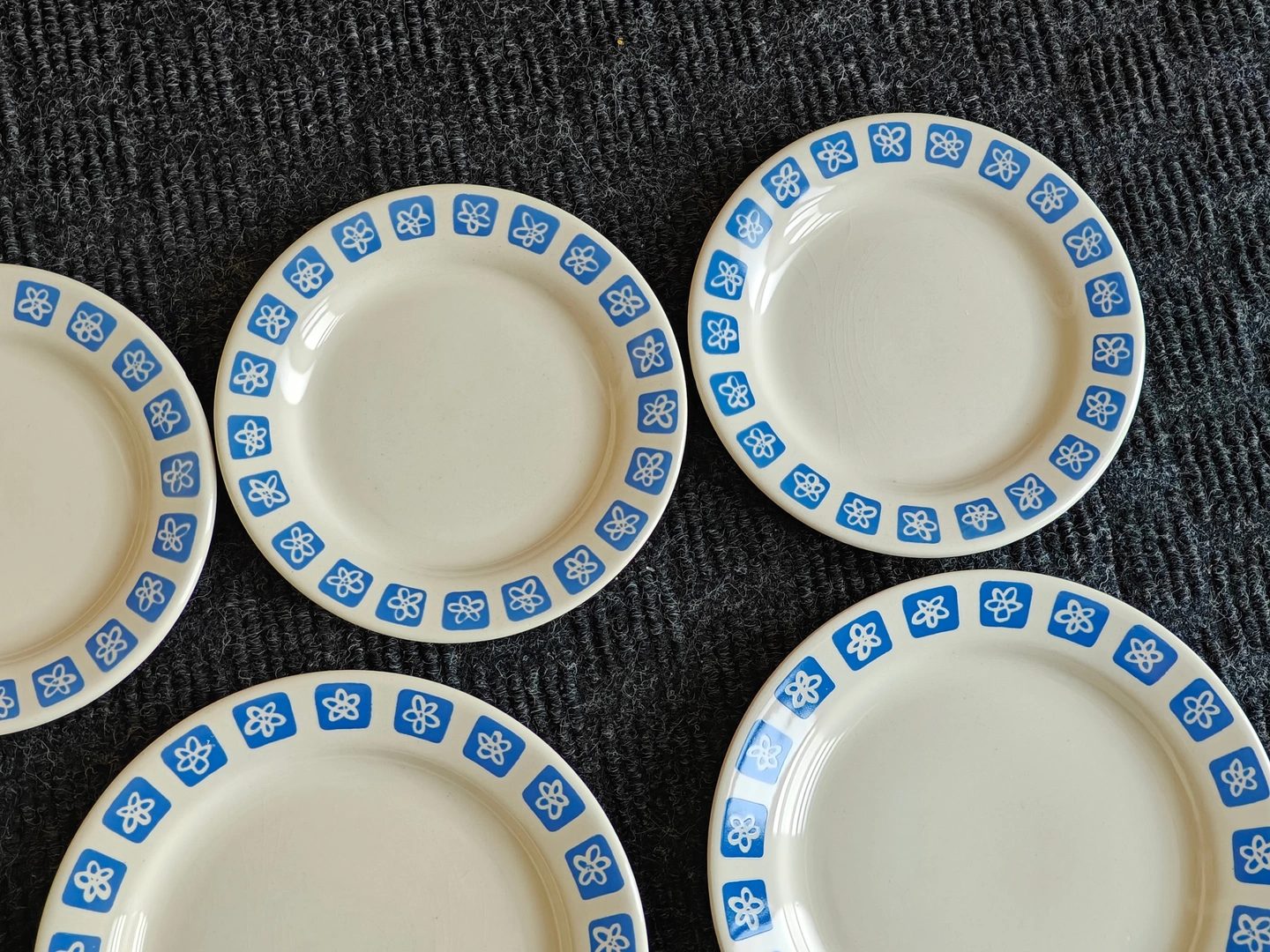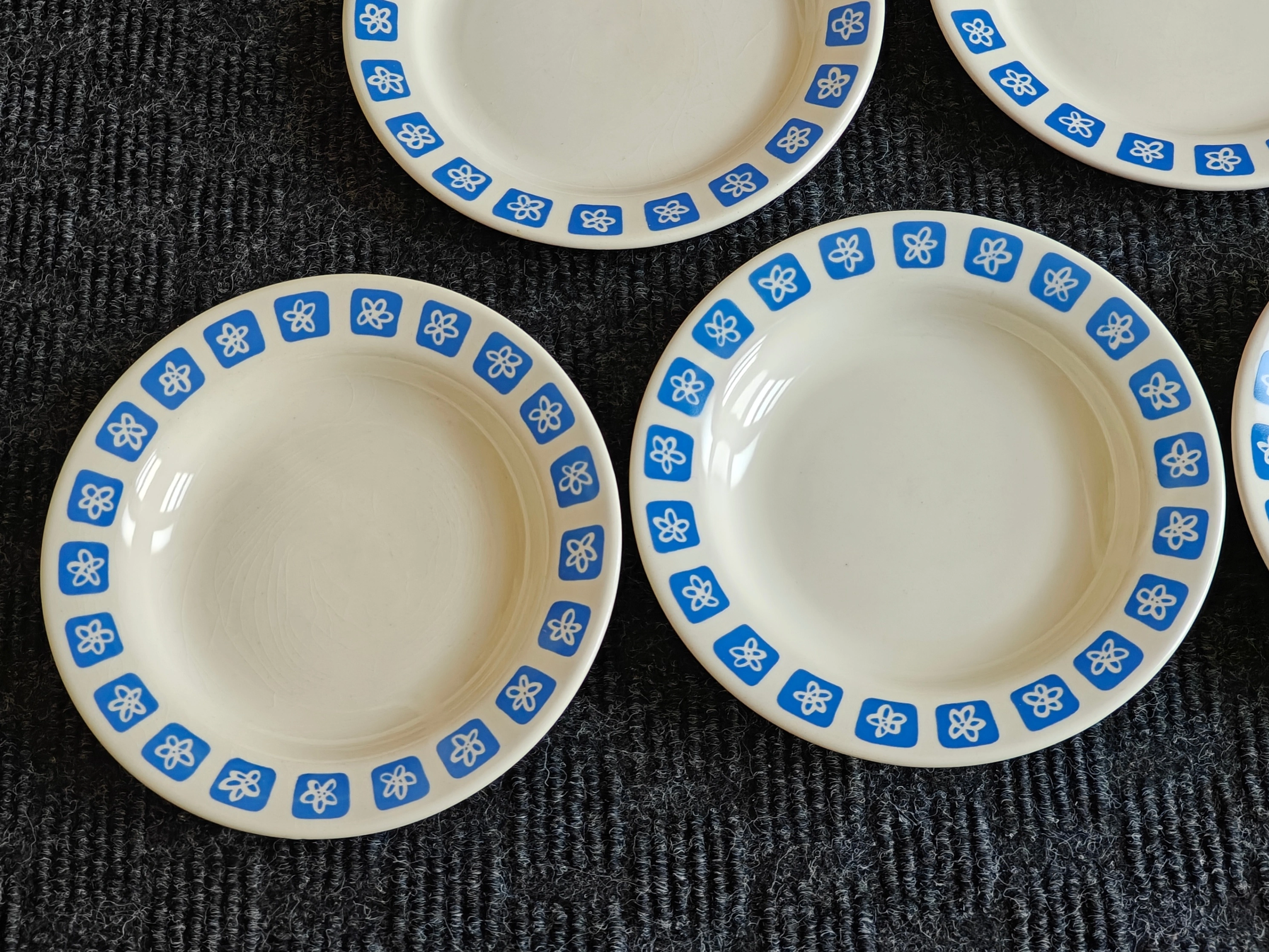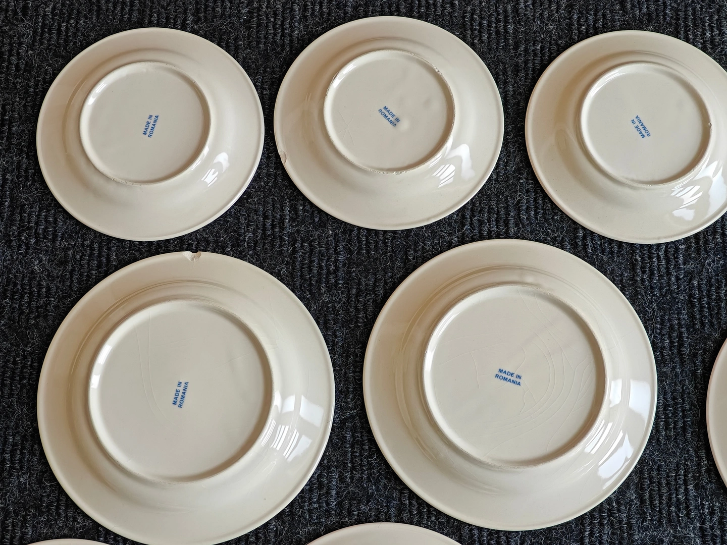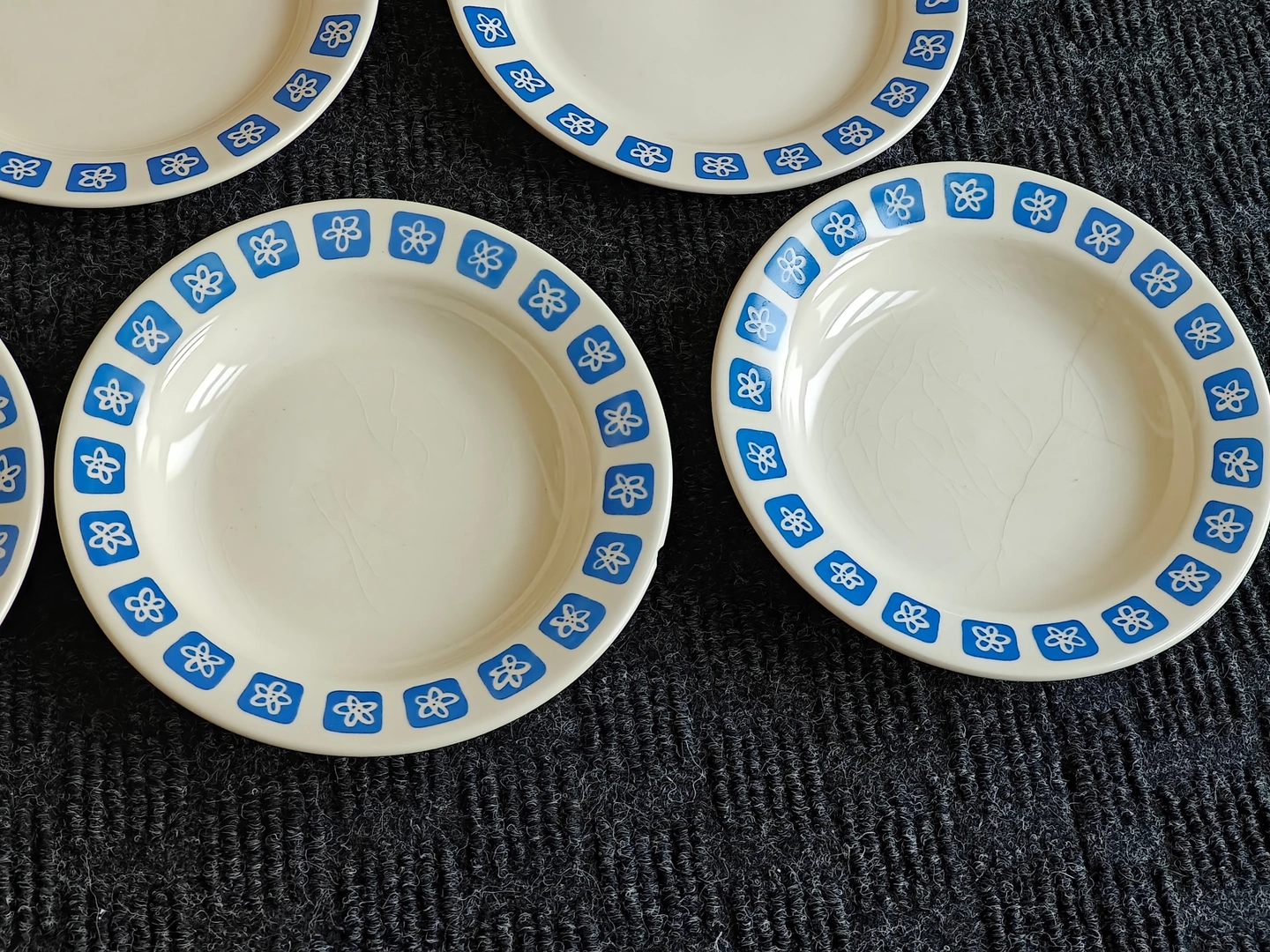 NOTE: While most plates are in good vintage condition, please note that some plates have small chips, consistent with their age and use. We've highlighted one of these in the photos (bottom right corner plate) to show an example of the minor imperfections. These small chips do not detract significantly from their overall aesthetic appeal and functionality. Please see below for number of chips. I am selling a Set of 11 - Vintage Mid-Century Modern "Atomic Blue Flower" Kitchen Dinner Plate & Bowl Dishes - 1960s Dish Set - Made in Romania in used, good condition. Perfect for collectors of Mid Century Modern dinnerware, adding character to your kitchen, or for everyday use if you appreciate their vintage charm. Add a touch of retro charm to your dining experience with this set of 11 vintage plates featuring a distinctive atomic blue flower pattern. These unique pieces were crafted in Romania and evoke classic Mid-Century Modern design. * Set includes: 11 plates (as pictured) * 4 Plates - 7-1/2" (1 Plate has a chip) * 3 Plates - 9" (1 Plate has a chip) * 4 Bowls - 9" Diameter & 1.5" Height (1 Bowl has a chip & 1 Bowl is showing crazing) * Pattern: Atomic Blue Flower * Origin: Made in Romania * Condition: Good vintage condition with some chips (see photos for examples) Comes from a pet and smoke-free environment. Pickup in Mount Pleasant (NW Calgary) Dinnerware / Plate / Tableware / Dinner Plates / Dining Ware