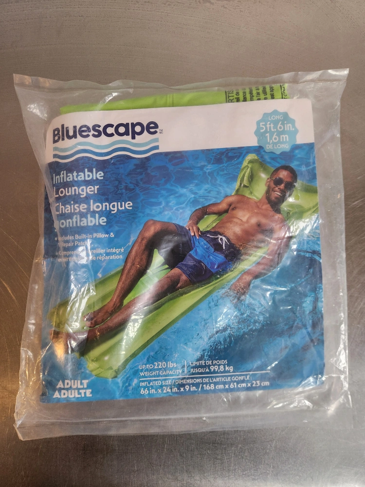 I have a brand new Bluescape Inflatable Lounger still in its original packaging! It's perfect for relaxing in the pool or at the lake. - Includes a built-in pillow and repair patch - Weight capacity: up to 220 lbs (99.8 kg) - Inflated size: 66 in x 24 in x 9 in (168 cm x 61 cm x 23 cm) - Length: 5 ft 6 in (1.6 m)