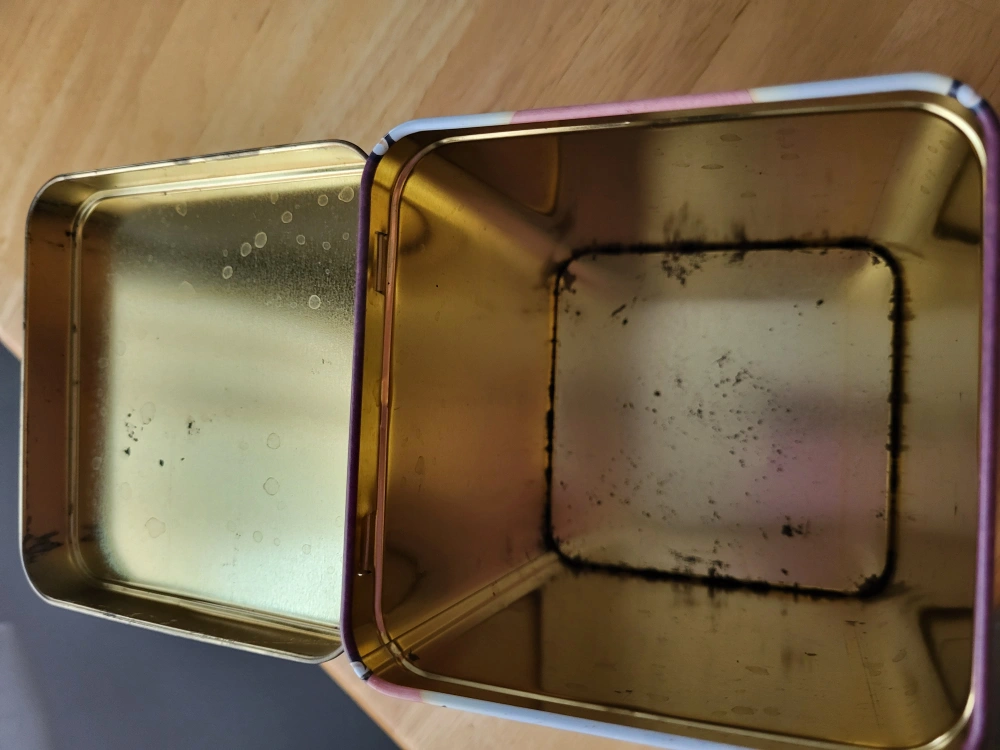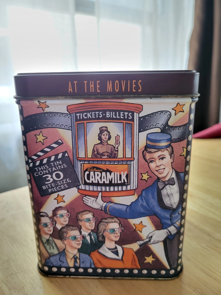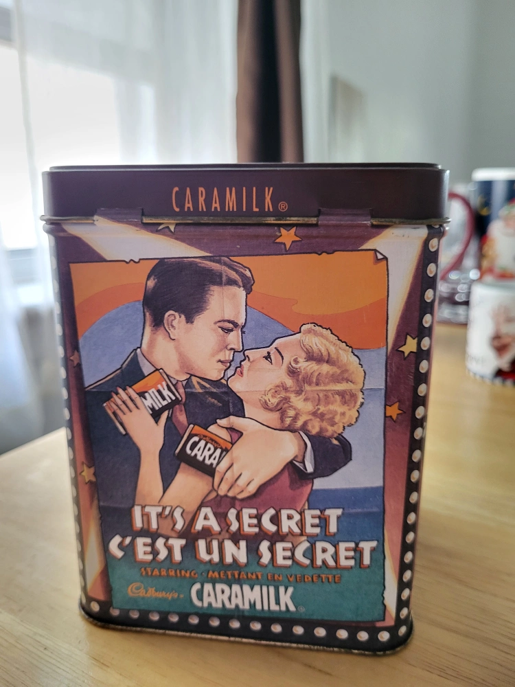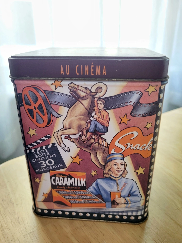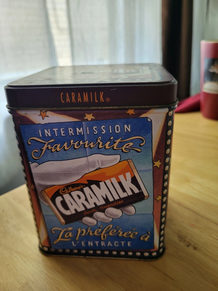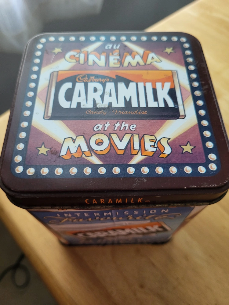 Cadbury Caramilk tin - a cute collectible tin featuring various movie-related scenes. About 5 1/2 " tall. A little rust inside, but would be great for storing small items or as a decorative piece .