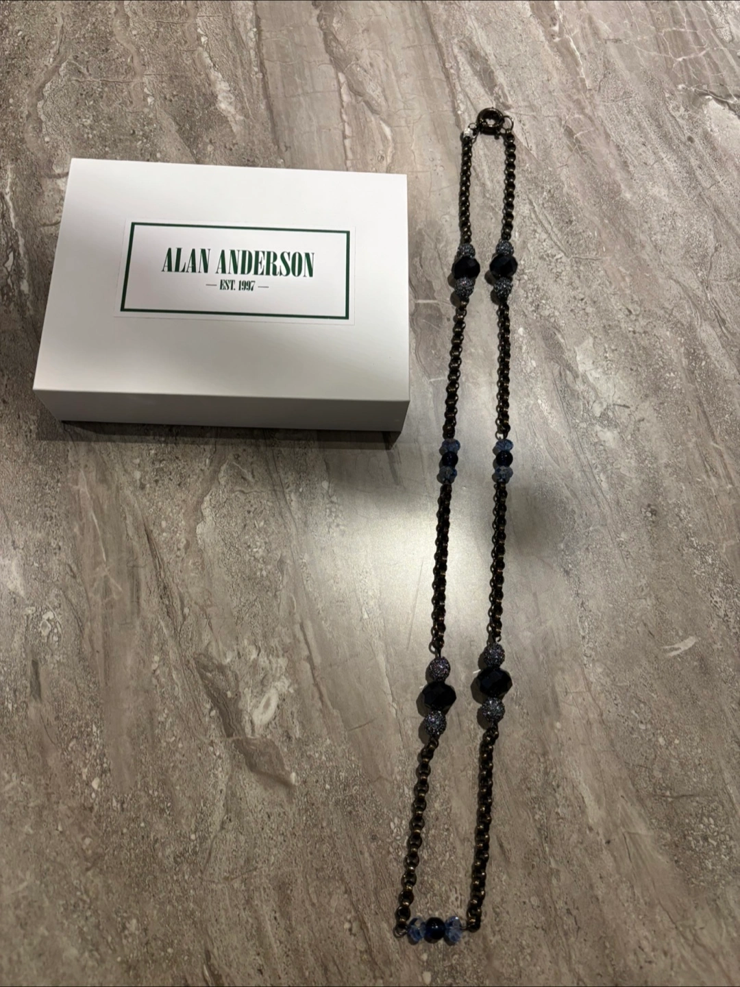 Elevate your style with this sophisticated Alan Anderson Design long necklace featuring elegant blue accents and exquisite dark metalwork; this necklace is a used item in excellent condition. * Brand: Alan Anderson Design Canadian * Type: Long Necklace * Colour: Dark Gun Metal with Blue Accents * Design: Elevated and sophisticated * Condition: New Excellent This necklace exudes an air of timeless elegance. Each piece is carefully crafted, making it a unique addition to any jewellery collection.