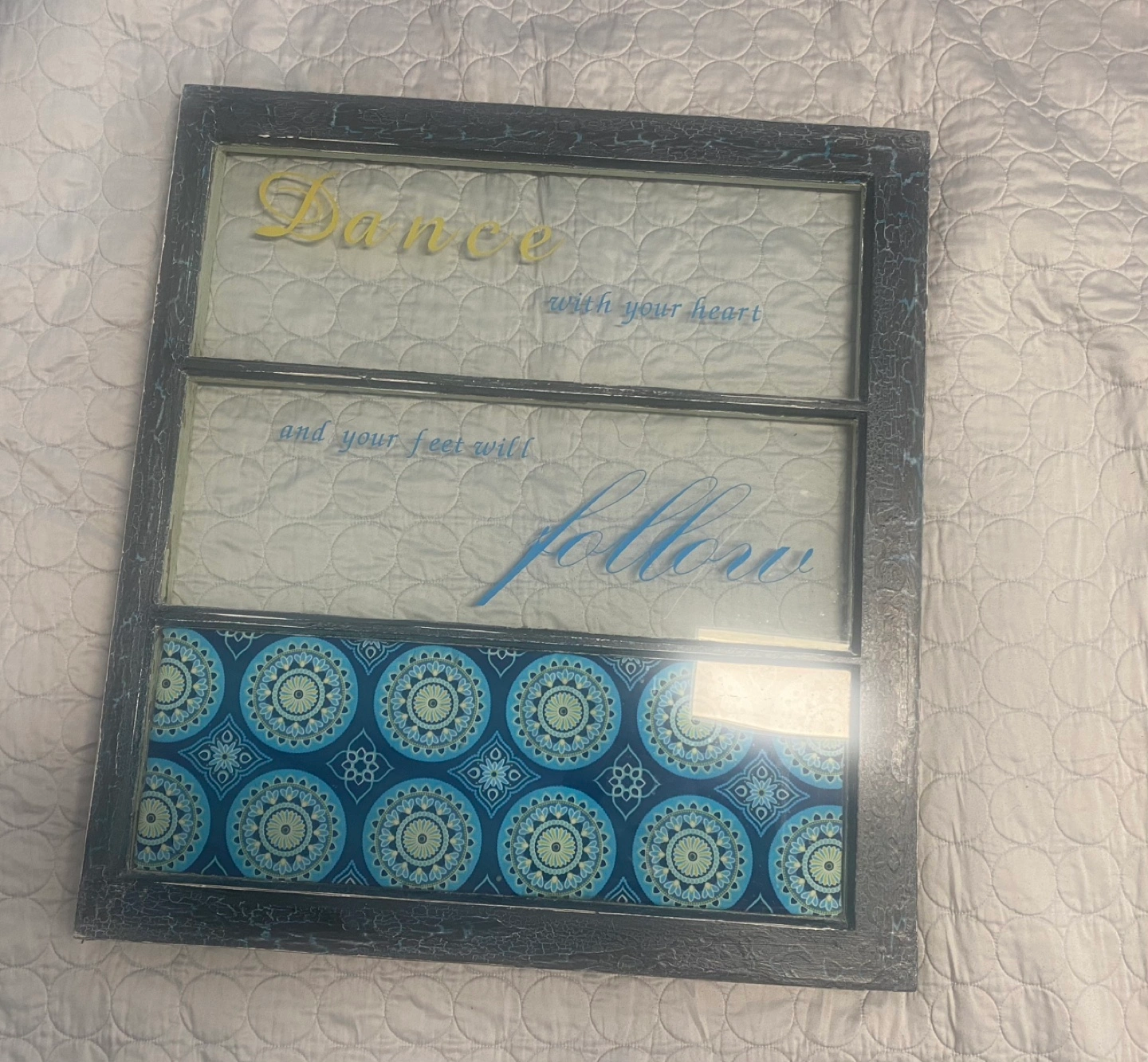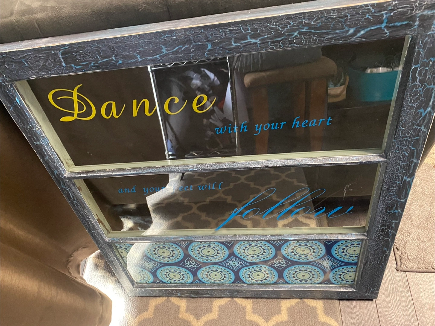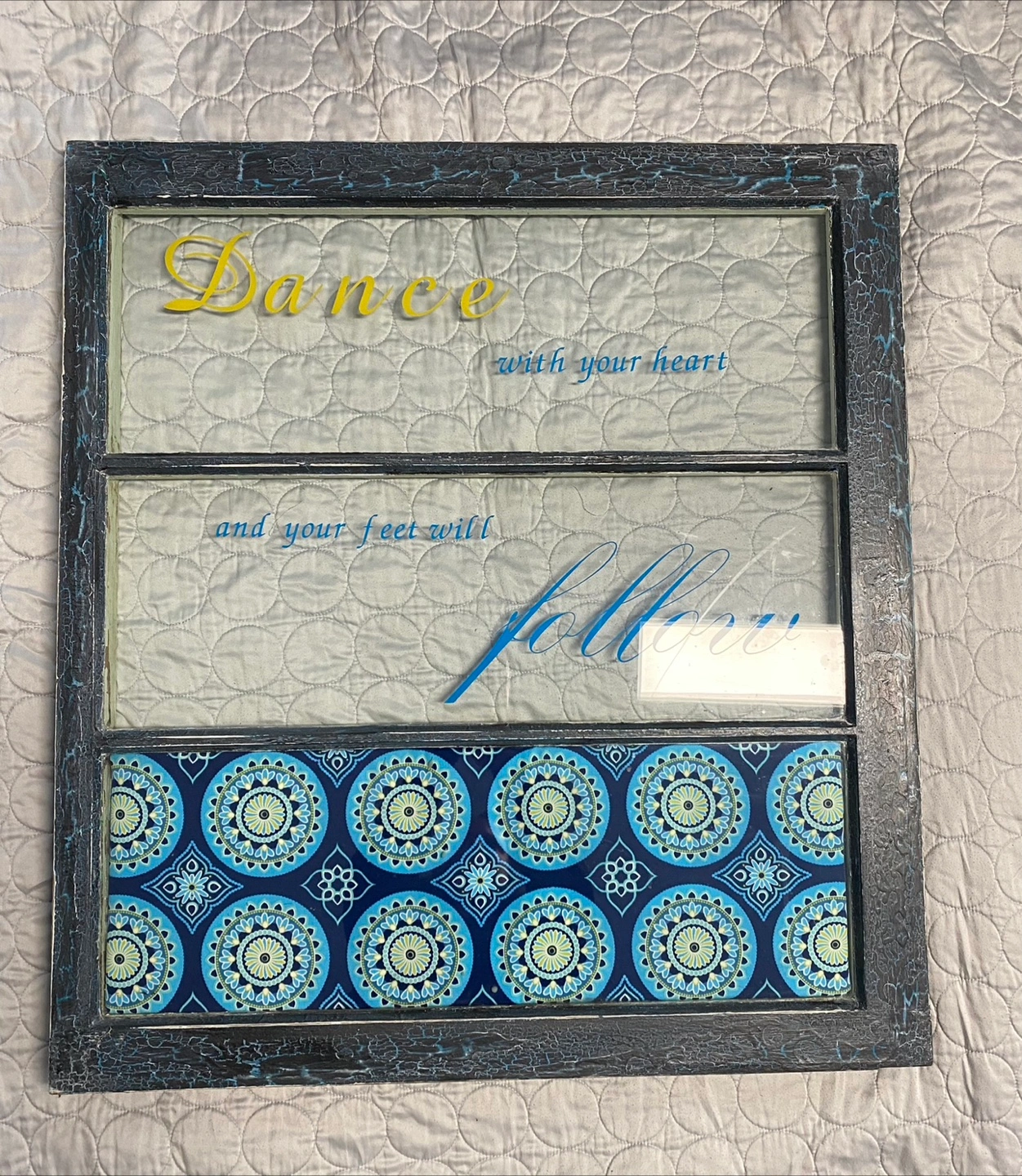 Upcycled window frame with a cute saying! The top two panes feature the phrase "Dance with your heart and your feet will follow" and the bottom pane has a lovely blue patterned design. It's a unique piece to add some charm to your home