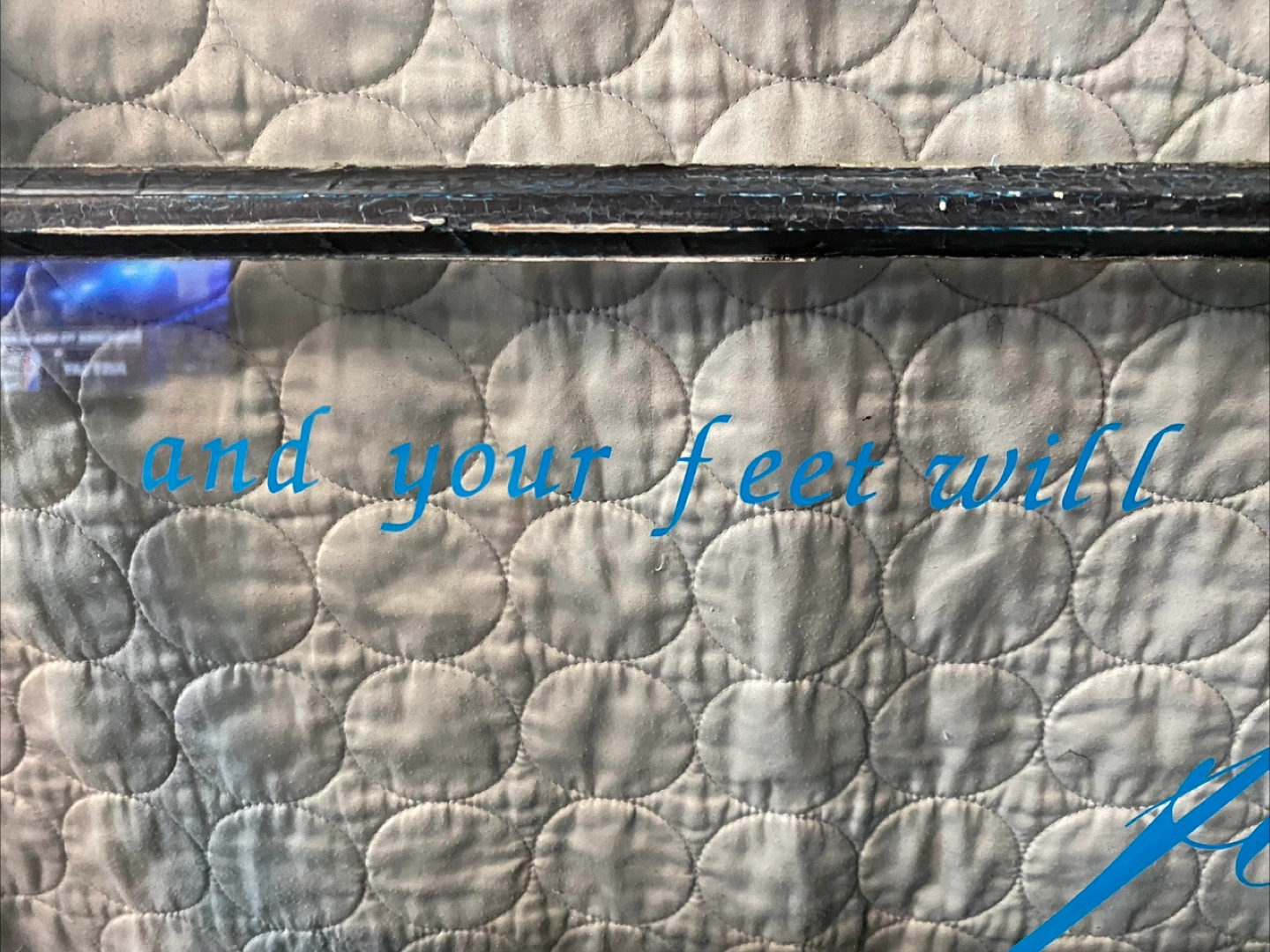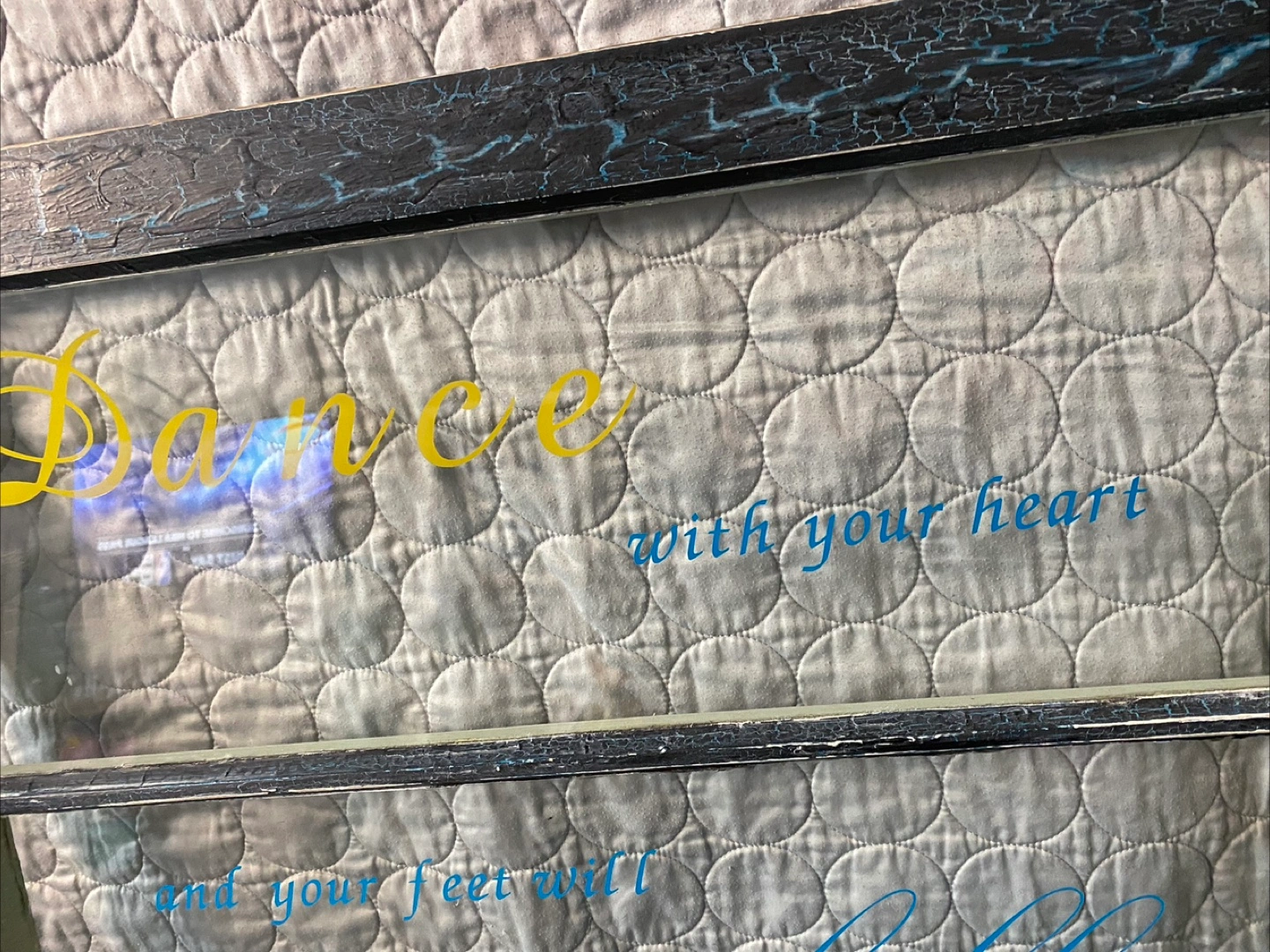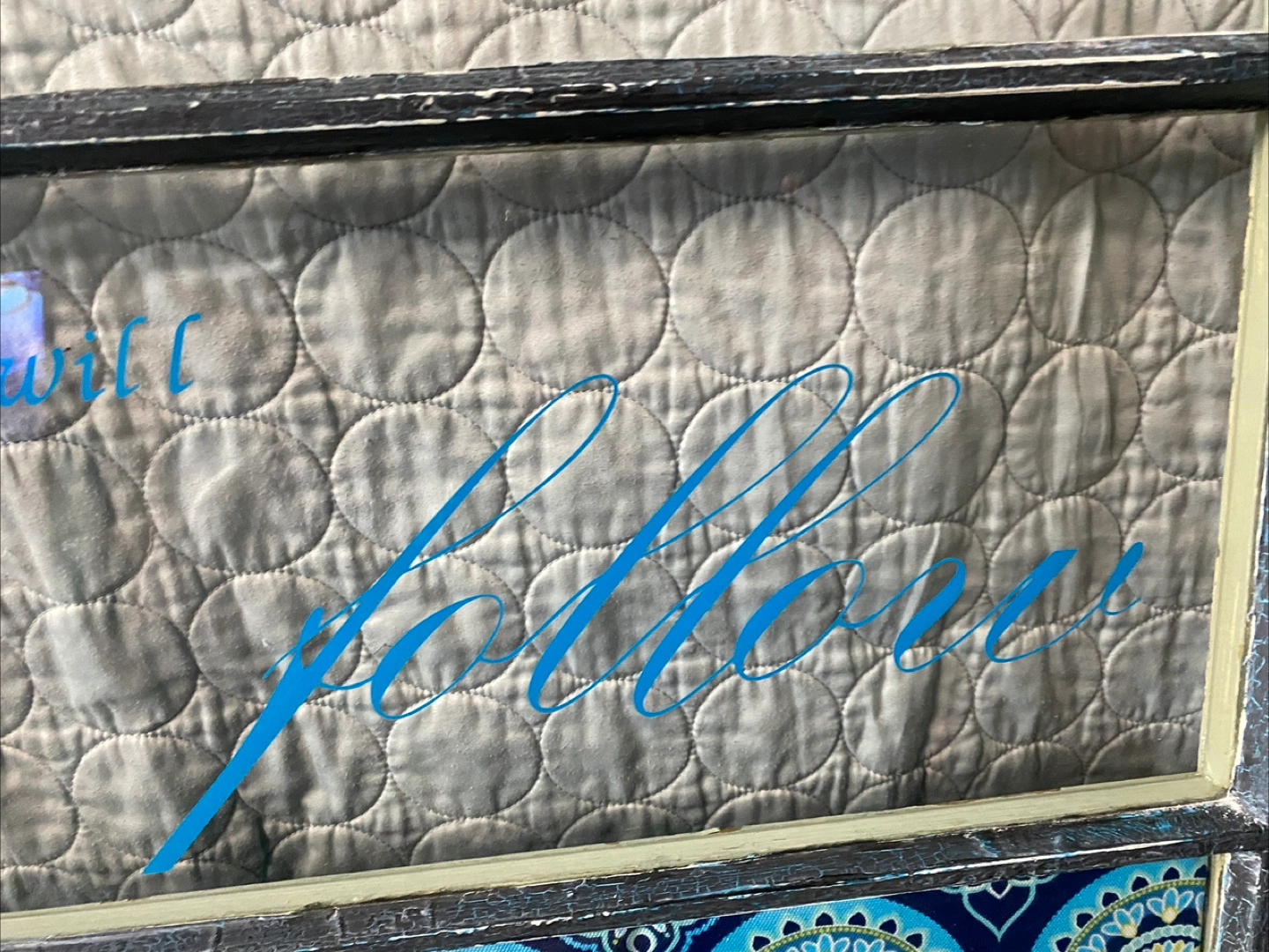 Upcycled window frame with a cute saying! The top two panes feature the phrase "Dance with your heart and your feet will follow" and the bottom pane has a lovely blue patterned design. It's a unique piece to add some charm to your home