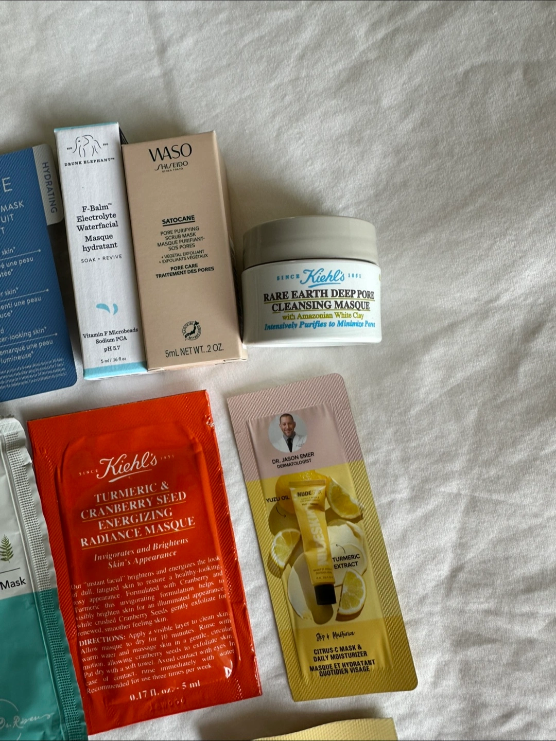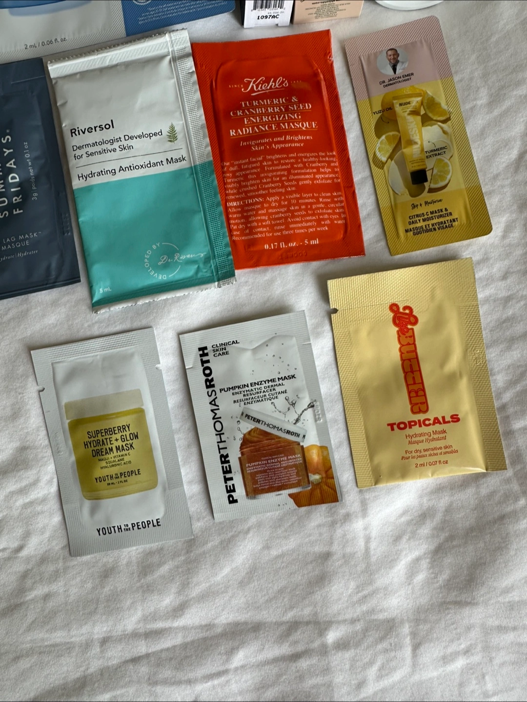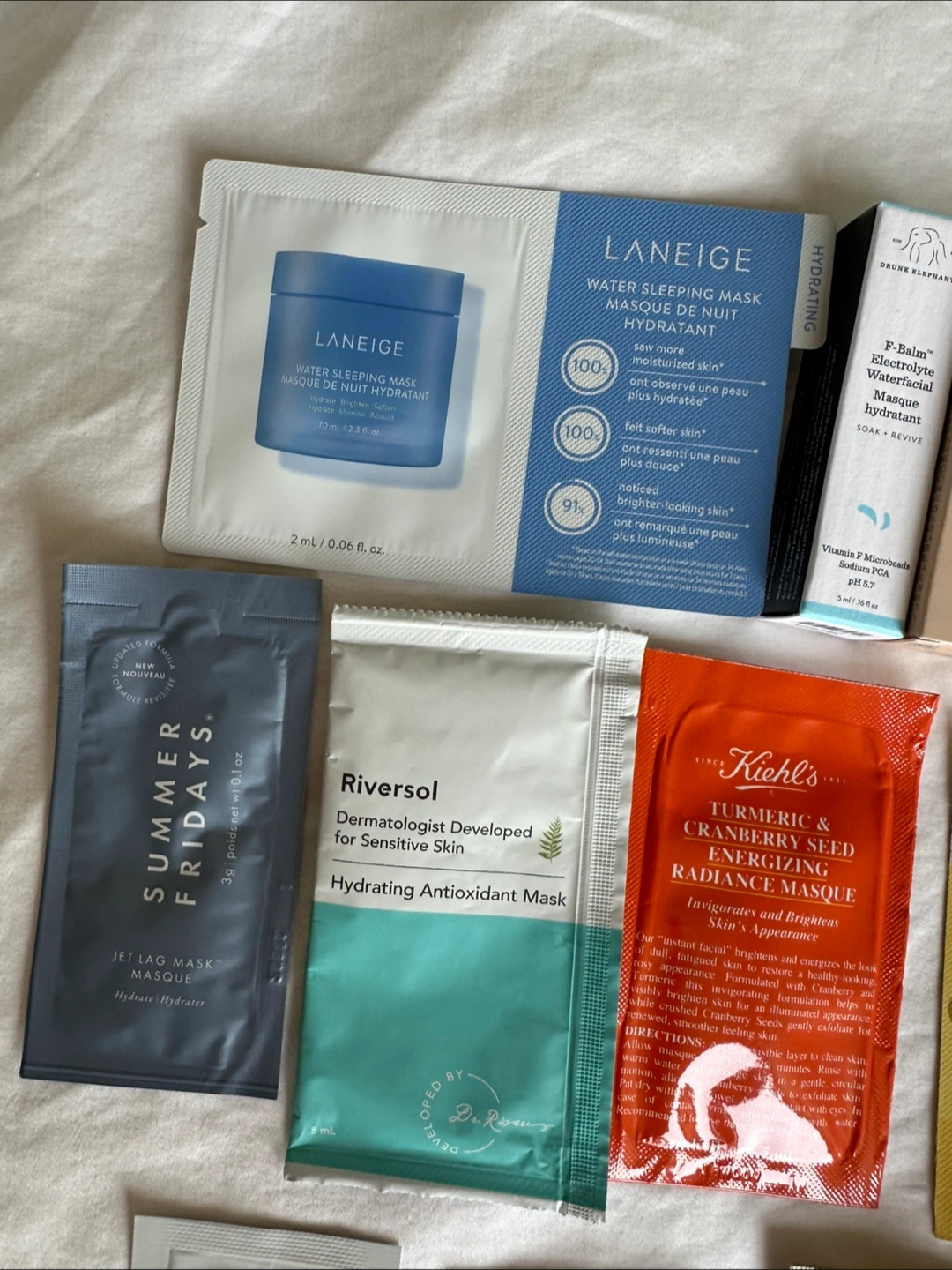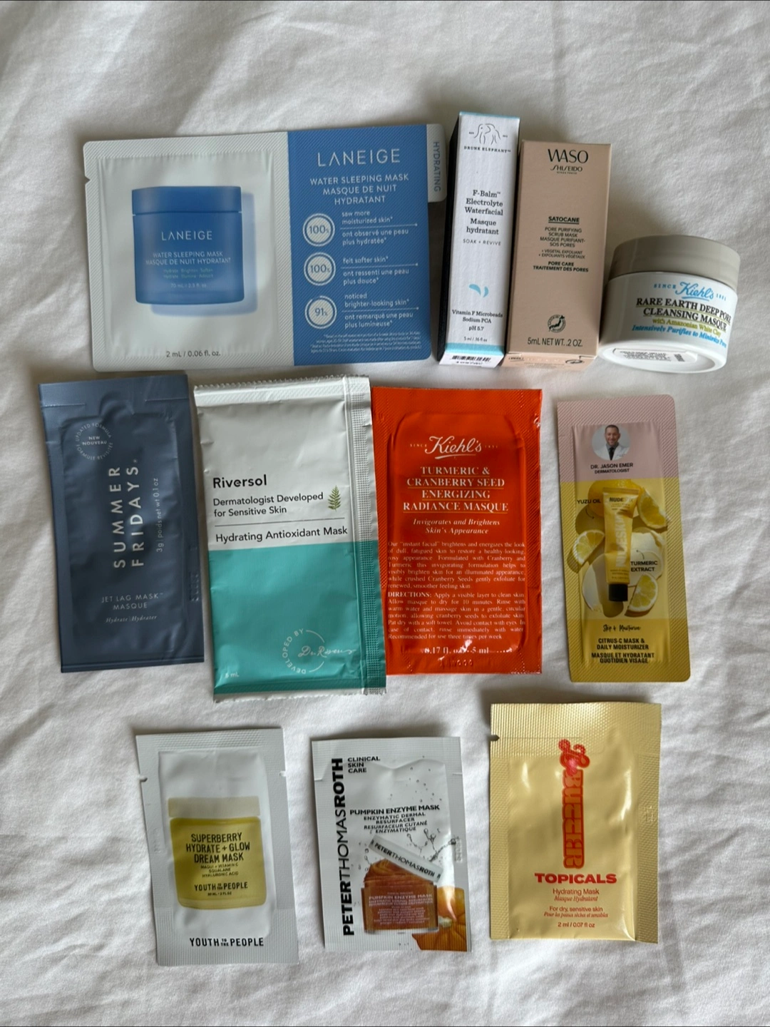 Face Masks variety pack. Perfect for travel or trying out different skincare treatments. 1) Laneige Water Sleeping Mask 2 ml 2) Drunk Elephant F-Balm Electrolyte Waterfacial 5 ml 3) Shiseido WASO Satocane Pore Purifying Scrub Mask 5 ml 4) Kiehl’s Rare Earth Deep Pore Cleansing Masque with Amazonian White Clay 14 ml 5) Summer Fridays Jet Lag Mask 3 g 6) Riversol Hydrating Antioxidant Mask 5 ml 7) Kiehl’s Turmeric & Cranberry Seed Energizing Radiance Masque 5 ml 8) Youth To The People Superberry Hydrate + Glow Dream Mask 3 ml 9) Nudestix Citrus-C Mask & Daily Moisturizer 10) Peter Thomas Roth Pumpkin Enzyme Mask 2 ml 11) Topicals Hydrating Mask 2 ml