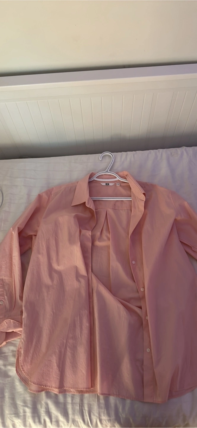 Selling a lovely pink button-up shirt from Uniqlo! It's a size L and its BRAND NEW. Perfect for a casual day out or dressing up for a more formal occasion. The material is soft and comfortable, making it a great addition to your wardrobe!