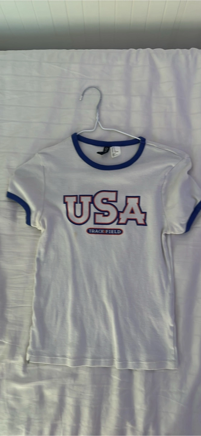 Selling a white T-shirt with a blue trim and 'USA Track Field' printed on the front. It's in great condition and ready for a new home!
