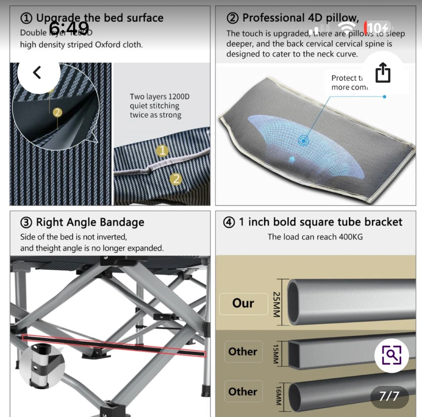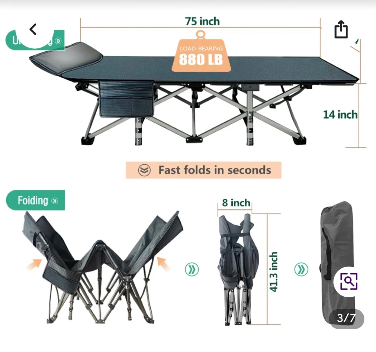 This portable travel camp cot is perfect for home, office, nap, and beach use! It's a heavy-duty sleeping cot with a carry bag. - Durable steel frame - 1200D oxford cloth - Fast folds in seconds - Load-bearing 880 lbs - Dimensions: 75 inch length, 14 inch height, 8 inch folded width, 41.3 inch folded height