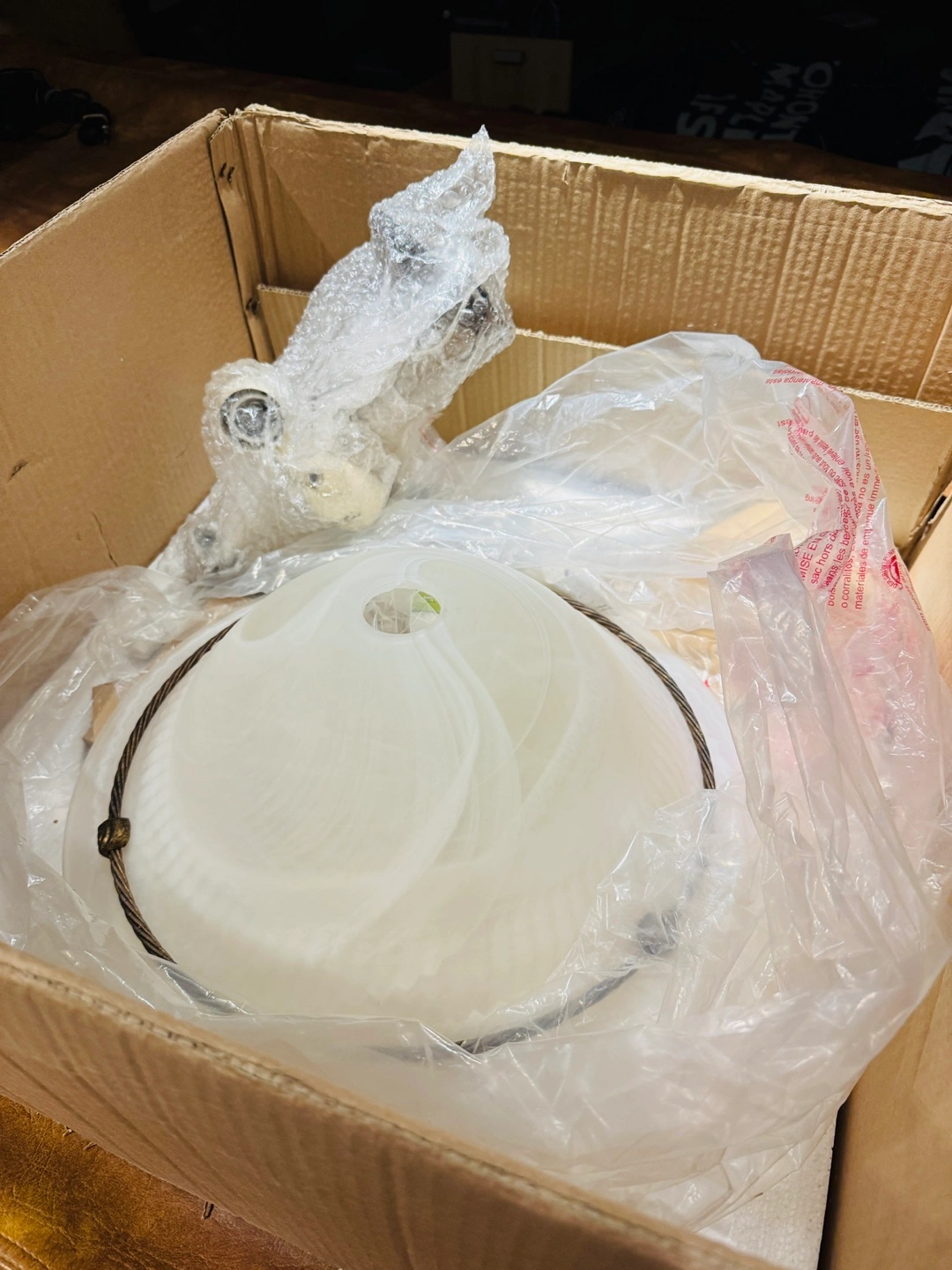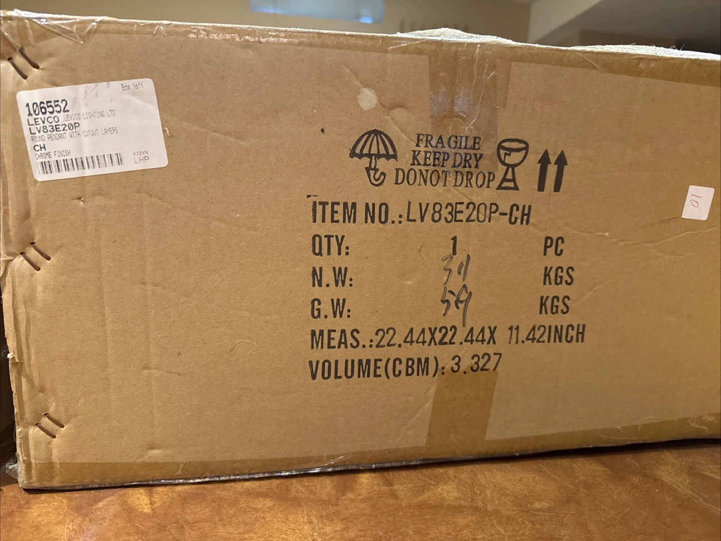 Selling a Levco LV83E20P round pendant light. It comes with its original box, ensuring safe transport. The dimensions of the box are 22.44 x 22.44 x 11.42 inches. This pendant features a chrome finish, adding a touch of elegance to any room
