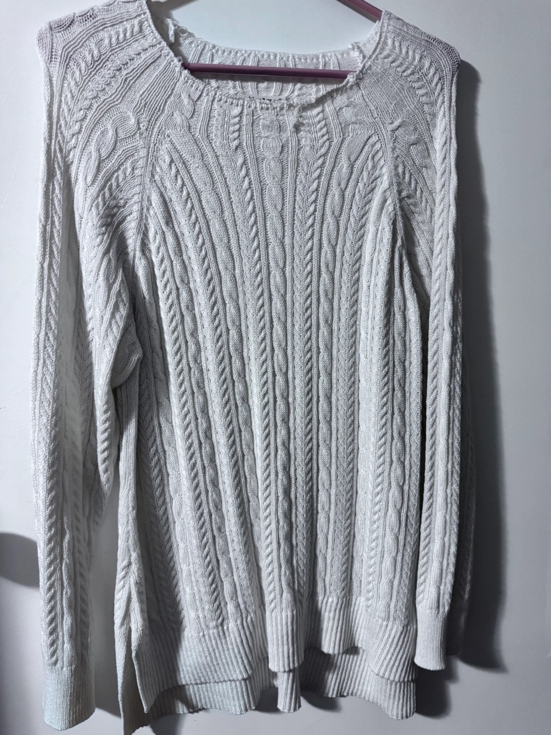 Selling a cozy cable knit sweater in white! It's perfect for layering during the cooler months. The material is soft and comfortable, making it a great addition to your wardrobe.