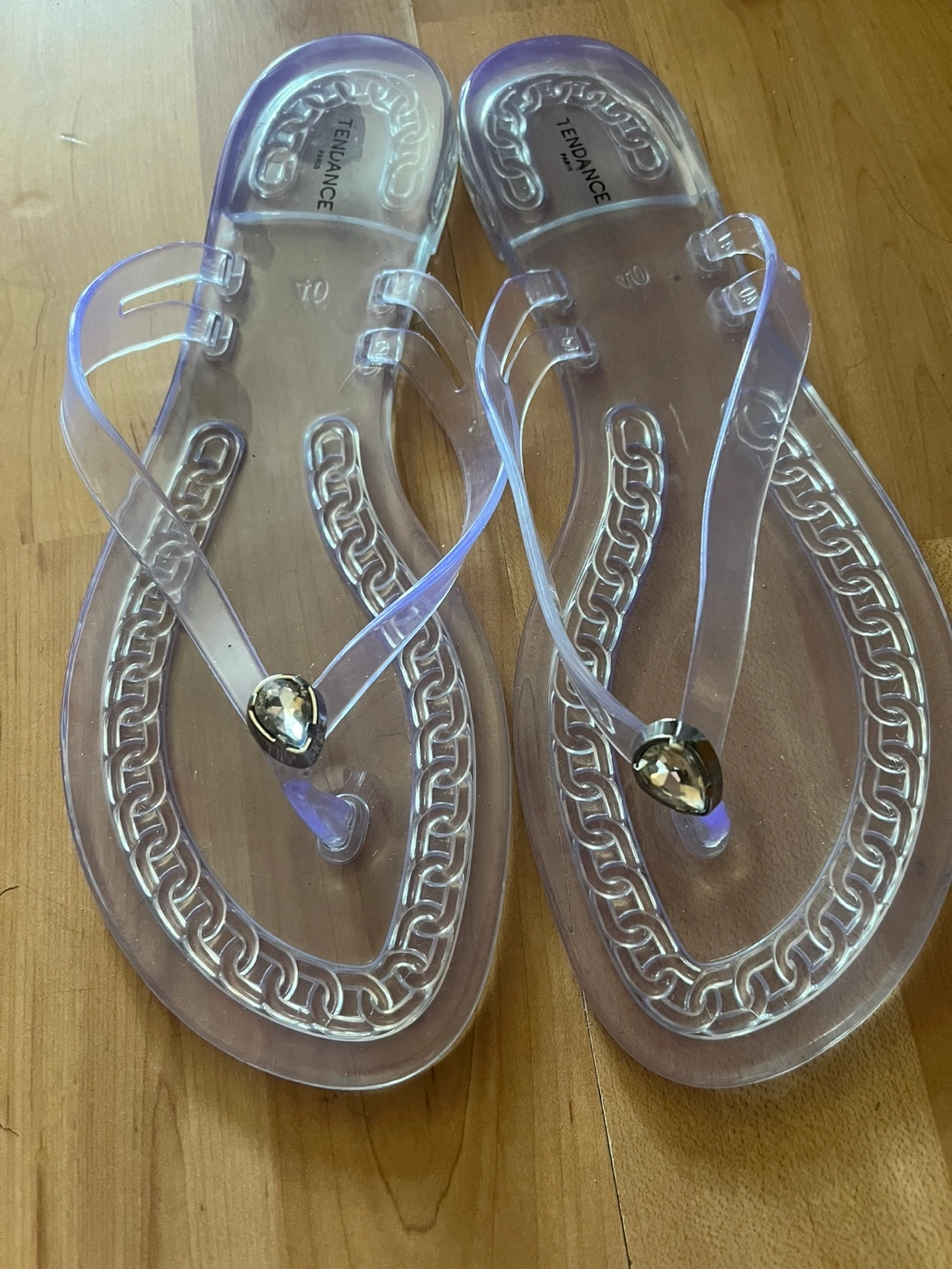 These Tendance Paris sandals are super cute and perfect for summer! They're a clear jelly material with a thong style and a decorative chain design around the sole. Size 10 (40 EUR) Cash only please