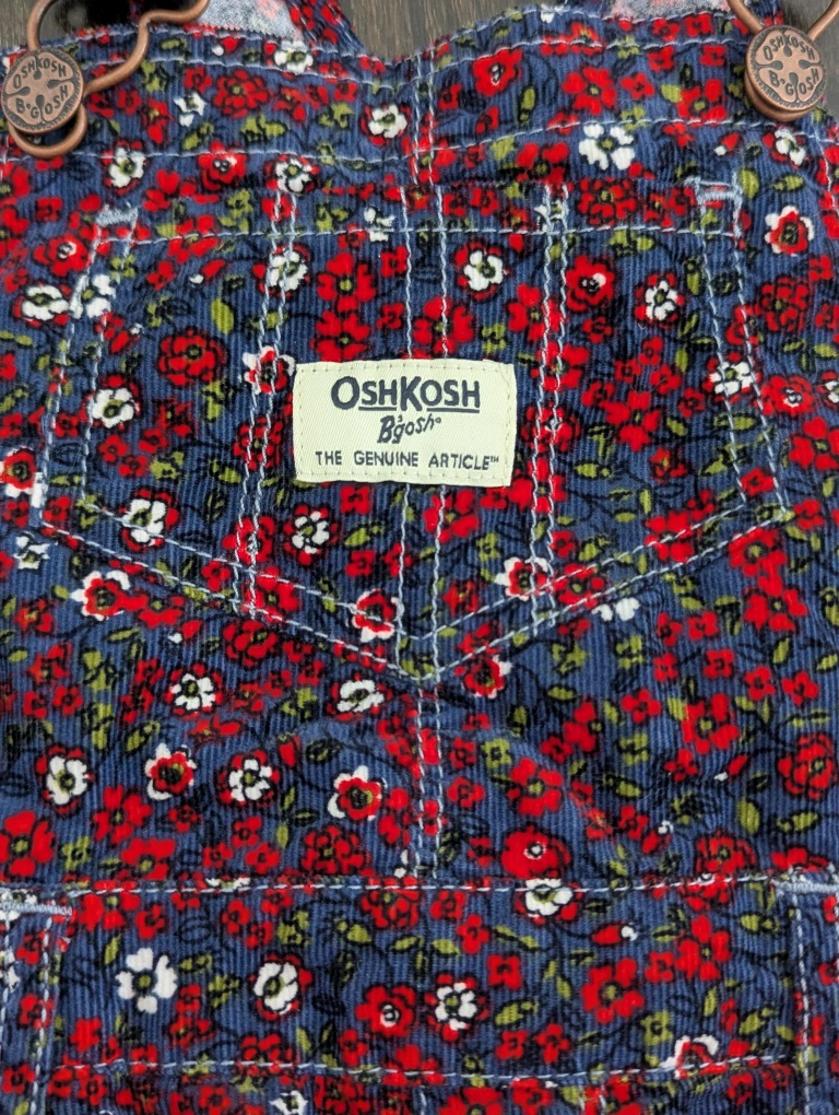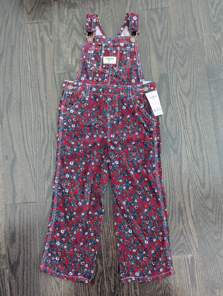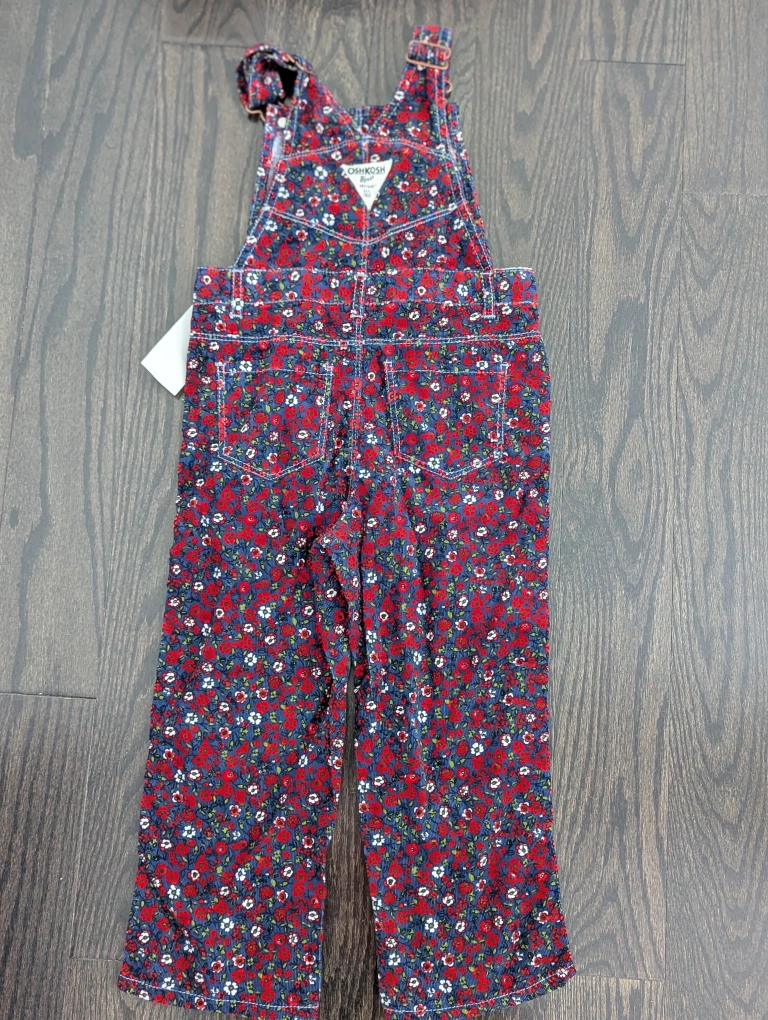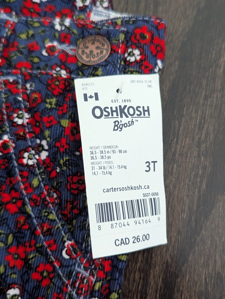 Brand New OshKosh B'gosh overalls size 3T, made from a soft corduroy material. Navy blue with red flowers.