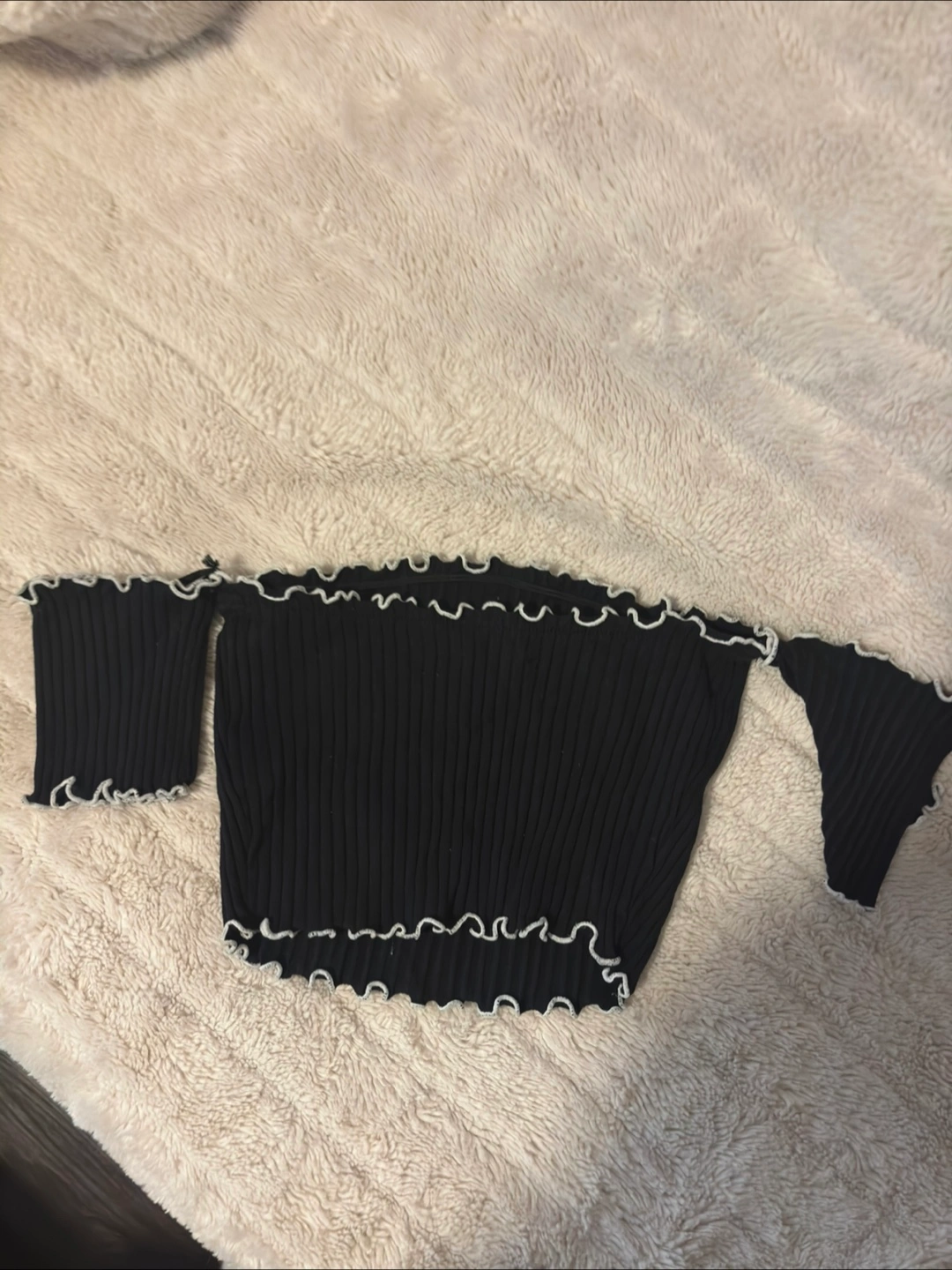 A cute black off-the-shoulder top with white frilly edges. It's in great condition and ready for a new home!