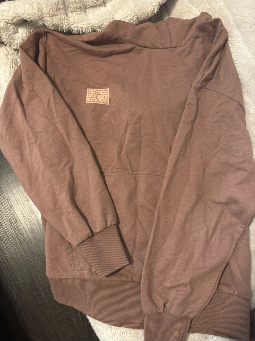 Selling a comfy brown hoodie, perfect for those cooler days. It's made from recycled materials, so it's good for the planet too! A great addition to any wardrobe