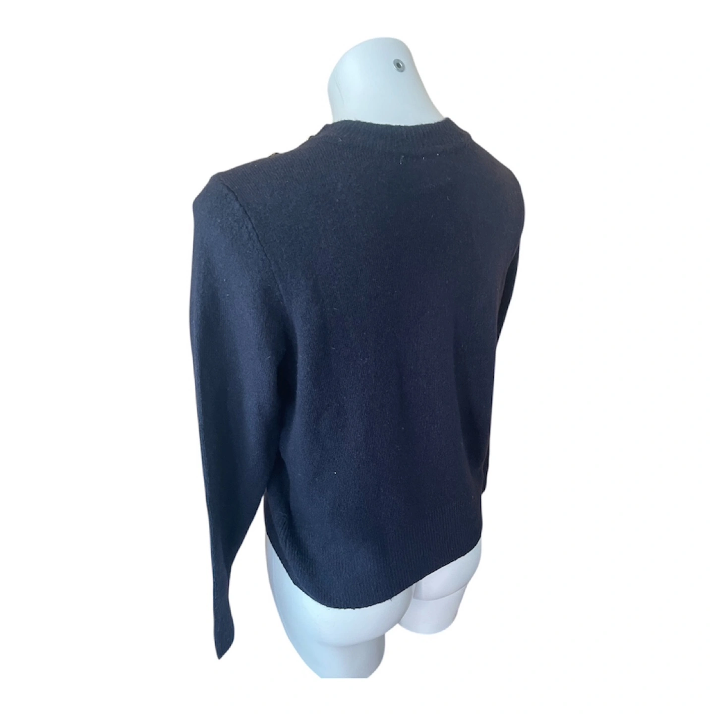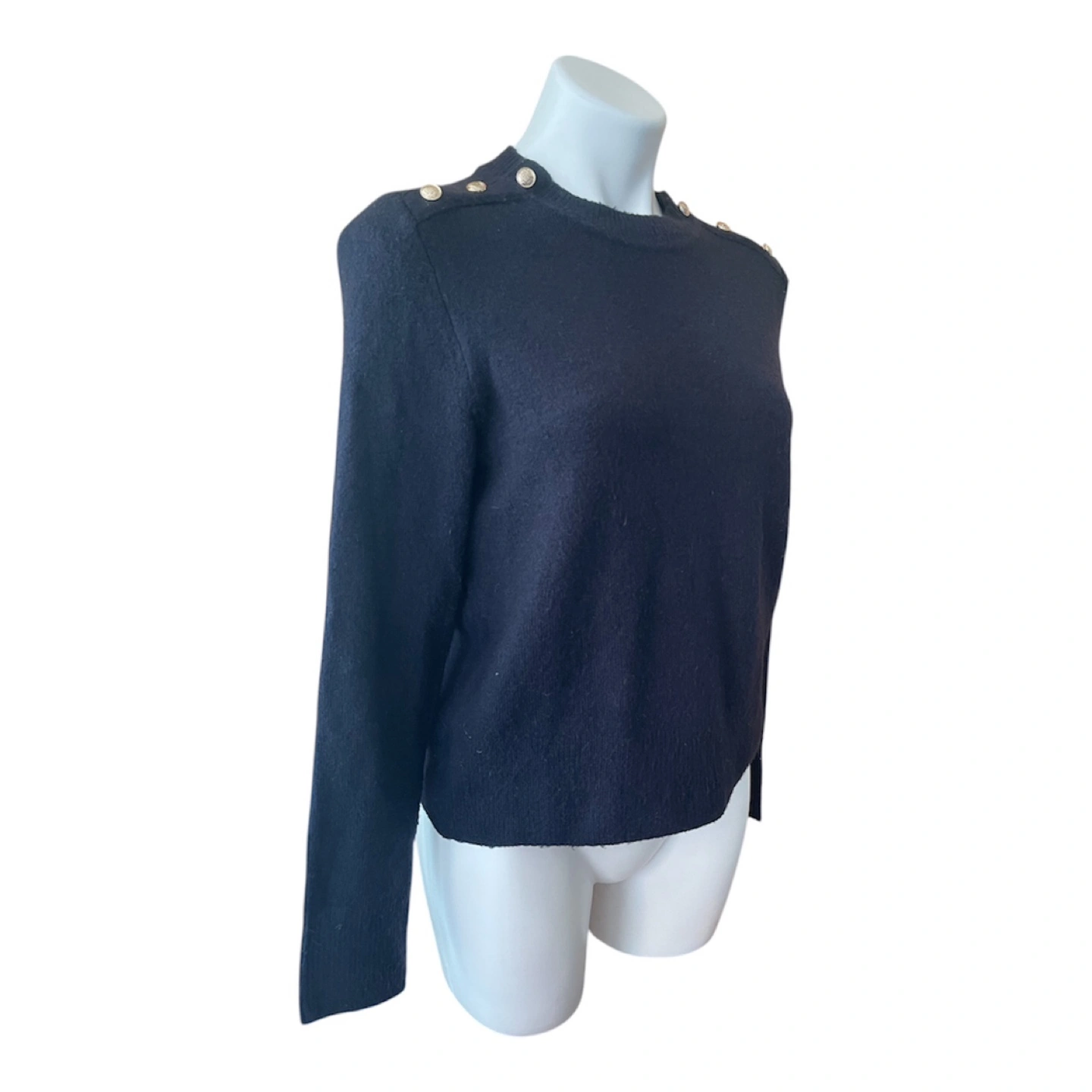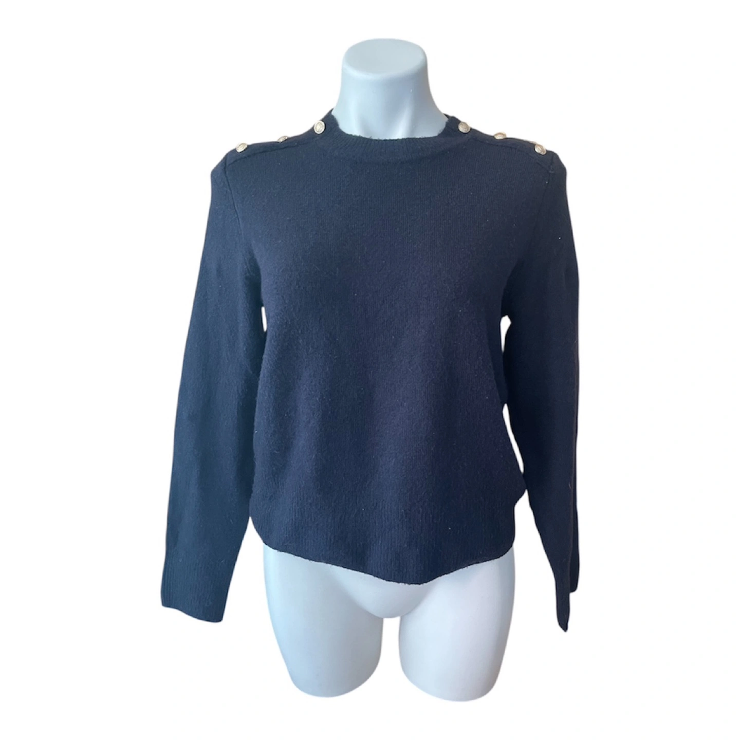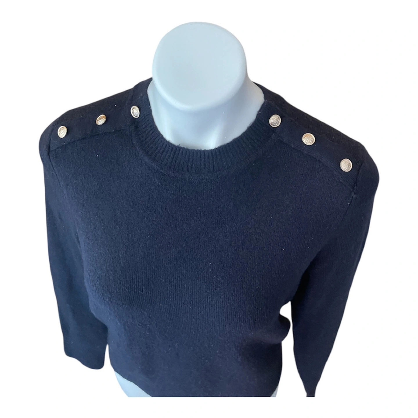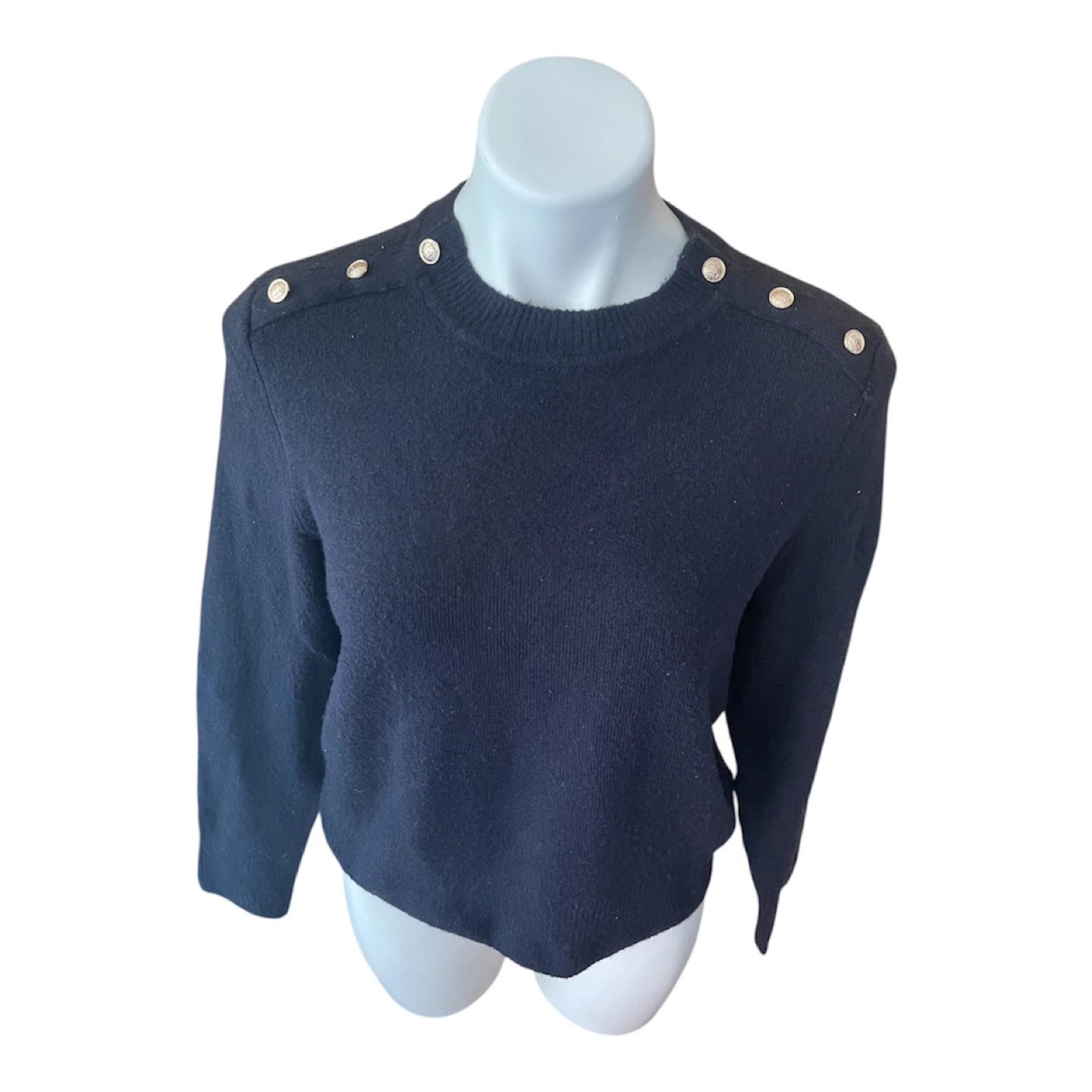 Vintage Y2K 2000s Navy Blue Super Soft Boyfriend Sweater Gold Buttons Shoulder Partial Wool S/M Condition: 10/10. No Stains/Rips/Tears. Measurements (Inches): **Mannequin is overall size medium **Clothing measured on flat surface - ONLY LEFT TO RIGHT - NOT ALL AROUND CIRCUMFERENCE Tag Size: Medium Shoulder to shoulder: 19 Bust: 21 Waist: 20 Hips: 22 Sleeve Length: 24 Armpit Width: 10 Length from shoulder to bottom hem: 21 Style Details: Colour: dark blue Material: Super soft to the skin. Lightweight & warm. 8% Wool/ 50% Polyester/ 38% Acrylic Slight high-neck. Scoop neckline 3 Gold embellishment buttons on each shoulder Long sleeves Slight ribbing at end of sleeves, neckline, & bottom hemline Classic style