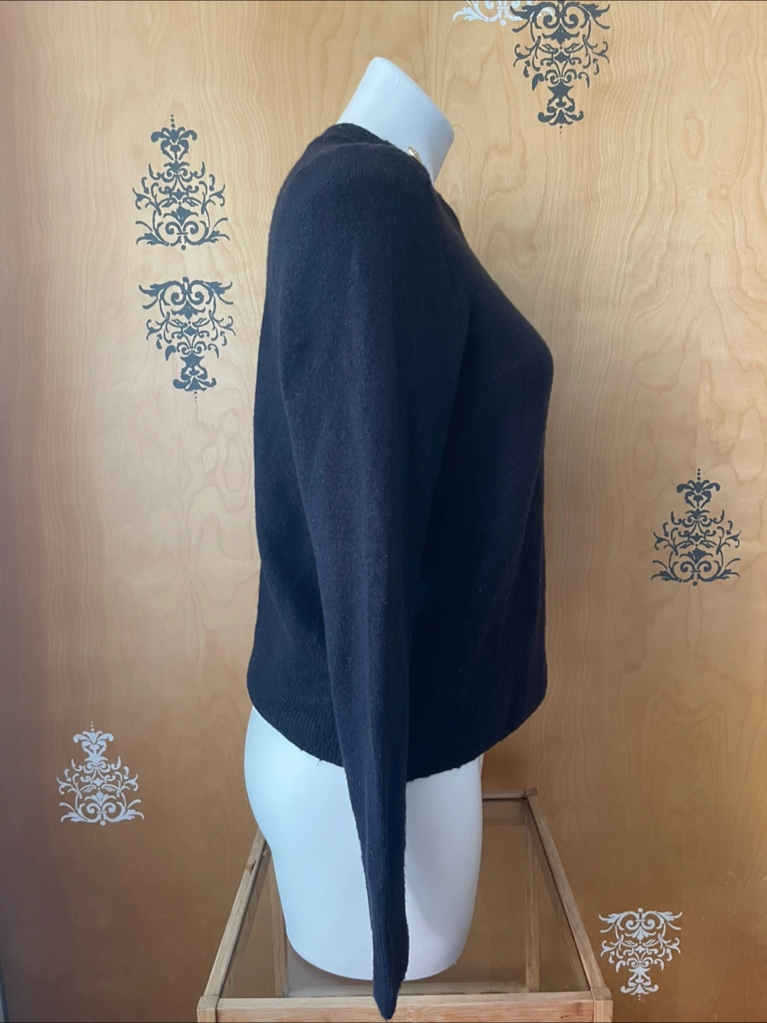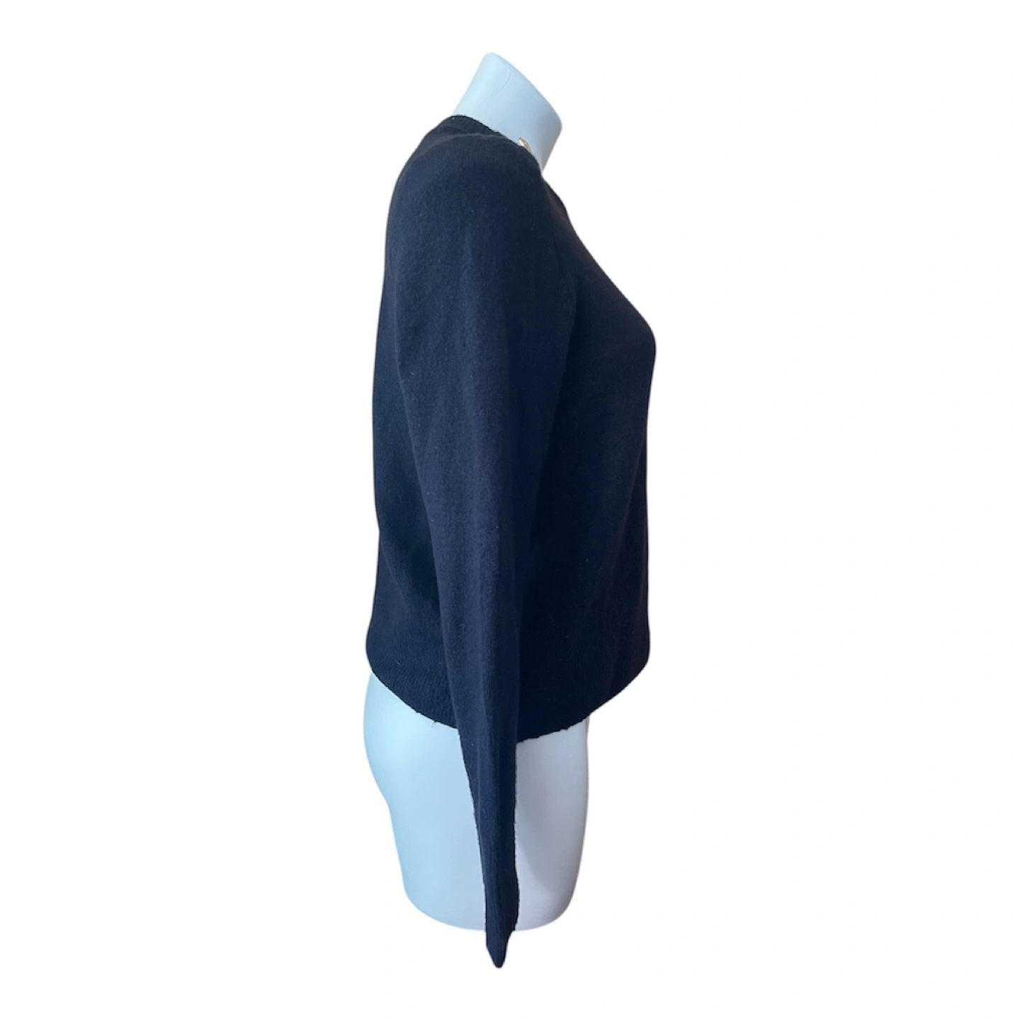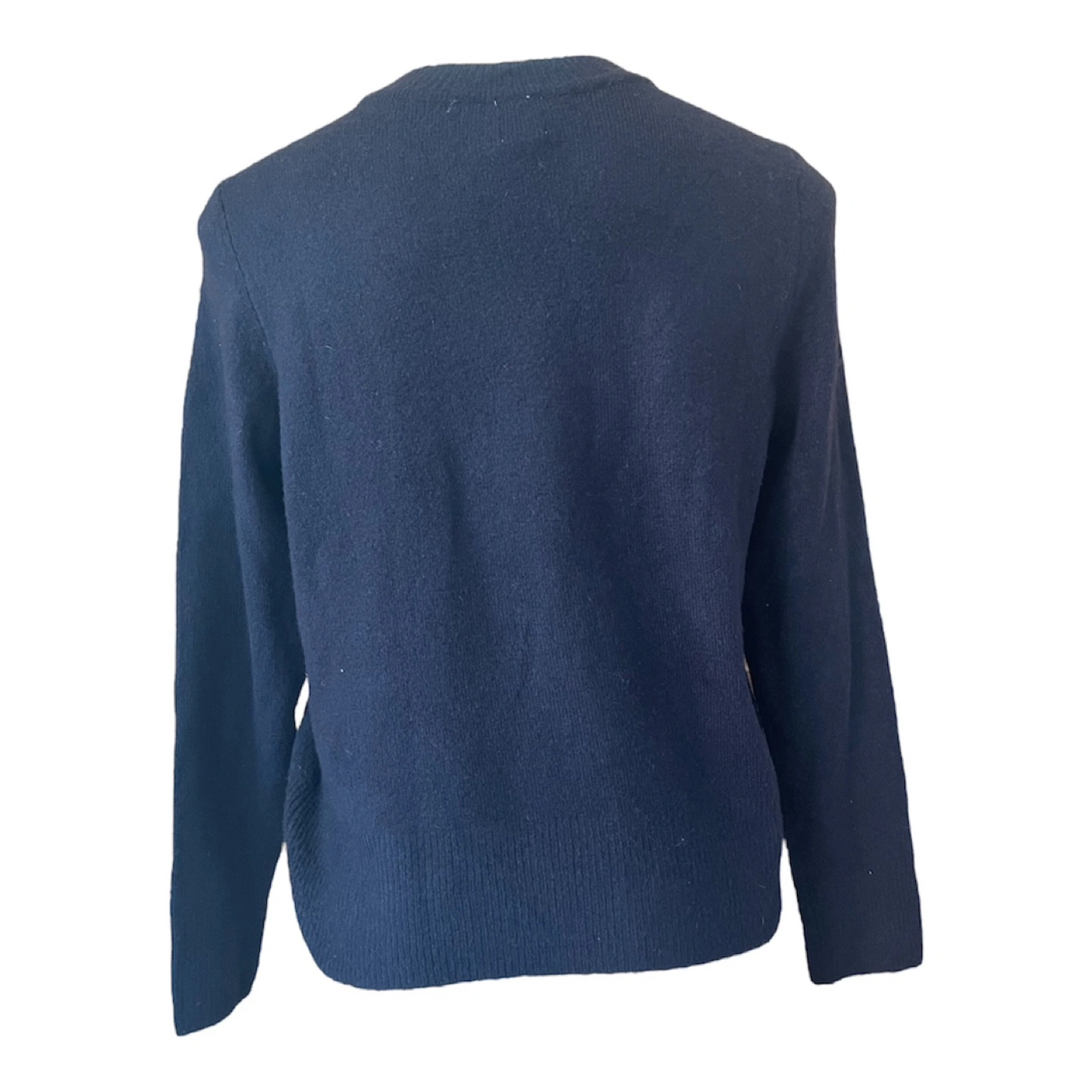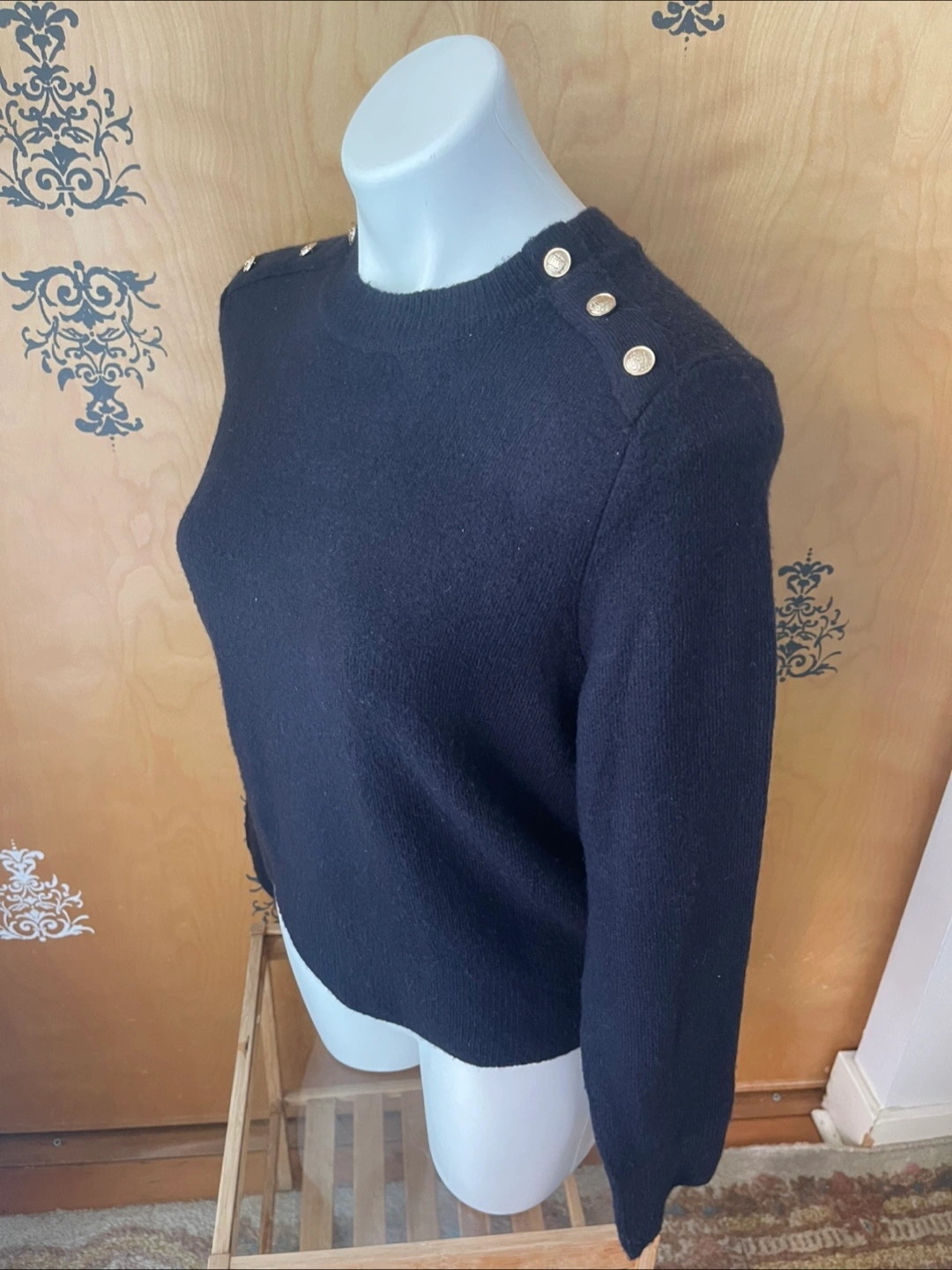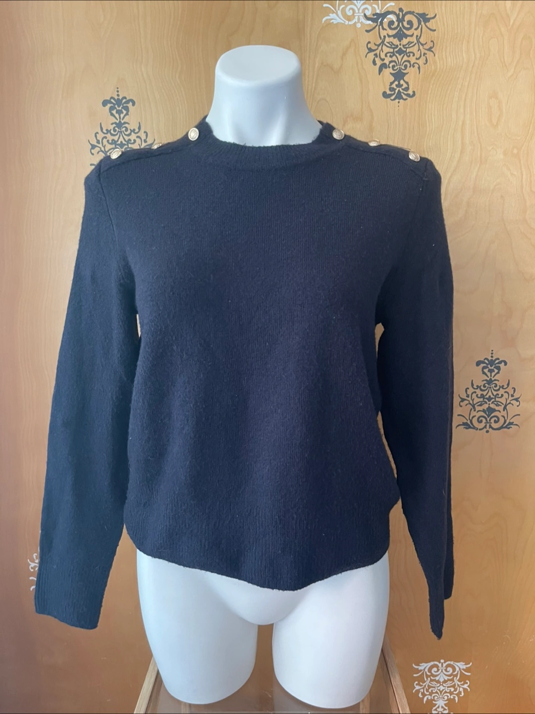 Vintage Y2K 2000s Navy Blue Super Soft Boyfriend Sweater Gold Buttons Shoulder Partial Wool S/M Condition: 10/10. No Stains/Rips/Tears. Measurements (Inches): **Mannequin is overall size medium **Clothing measured on flat surface - ONLY LEFT TO RIGHT - NOT ALL AROUND CIRCUMFERENCE Tag Size: Medium Shoulder to shoulder: 19 Bust: 21 Waist: 20 Hips: 22 Sleeve Length: 24 Armpit Width: 10 Length from shoulder to bottom hem: 21 Style Details: Colour: dark blue Material: Super soft to the skin. Lightweight & warm. 8% Wool/ 50% Polyester/ 38% Acrylic Slight high-neck. Scoop neckline 3 Gold embellishment buttons on each shoulder Long sleeves Slight ribbing at end of sleeves, neckline, & bottom hemline Classic style