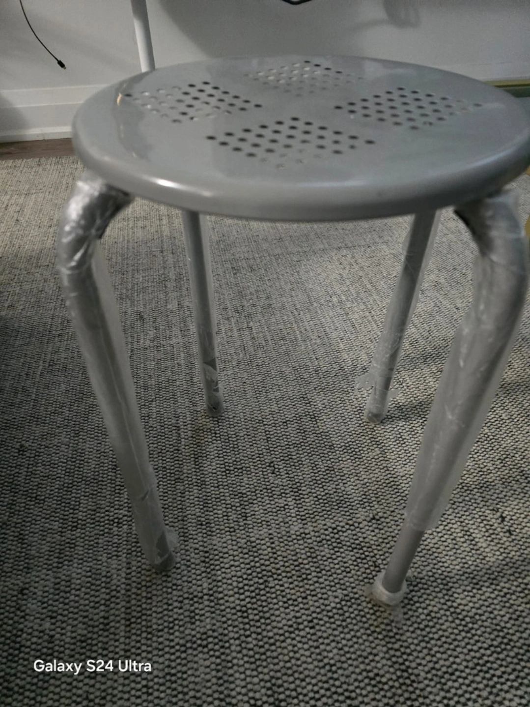 I have a grey metal stool for sale. It's in great condition and ready for a new home! The stool has a round seat with a pattern of holes and four legs. It's perfect for adding extra seating to your kitchen or workspace