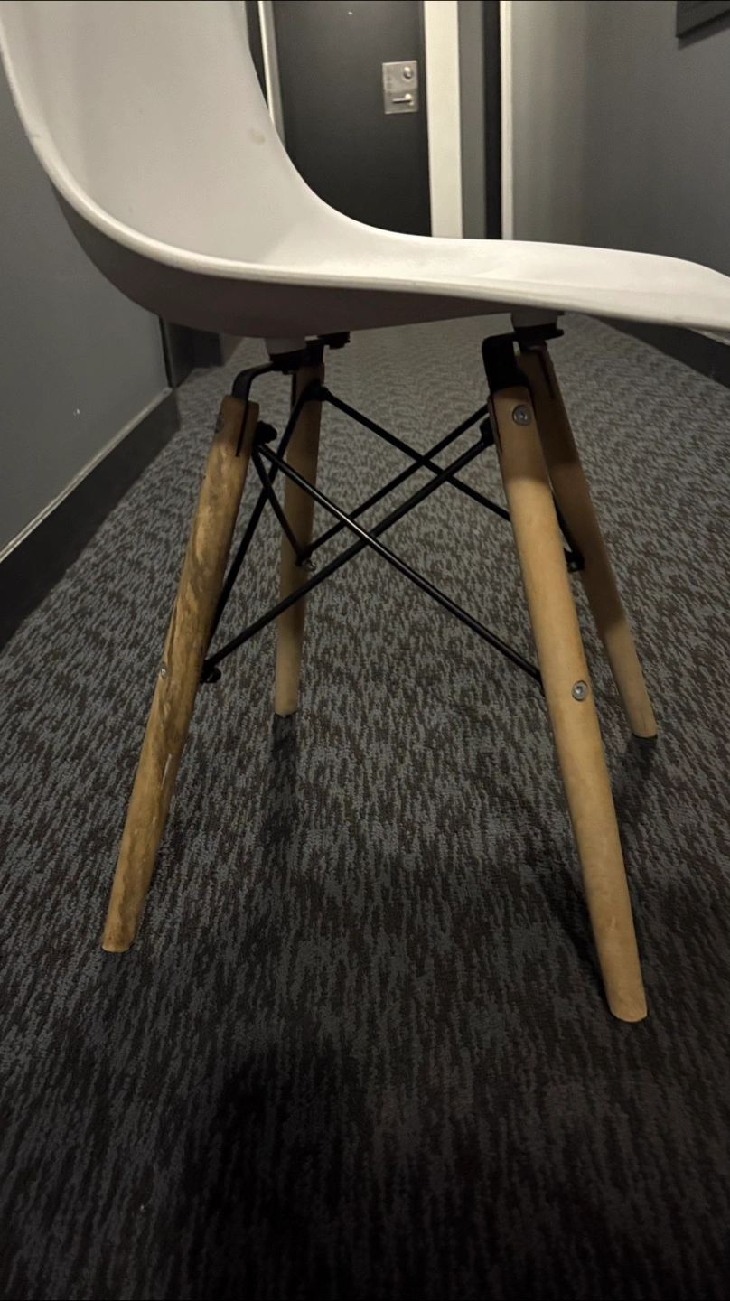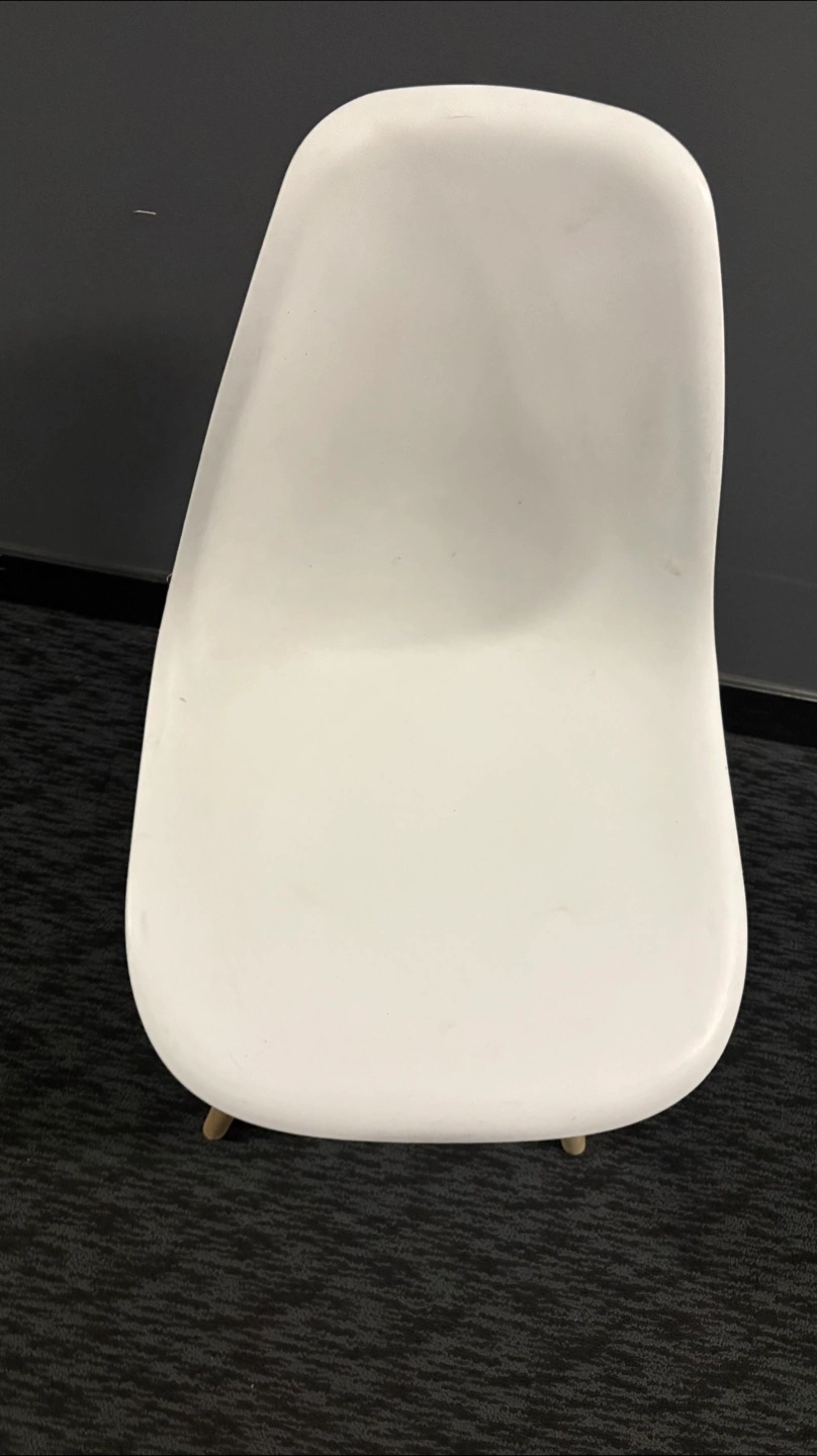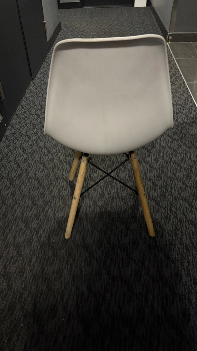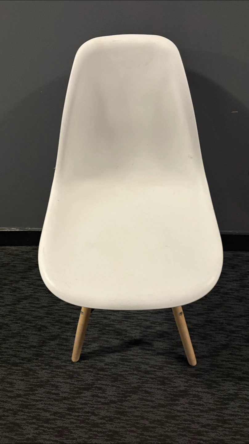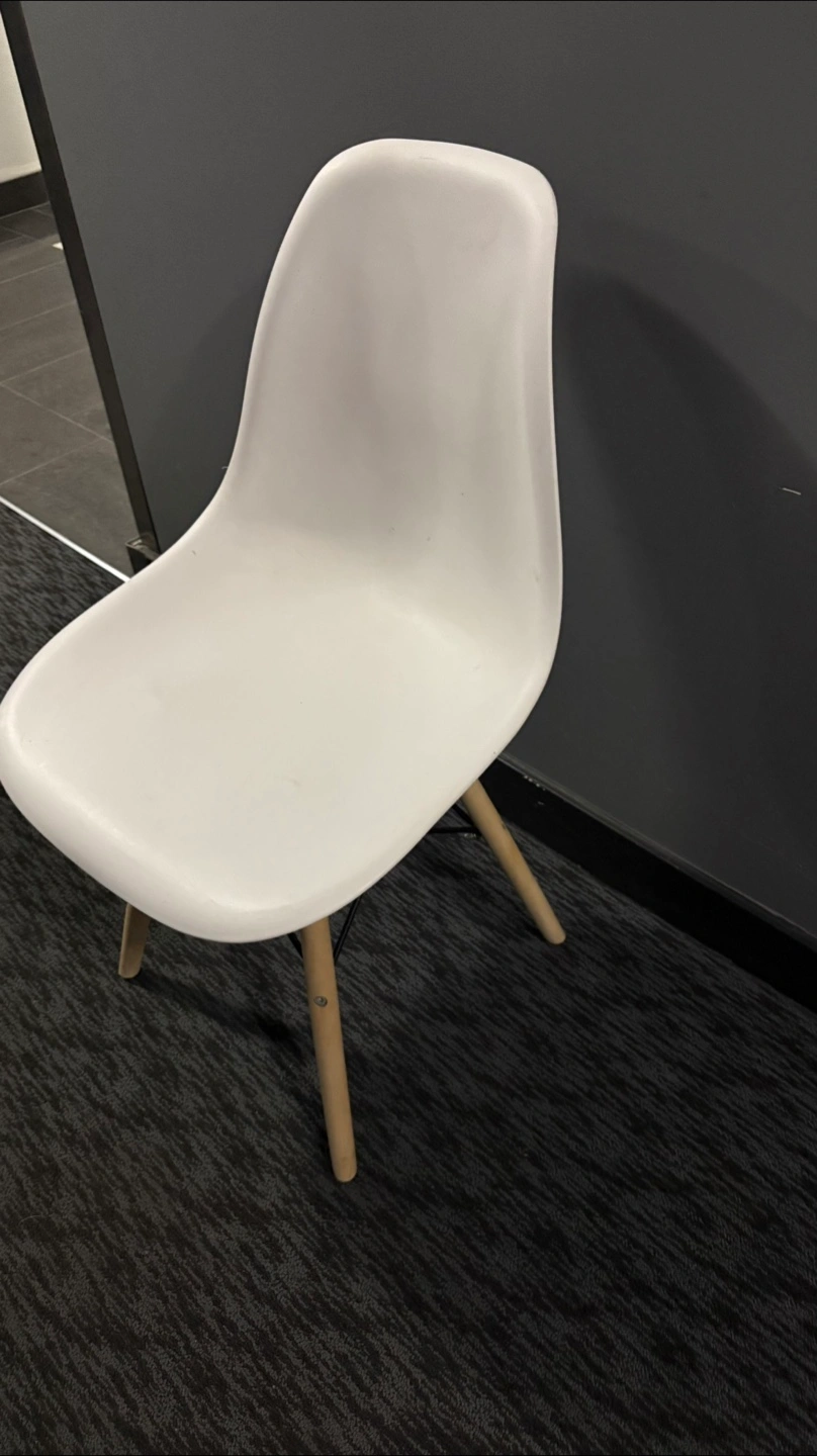 Selling a white Eames style dining chair. It's in good condition and would look great in any home. The chair has a classic design with wooden legs and a comfortable seat. Perfect for your dining room or as an accent chair