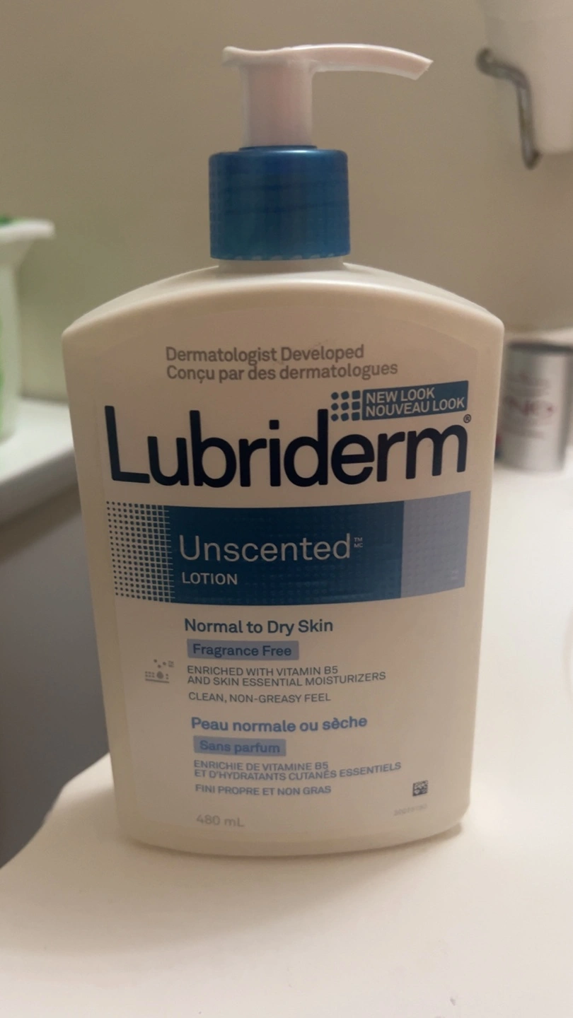 Selling a bottle of Lubriderm Unscented Lotion, perfect for normal to dry skin. It's fragrance-free and enriched. Completely brand new