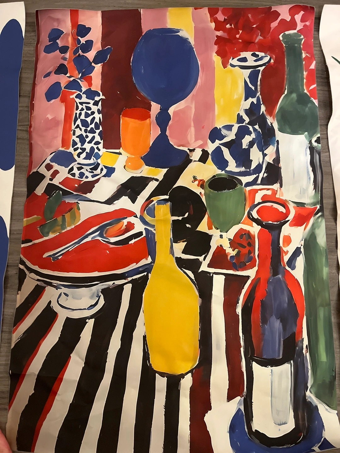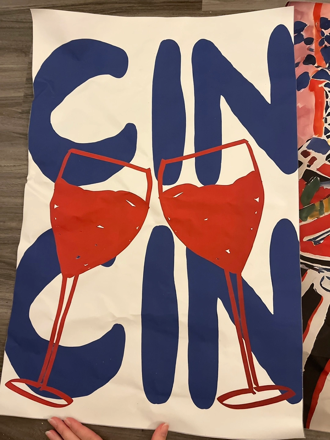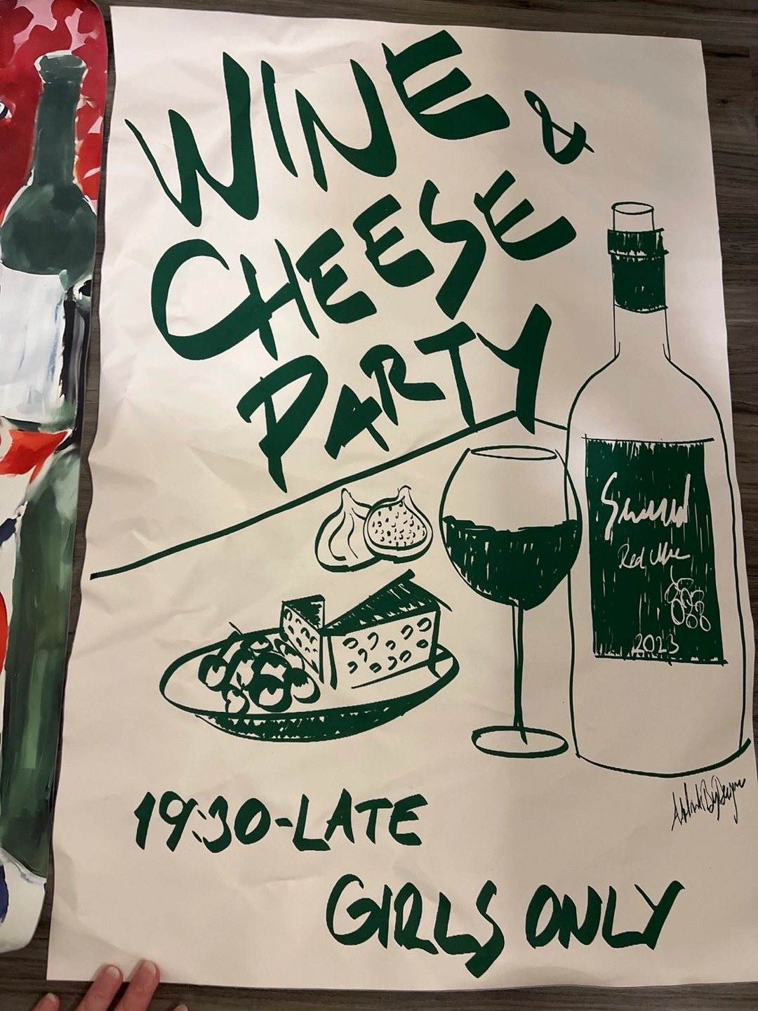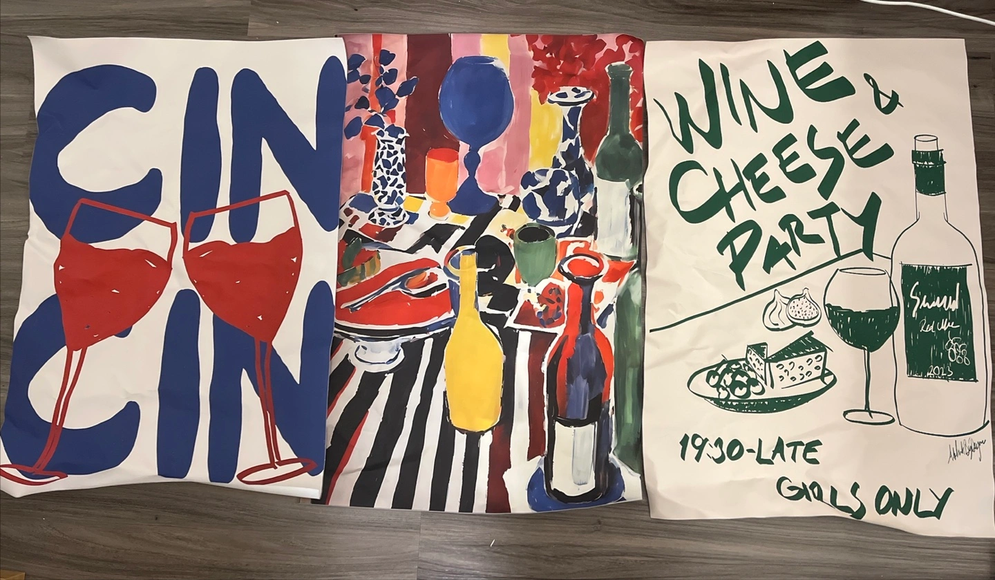 Selling a set of art prints featuring abstract and graphic designs. One features a 'Wine & Cheese Party' theme. Perfect for adding a pop of colour and personality to your space! 15.6 by 23.4 inches 11 for all 3