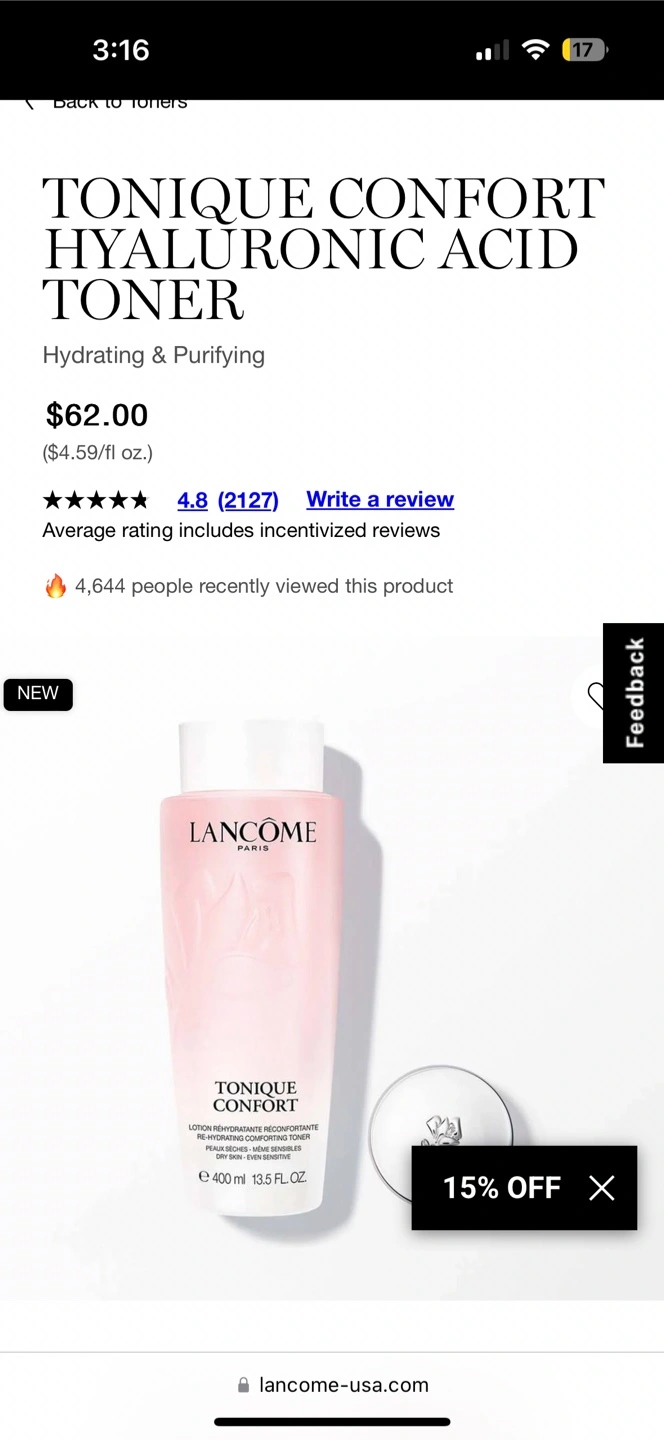Selling a bottle of Lancôme Tonique Confort Hyaluronic Acid Toner. It's a hydrating and purifying toner perfect for sensitive skin. Skin conditioning and rose scented Retails for $62 Like new but I opened it and tested it. This one is the clear bottle and mirror cap version it looks different from the first image From shoppers