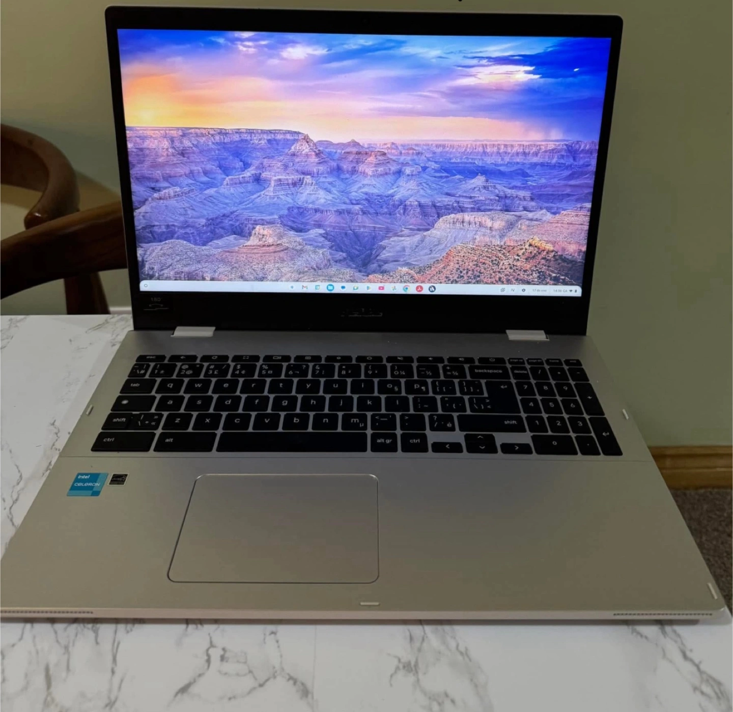 Technical Specifications: • Display: • Size: 15.6” • Resolution: Full HD (1920 x 1080) • Type: Anti-glare • Processor: • Intel Pentium Silver N6000 • Base speed: 1.1 GHz • Turbo speed: up to 3.3 GHz • Cores: 4 • Memory (RAM): • Capacity: 4 GB • Type: LPDDR4X • Storage: • Internal: 64 GB eMMC • Expandable: Supports microSD cards • Operating System: • Chrome OS • Graphics: • Intel UHD Graphics (11th Gen processors) • Connectivity: • Wi-Fi 5 (802.11ac) • Bluetooth 5.0 • Ports: • 2 x USB Type-C (for charging and data transfer) • 1 x USB 3.2 Type-A • 1 x HDMI port • 1 x microSD card reader • 1 x headphone/microphone combo jack • Battery: • Battery life: Up to 12 hours of continuous use • Fast charging (up to 50% in 30 minutes) • Camera: • HD Camera (720p) • Audio: • Stereo speakers • Built-in microphone • Design: • Color: Dark Gray • Material: Durable plastic • Weight: 1.8 kg (3.96 lbs) • Additional Features: • Spill-resistant keyboard • Webcam with privacy shutter • Access to Google Play Store for Android apps Perfect for: • Web browsing • Light productivity tasks • Students, professionals, or personal use • Cloud-based applications and Google Drive access