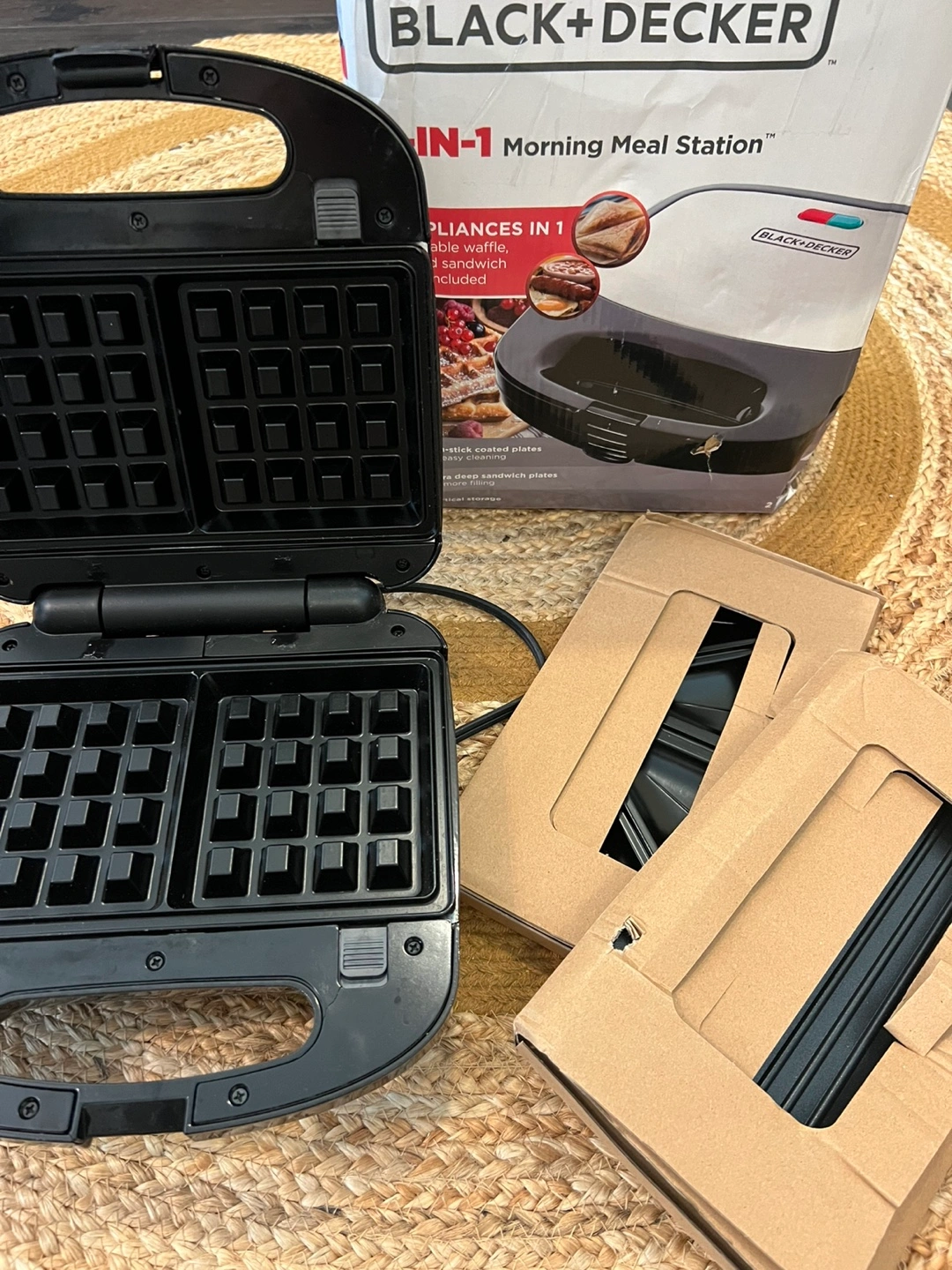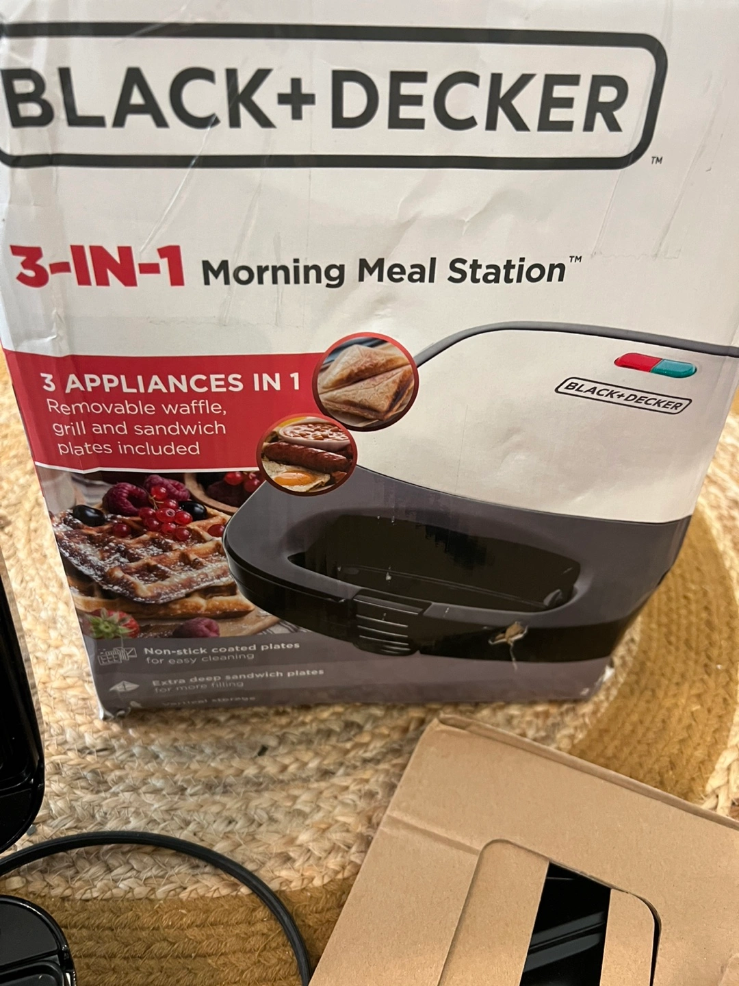 I'm selling a Black+Decker 3-IN-1 Morning Meal Station! It comes with removable waffle, grill, and sandwich plates for easy cleaning. The box is included too, so it's perfect for small kitchens