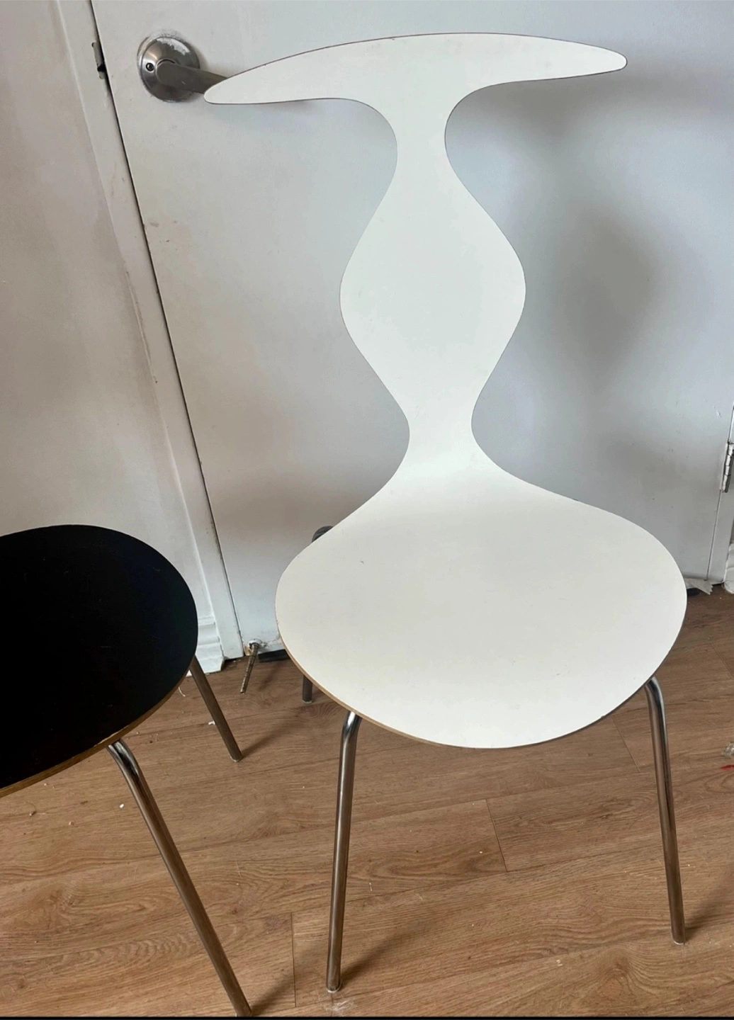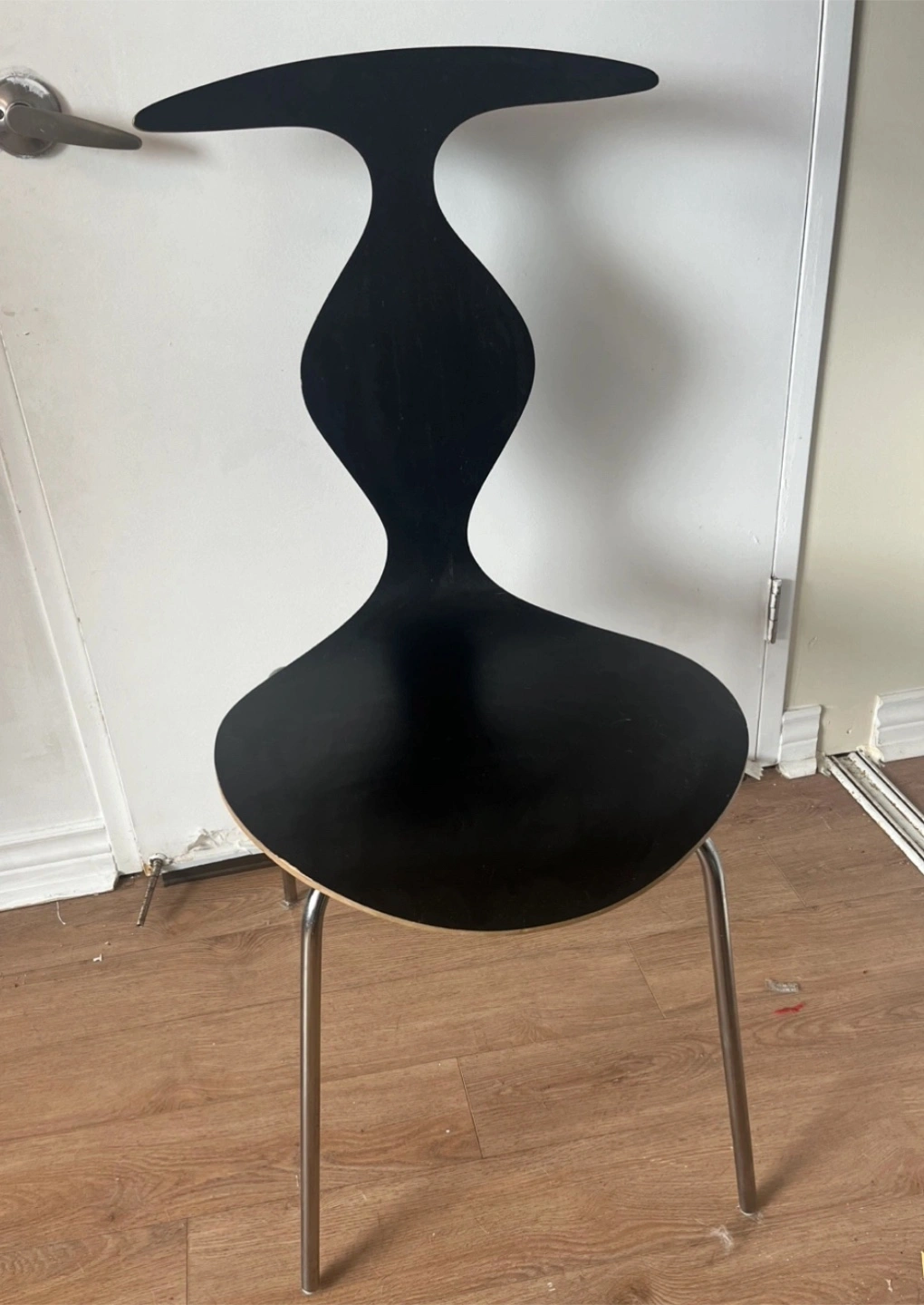 THERE IS ONLY ONE BLACK CHAIR LEFT! Pick up a chair while you can!! Add a touch of vintage flair to your space with this authentic Boris Berlin design chair! Its unique silhouette and sturdy construction make it a standout piece. This chair does show some signs of wear, which only adds to its character. Perfect for photo shoots and movie sets! Here are some details: * **Designer:** Boris Berlin * **Style:** Vintage * **Material:** Wood, Metal * **Colour**: Black and Chrome Based on similar listings on Kijiji, these chairs typically sell between $150 and $300, making it a great deal for a design enthusiast. If you're seeing this ad, the chair is still available. Don't miss out on this opportunity to own a piece of design history! I have two white and two black Chairs. Pickup Downtown and Cash only!