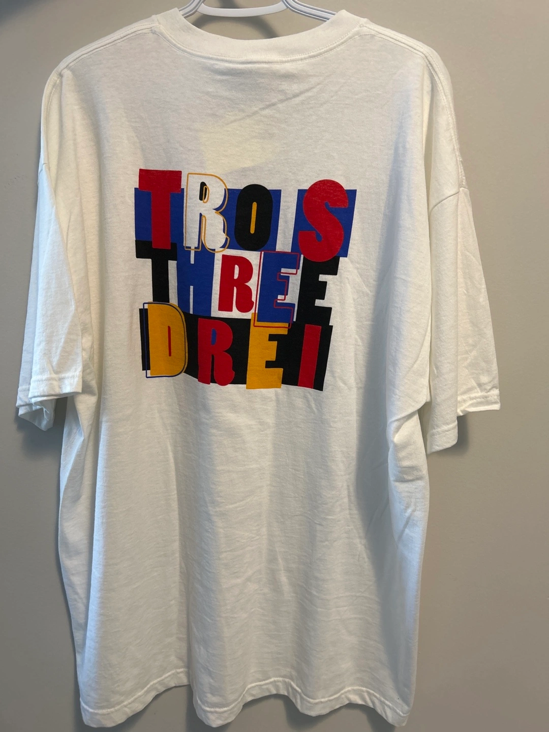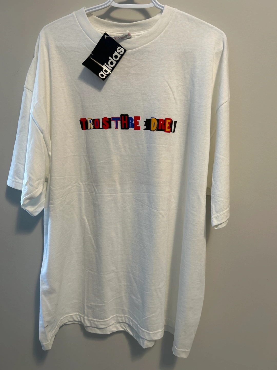 Adidas white tee with 'Trust Three Drei' graphic on the front and back. It's in brand new with tags