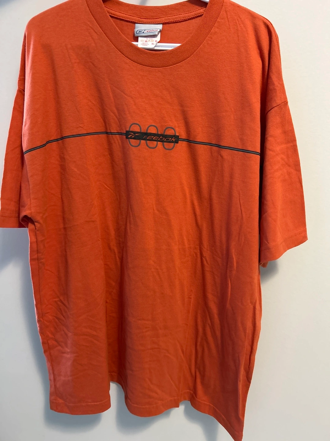 Selling a Reebok orange t-shirt in size XL. It has a unique design on the front. The shirt is brand new!