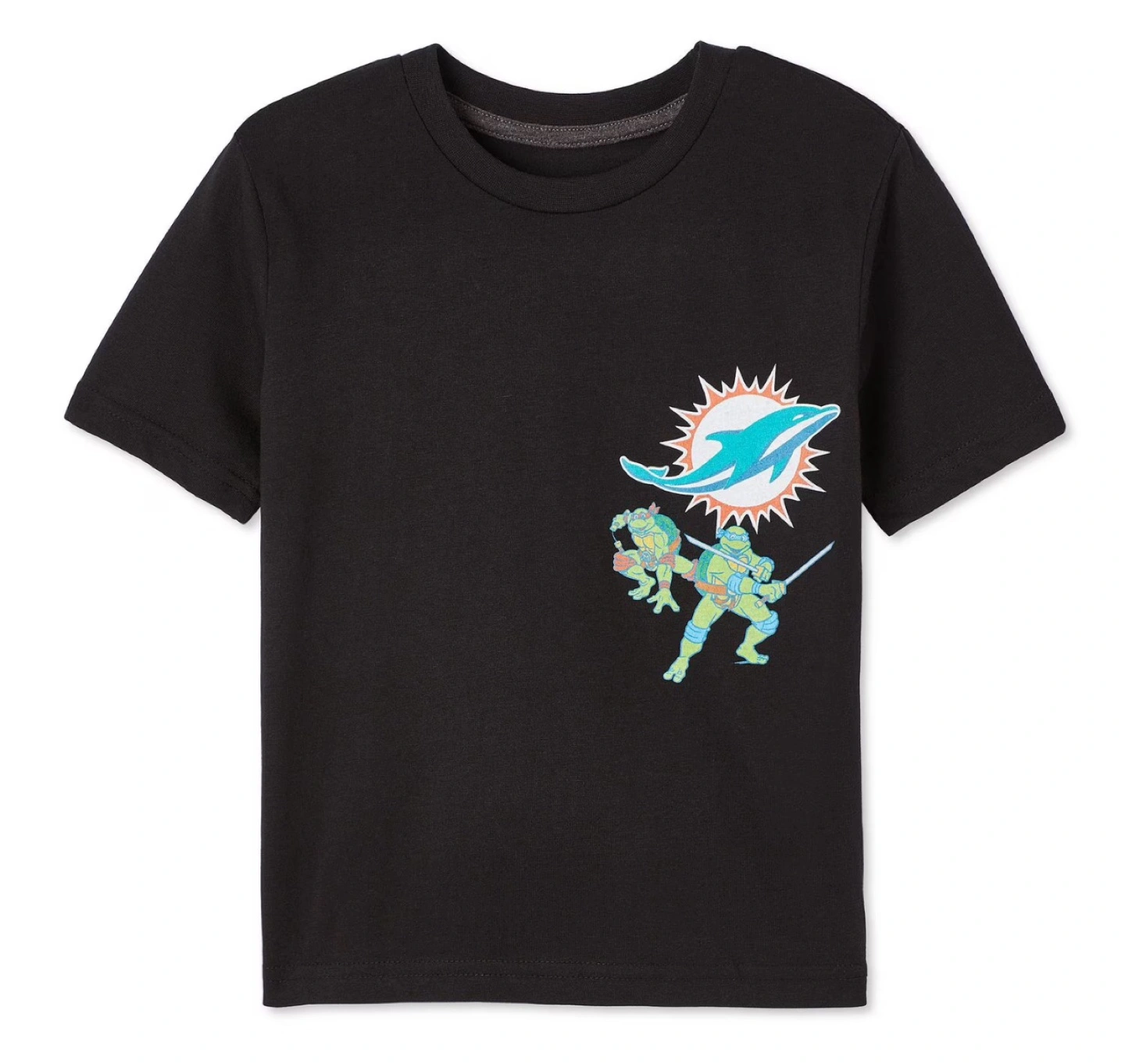This is a super cool Teenage Mutant Ninja Turtles and NFL Miami Dolphins collaboration tee. It's a size XS (4-5) and made of 100% cotton