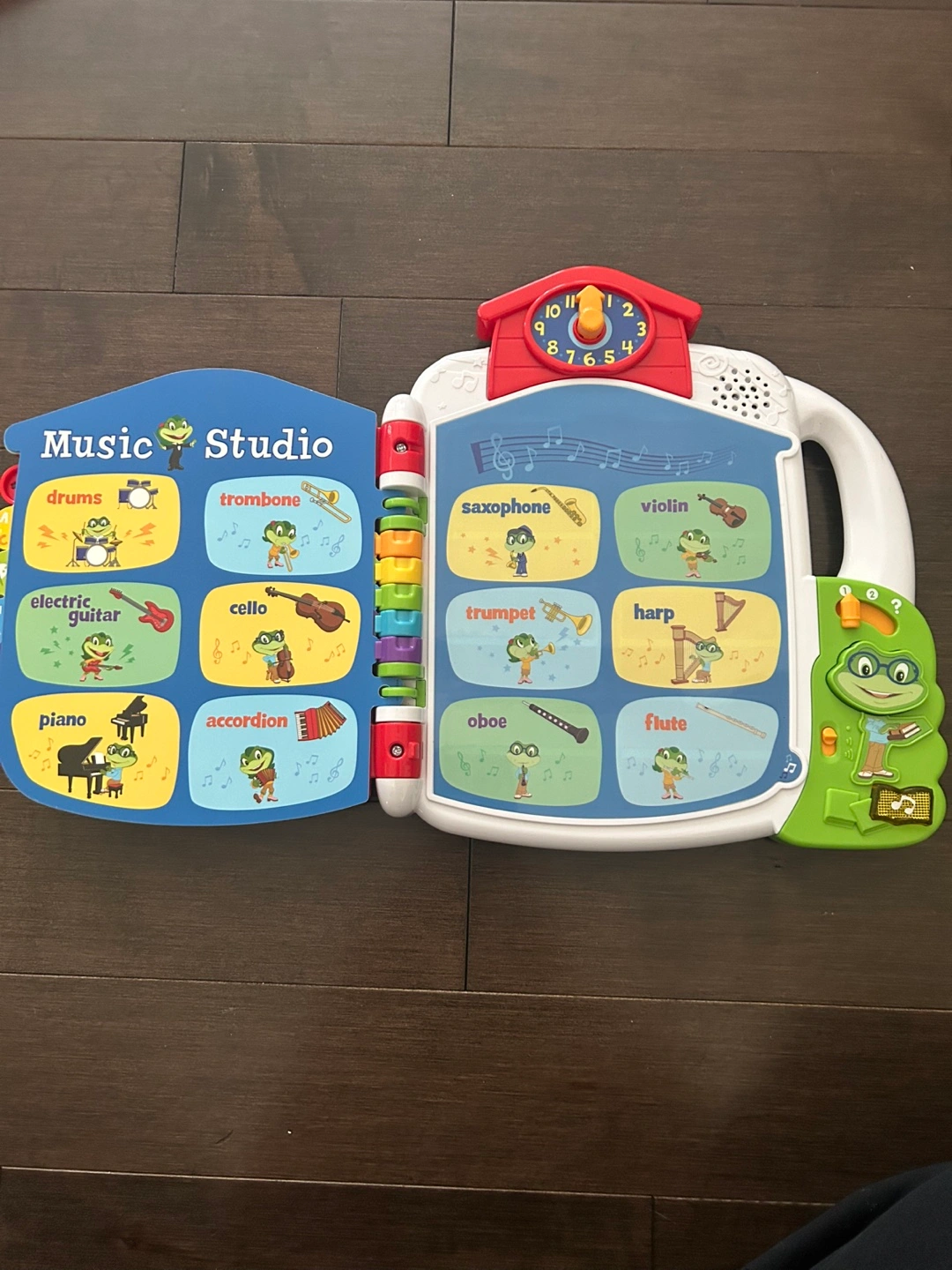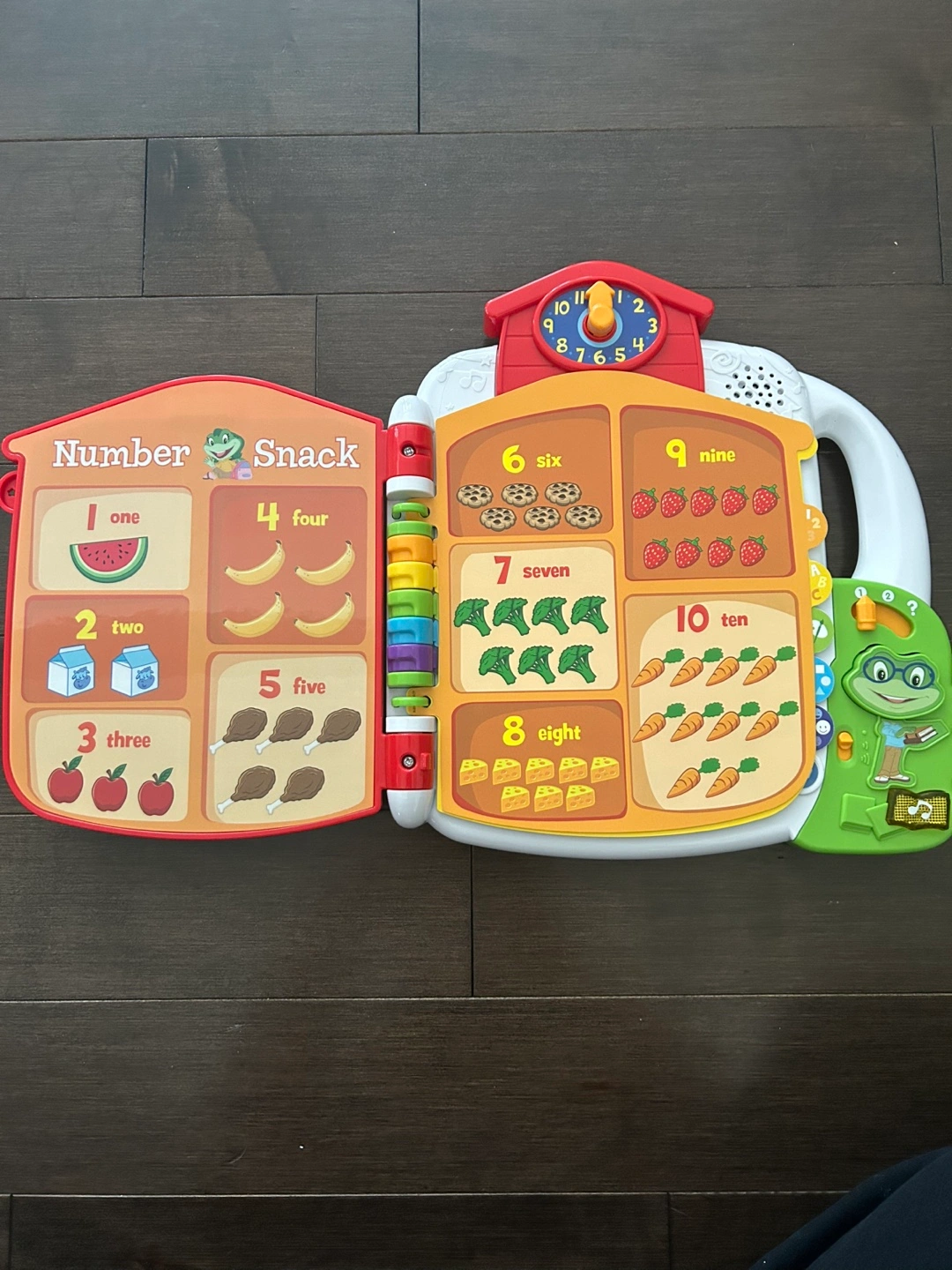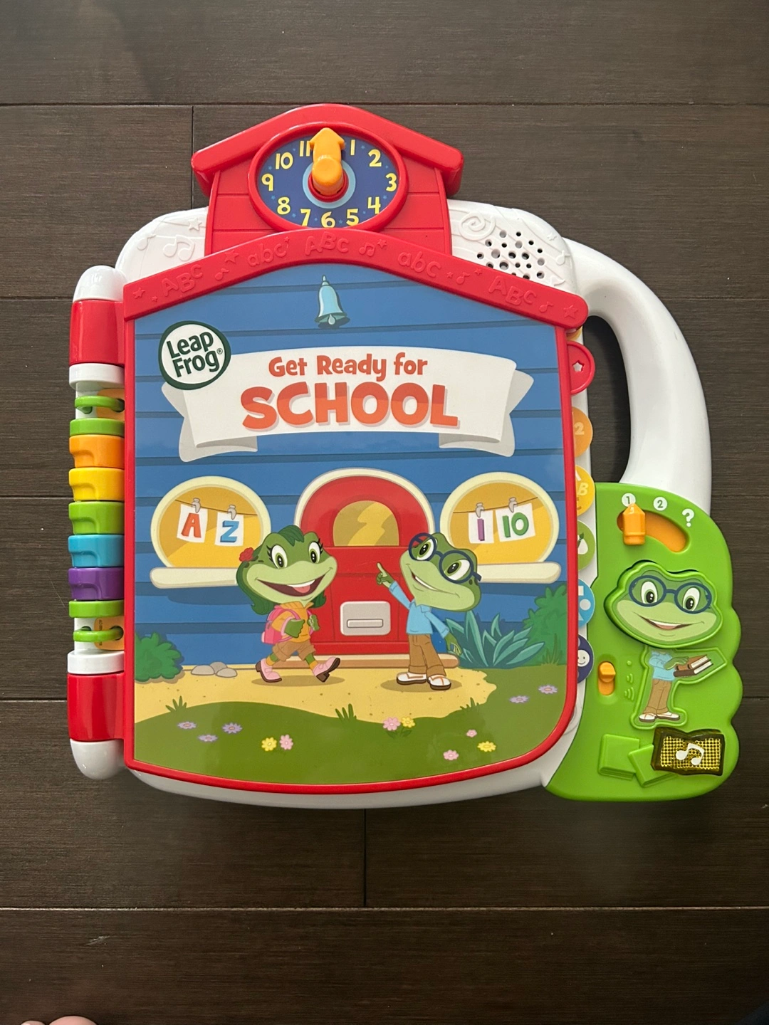 LeapFrog Tad's Get Ready for School Book™ - English Version A fun interactive book from LeapFrog! It teaches: - Alphabet - Shapes - Numbers - Animals & Colors - regular price at store $23.98 It's in great condition (batteries still work) and ready for a new home! It’s time to get ready for school with Tad’s Get Ready for School Book™. This book contains 12 pages of interactive learning and introduces ABCs, numbers 1-10, colors, animals, shapes, emotions, music and more. Touch the pictures on each page and the book will come to life with learning phrases and sounds. Press the music button to hear six learning songs and watch the light flash along. Then, practice telling time by turning the hour hand on the clock.