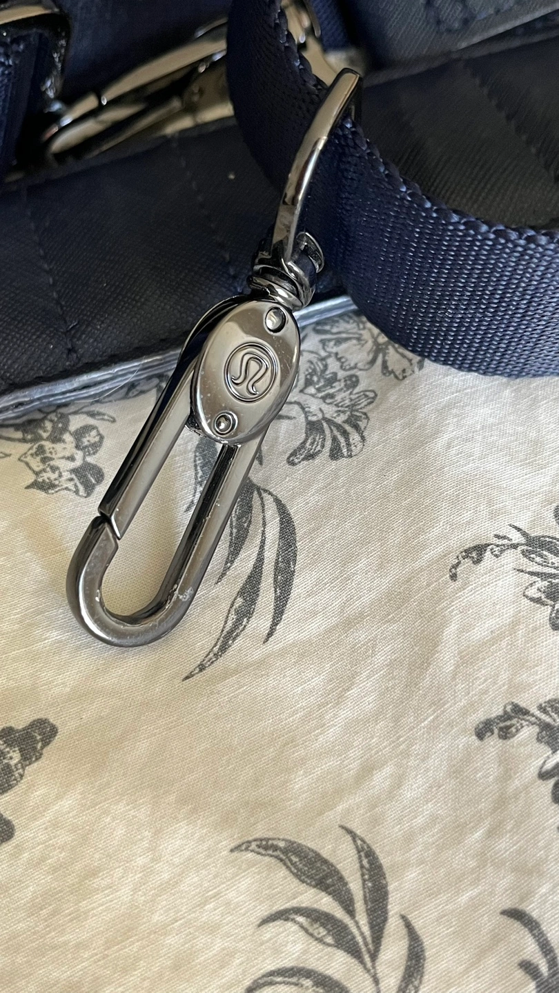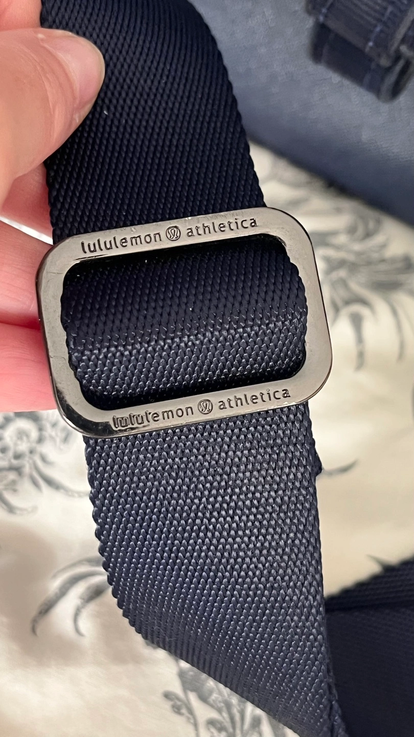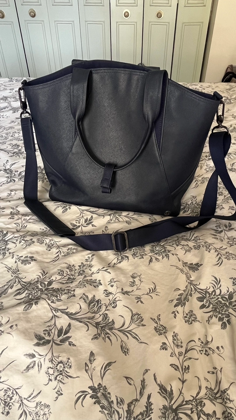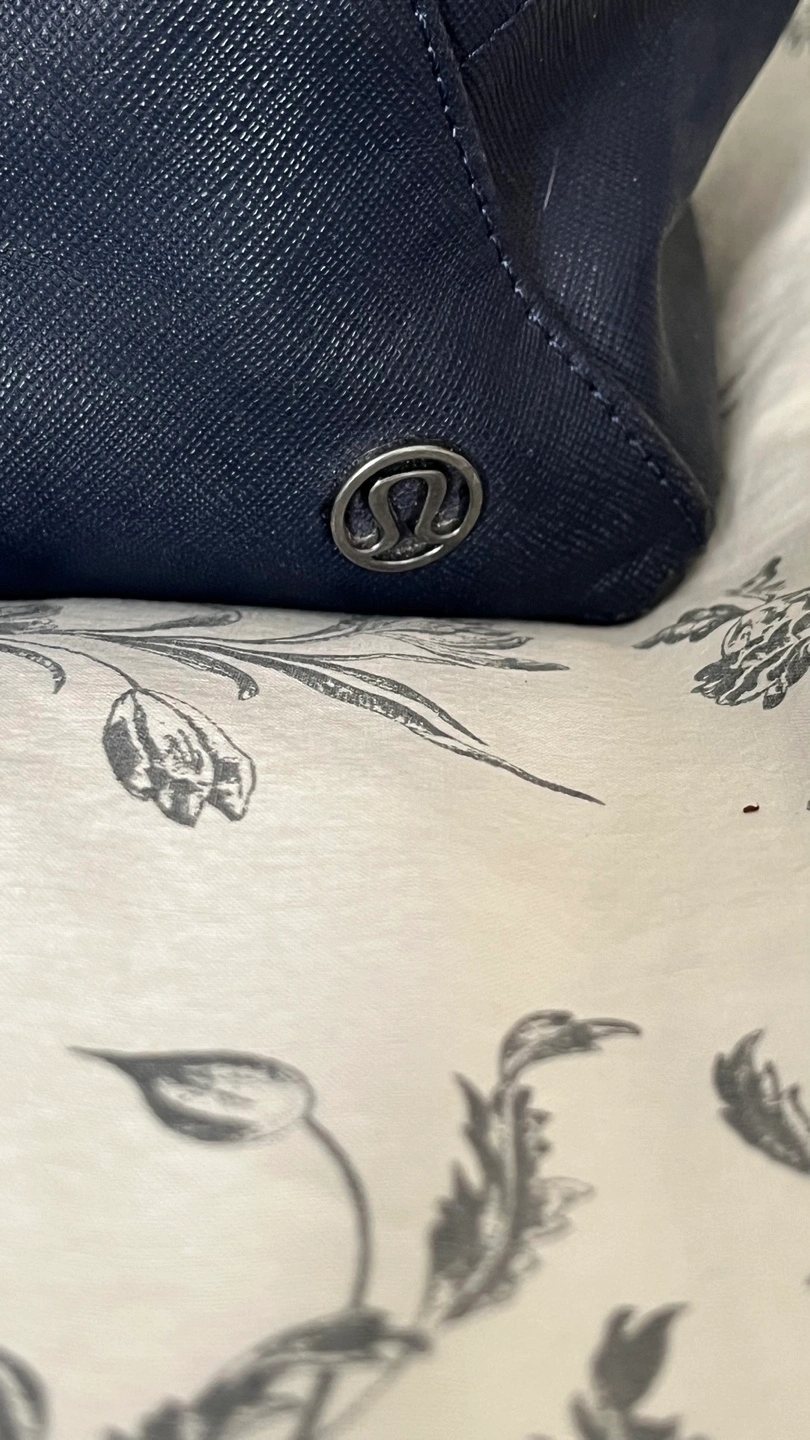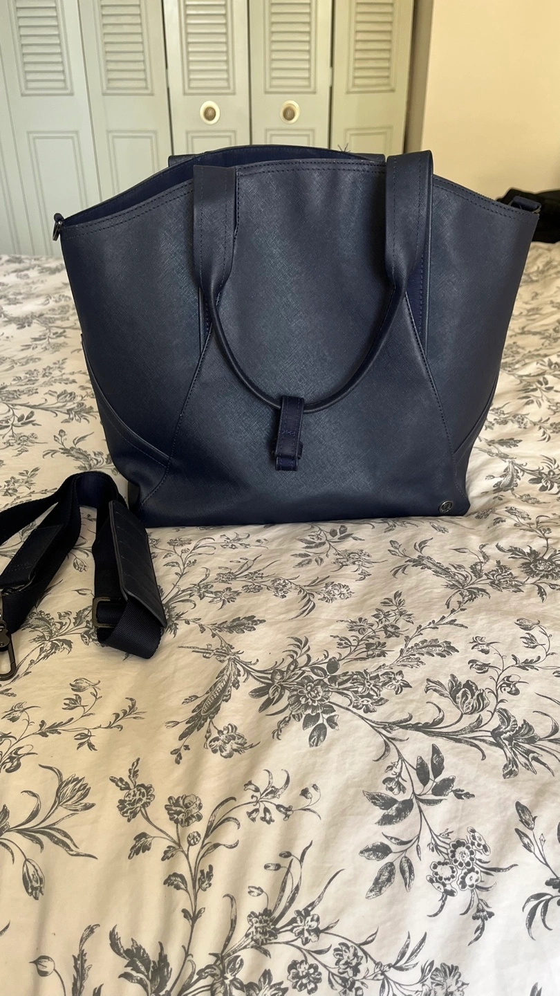 This is a Lululemon tote bag in navy blue. It comes with a detachable shoulder strap. The interior tag reads 'happiness is right here'