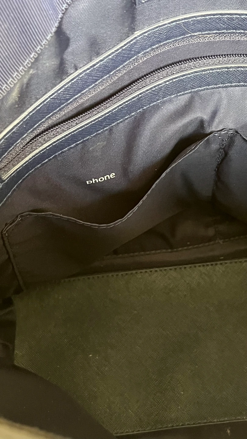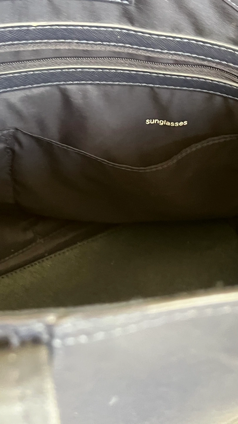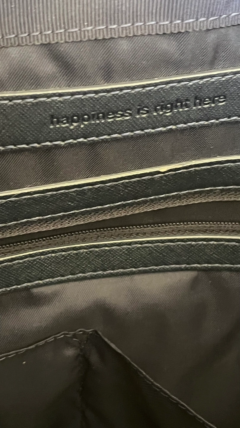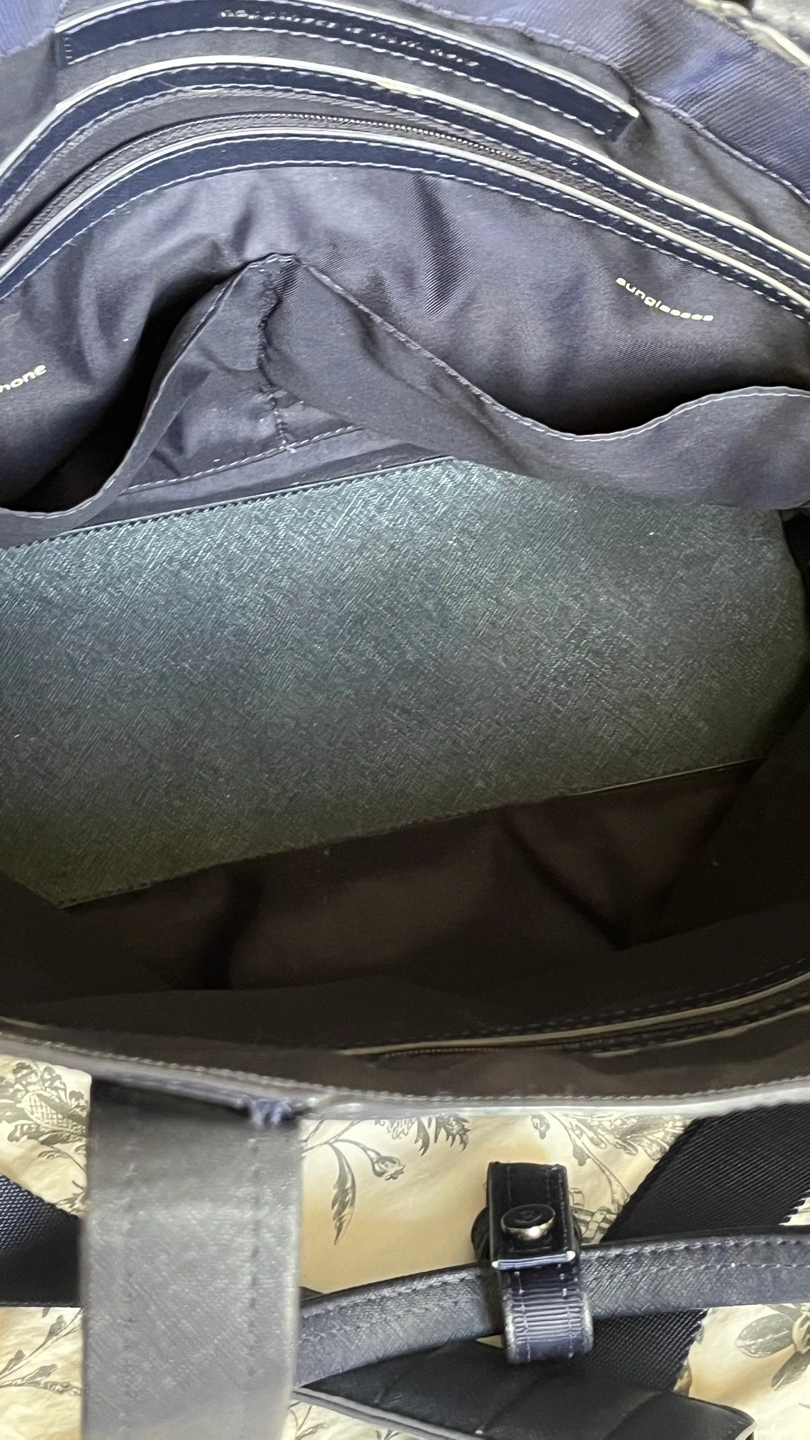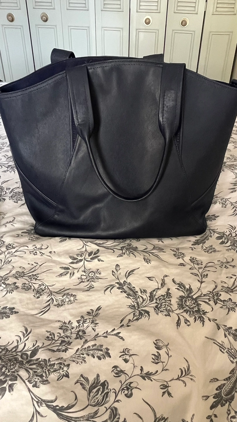This is a Lululemon tote bag in navy blue. It comes with a detachable shoulder strap. The interior tag reads 'happiness is right here'