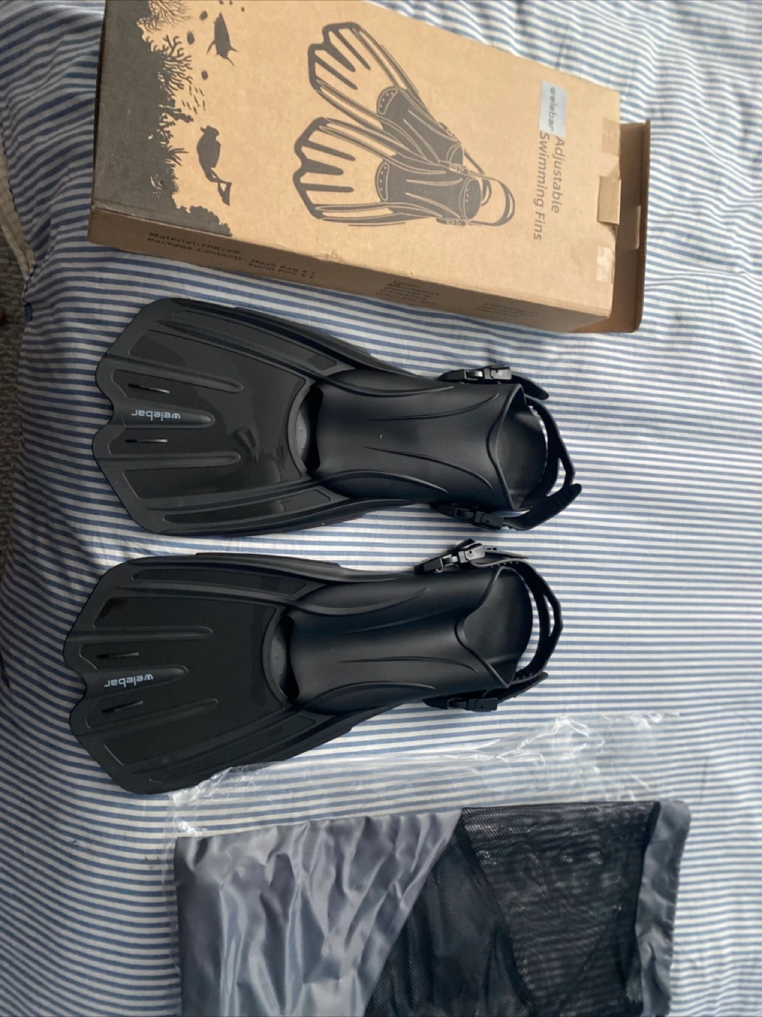 Selling a pair of new Welebar adjustable swimming fins! They're in great shape and come with their original box and a handy mesh bag. The size is M/L, which fits US sizes 8.5/11 or EU sizes 42-47. Perfect for your next swim or for snorkeling .