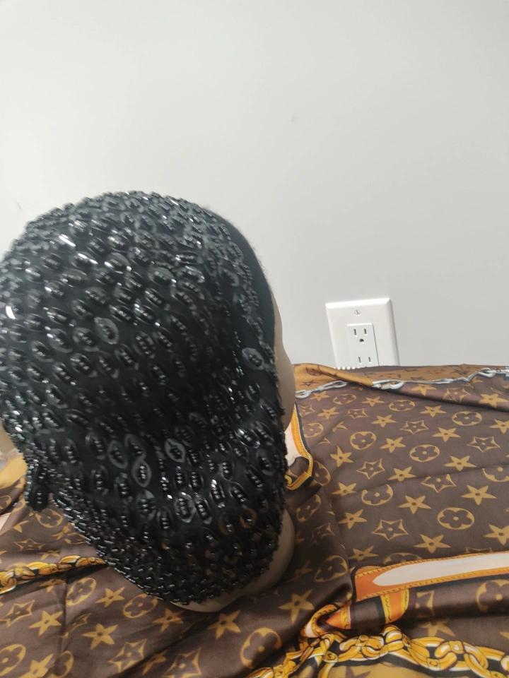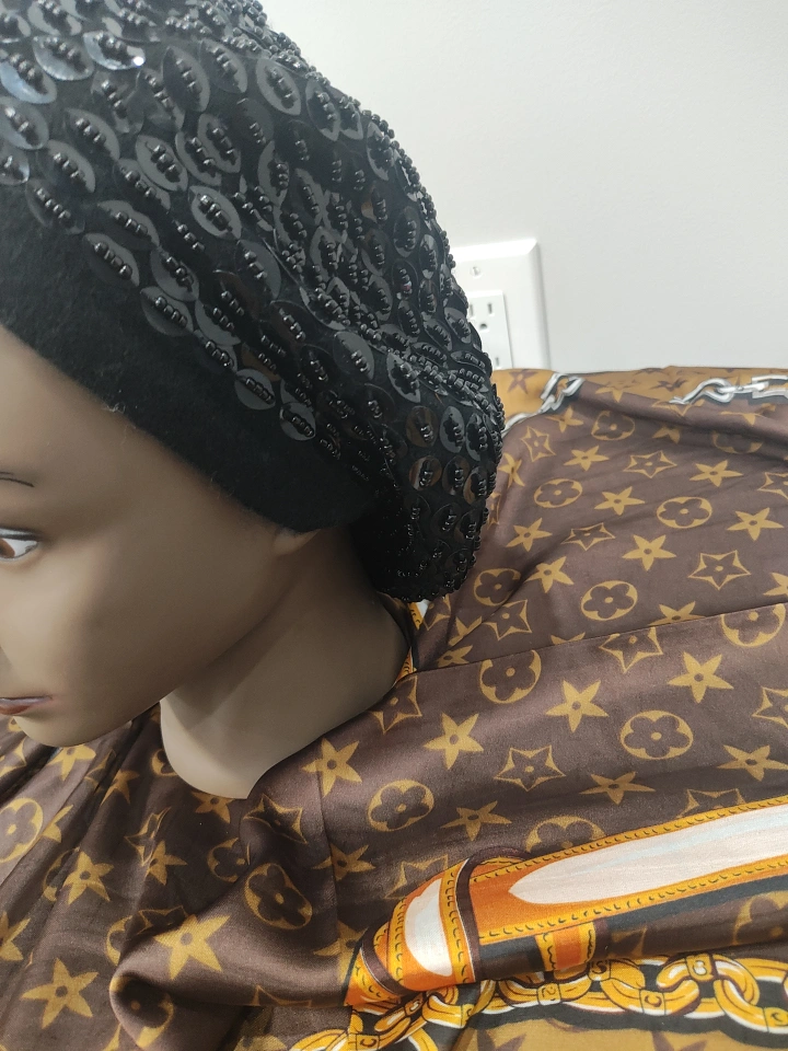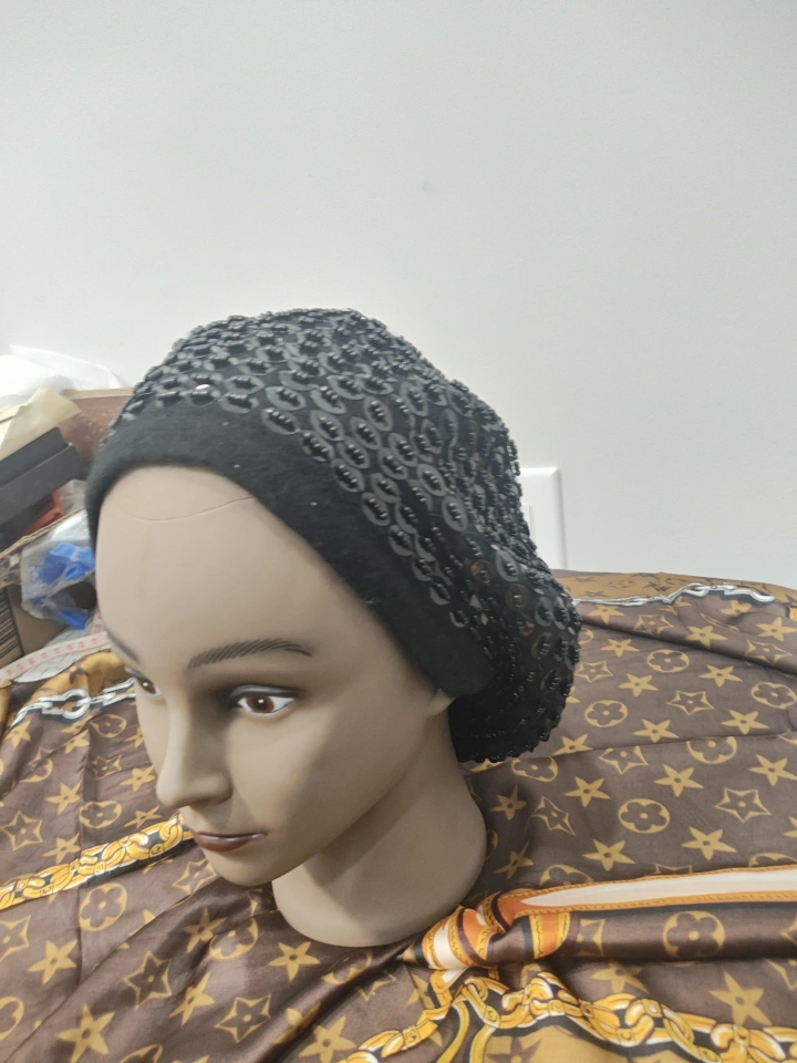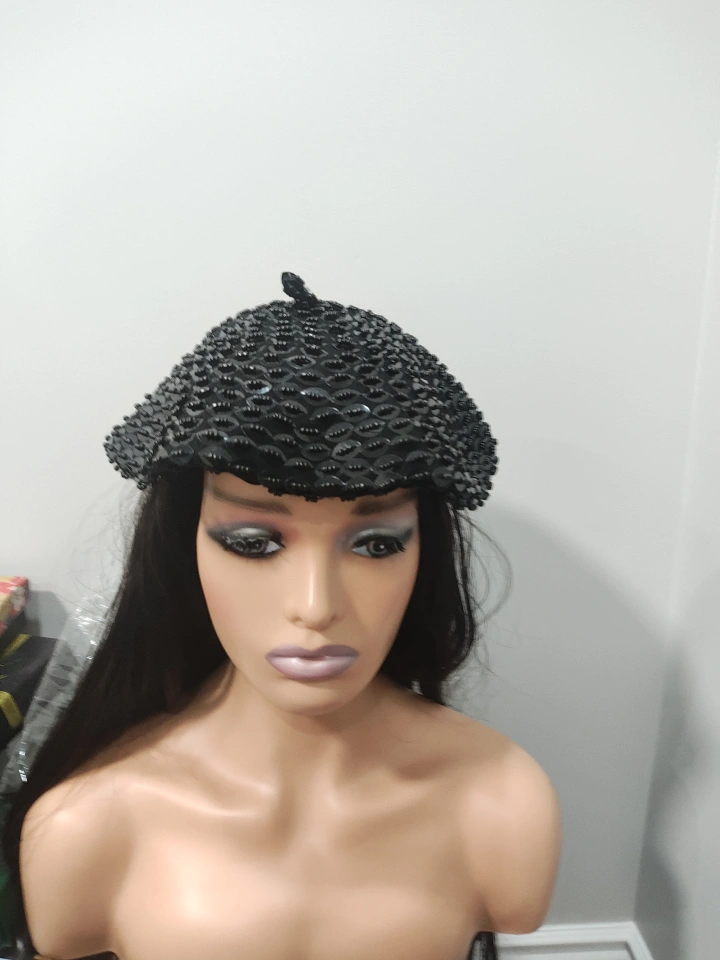 A stylish black beret hat, adorned with beads for a unique look. Perfect for adding a touch of elegance to any outfit!